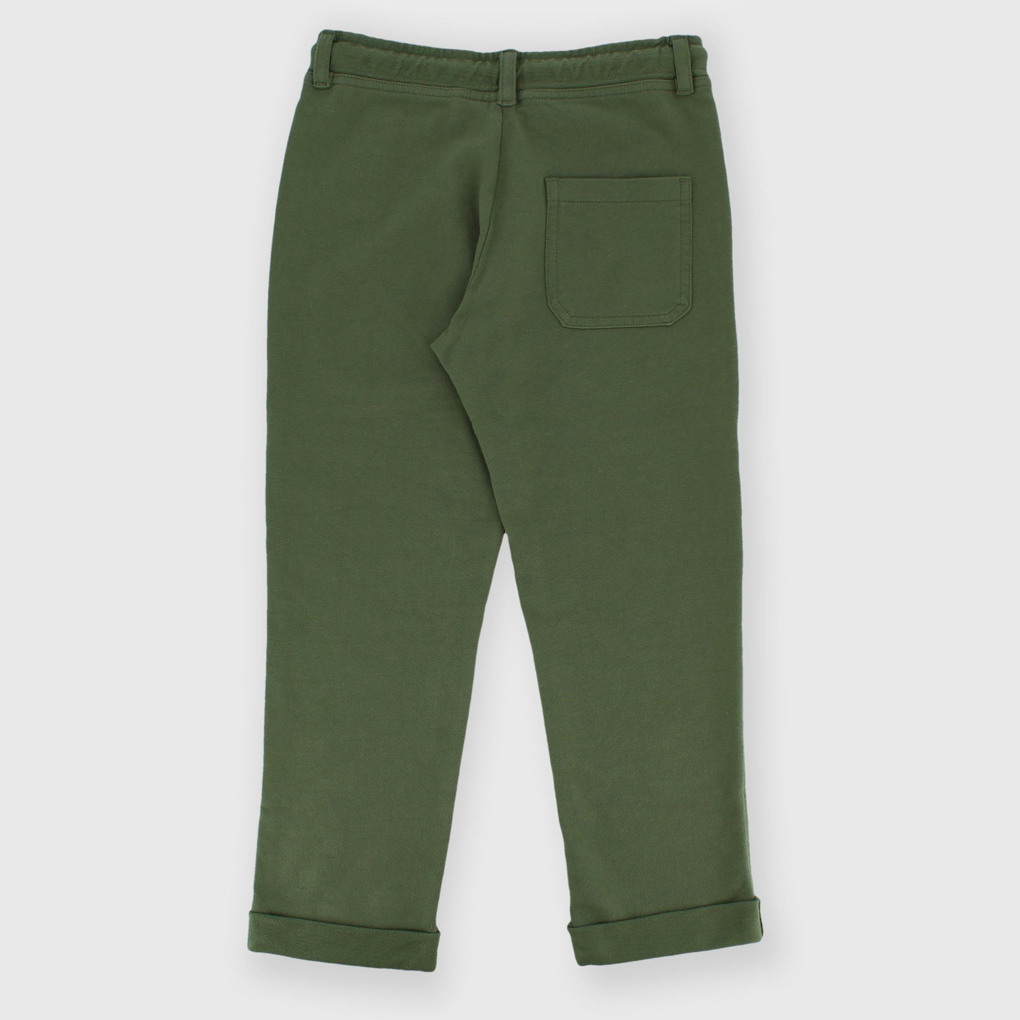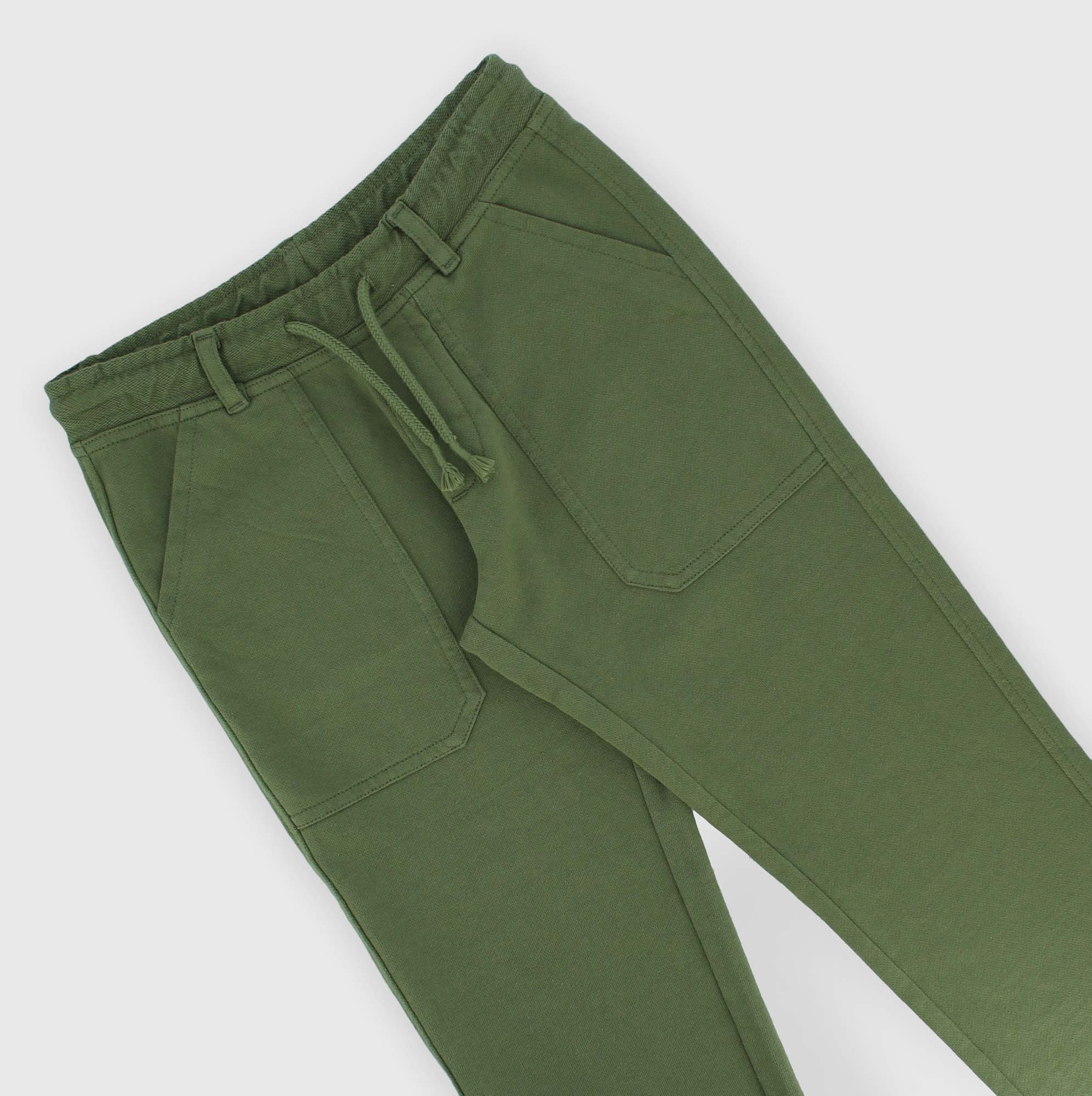 Pantalon en molleton teint en pièce avec taille élastique, lacet devant et passants. Poches devant et poches appliquées derrière. Fond avec rabat.