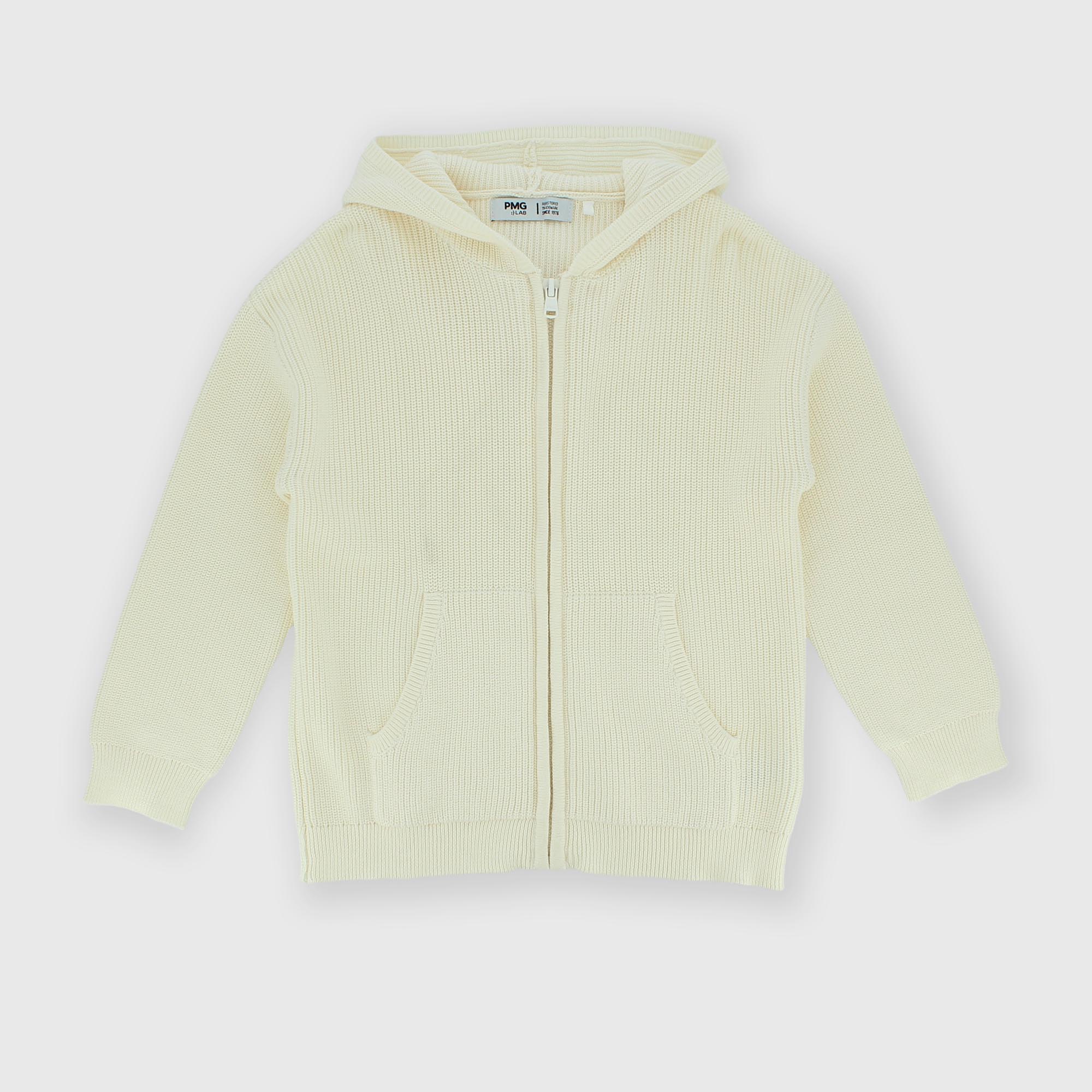 Cardigan en coton souple tricoté avec capuchon. Fermeture avant avec zip. Poche appliquée.