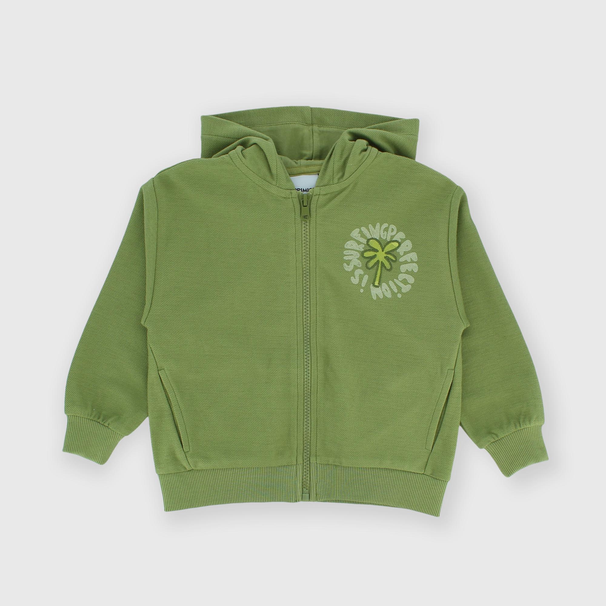 Sweat-shirt ouvert avec capuchon. Fermeture avec zip devant. Poche cachée. Imprimé avec broderie sur poitrine. Poignets et bas côtelés.