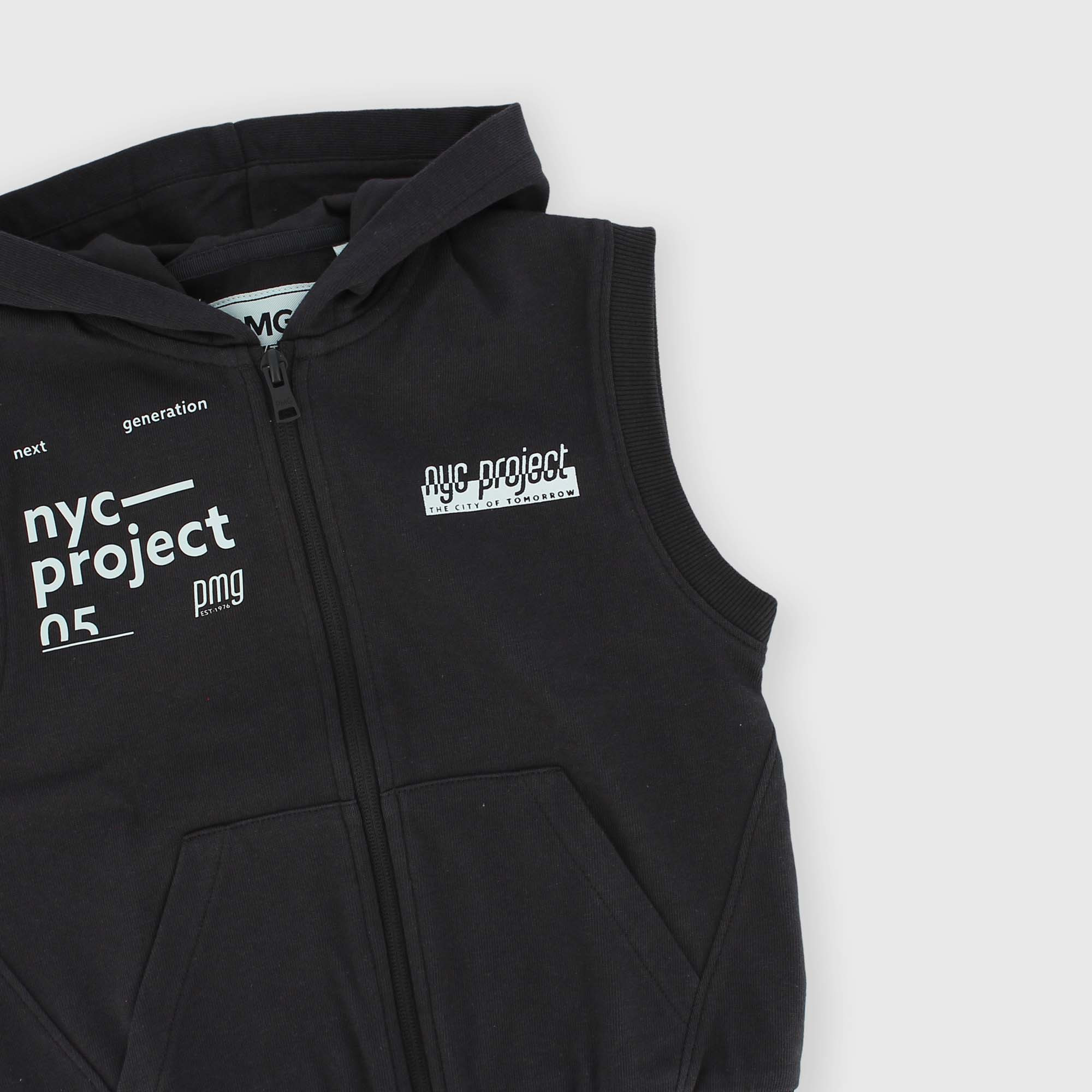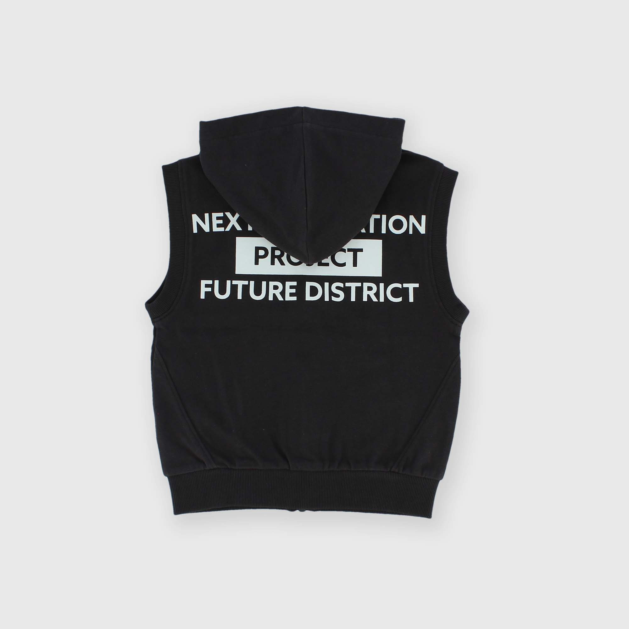 Gilet ouvert en Jersey lourd avec capuchon. Fermeture devant avec zip à contraste. Poche appliquée devant. Lettrage imprimé devant et derrière. Fond côtelé.
