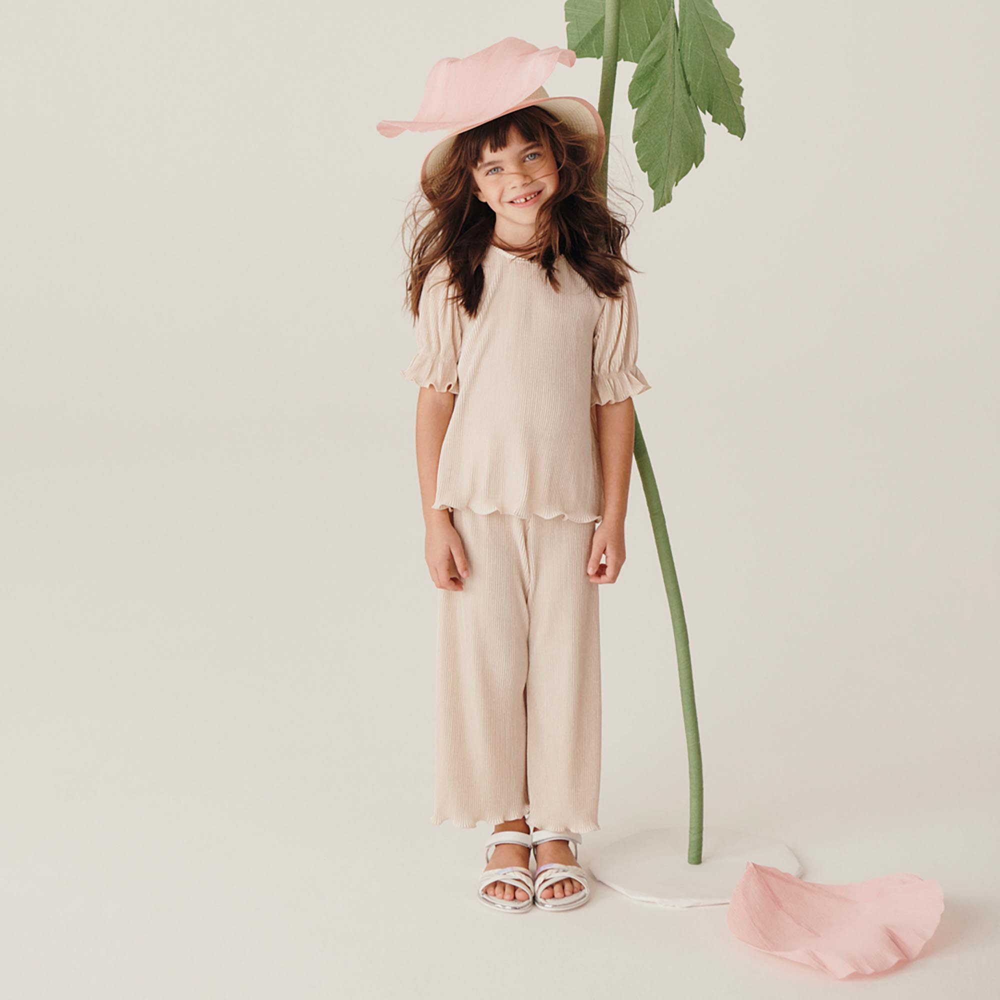 Complet plissé composé de deux pièces. Blouse col-rond avec manches courtes. Fermeture avec bouton derrière. Pantalon wide leg avec taille élastique.