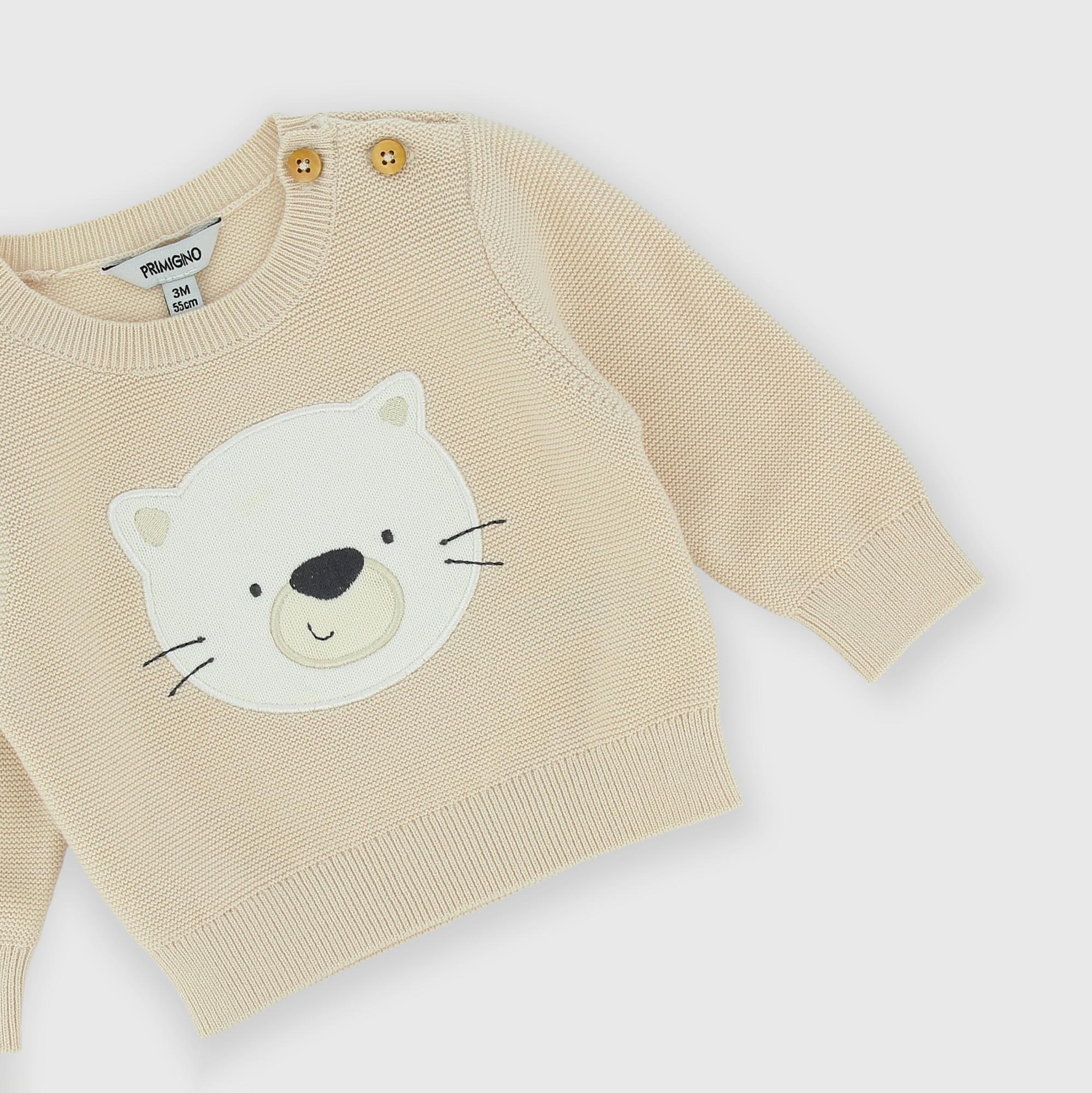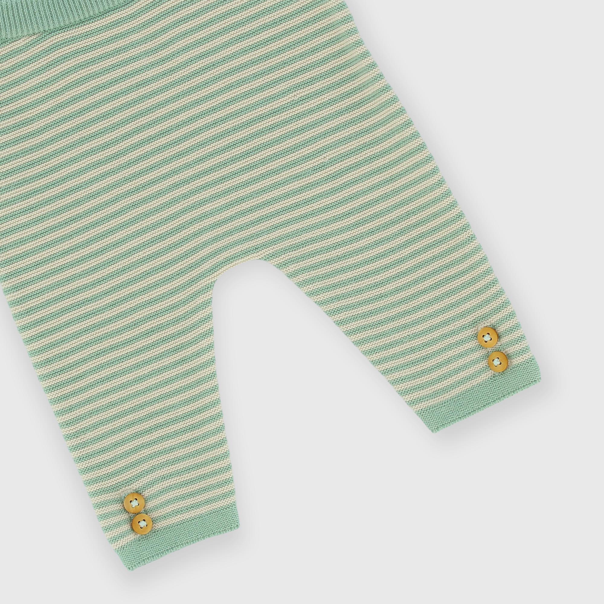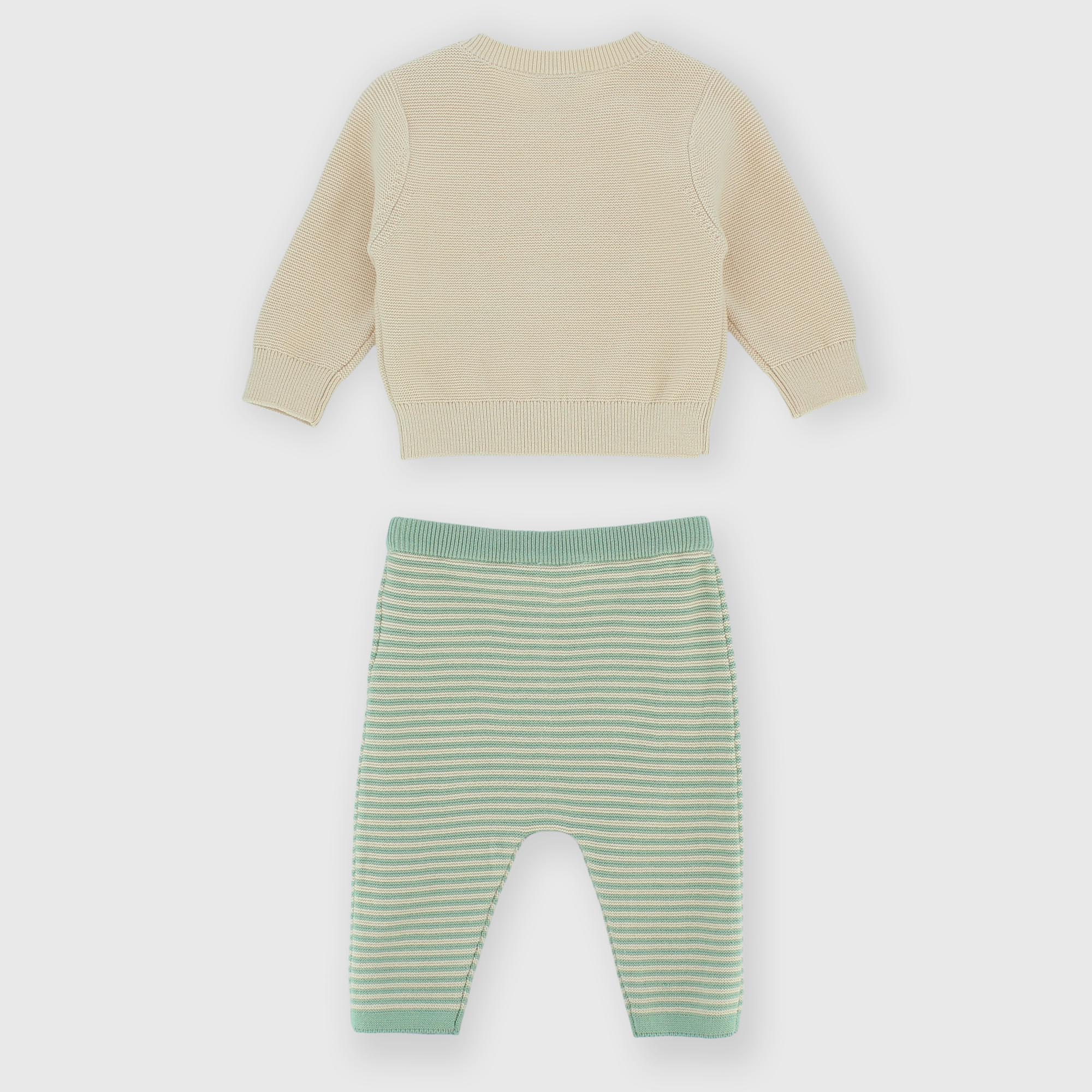 Complet en coton doux composé de deux pièces. Pull manches longues et fermeture sur l'épaule. Patch devant. Pantalon à rayures, taille élastique et boutons en bas.