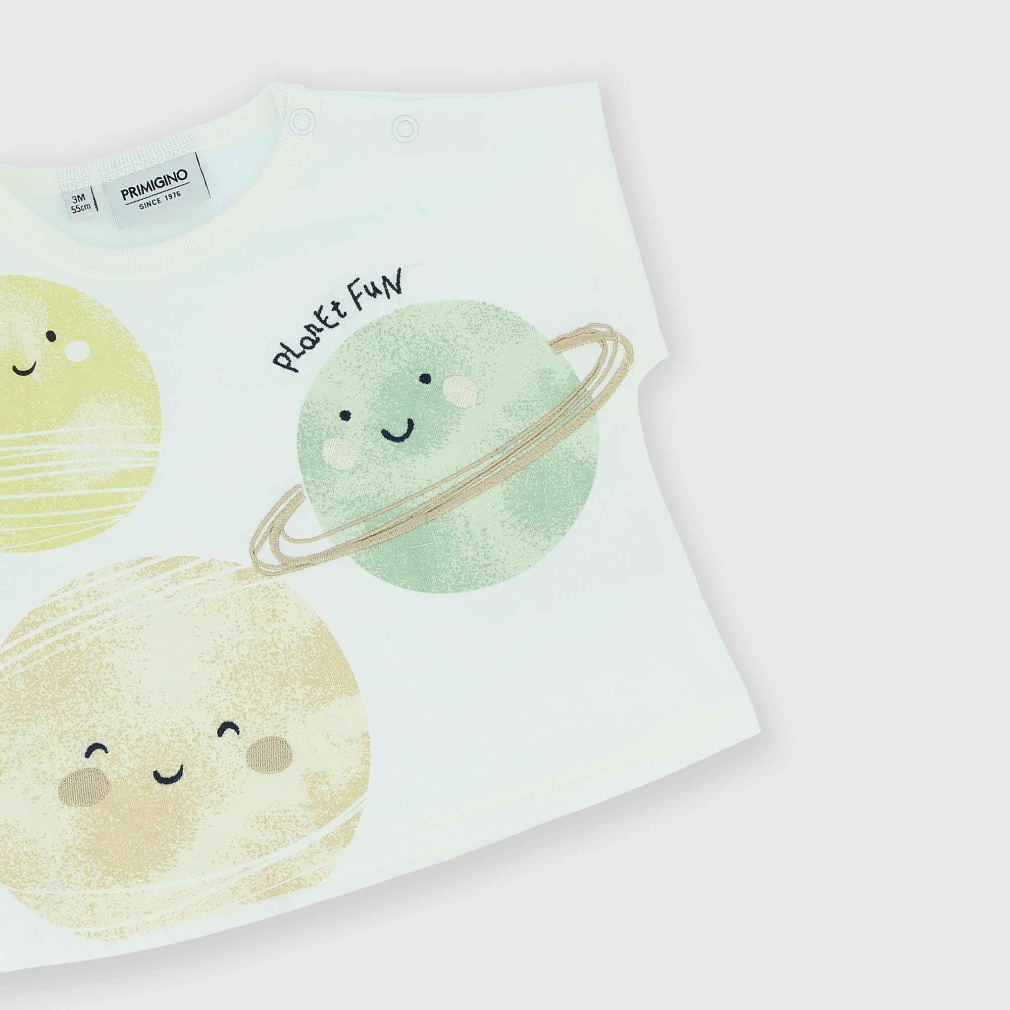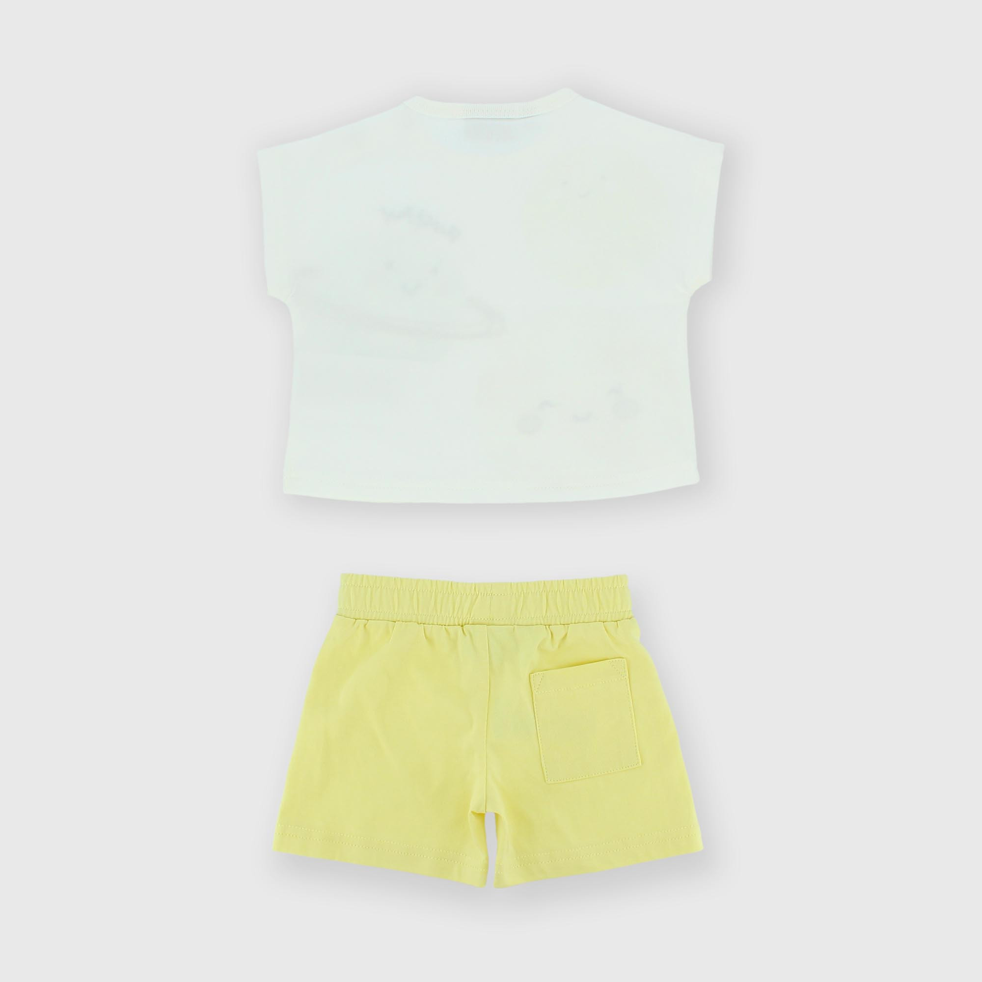 Complet composé de deux pièces. Pull en Jersey col-rond, manches courtes. Fermeture sur l'épaule avec boutons pression. Imprimé avec broderie devant. Pantalon avec taille élastique poche appliquée derrière.