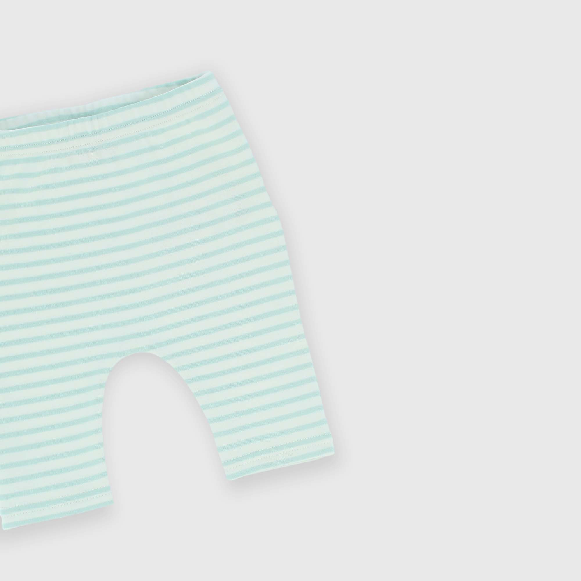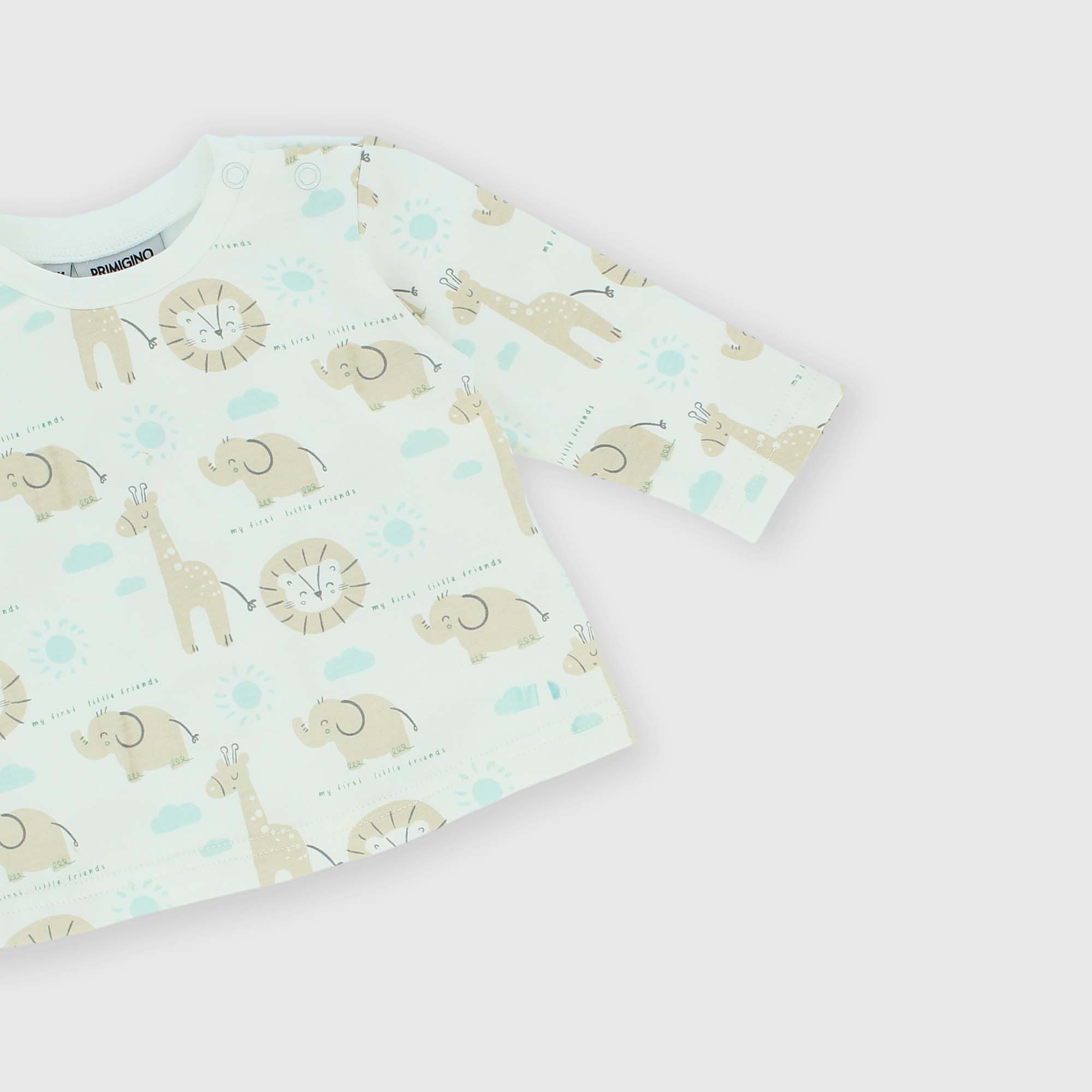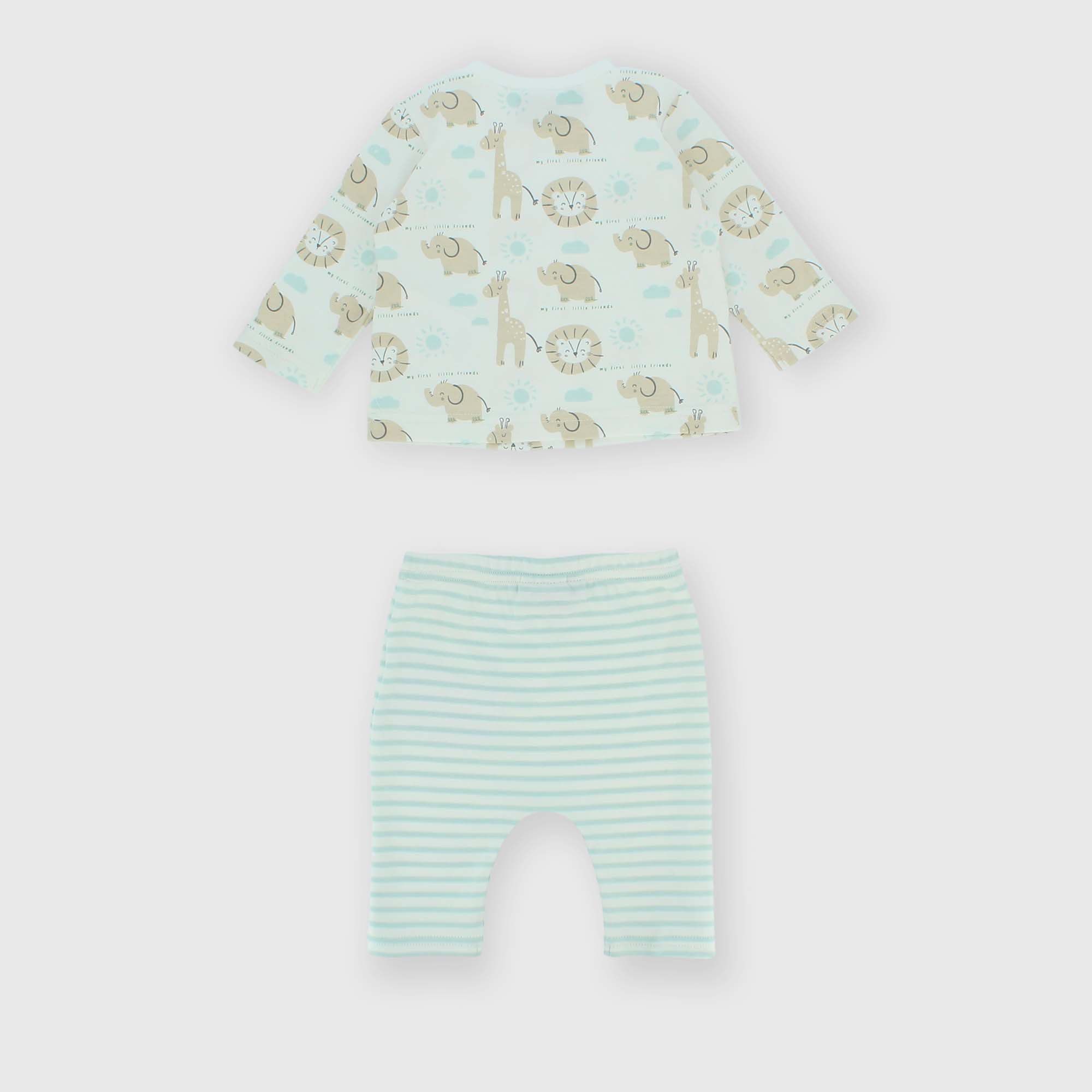 Complet en Interlock composé de deux pièces. Pull raz de cou, manches longues. Fermeture avec boutons pression sur l'épaule. Animaux imprimés all-over. Pantalon avec taille élastique. Rayures imprimées all-over.