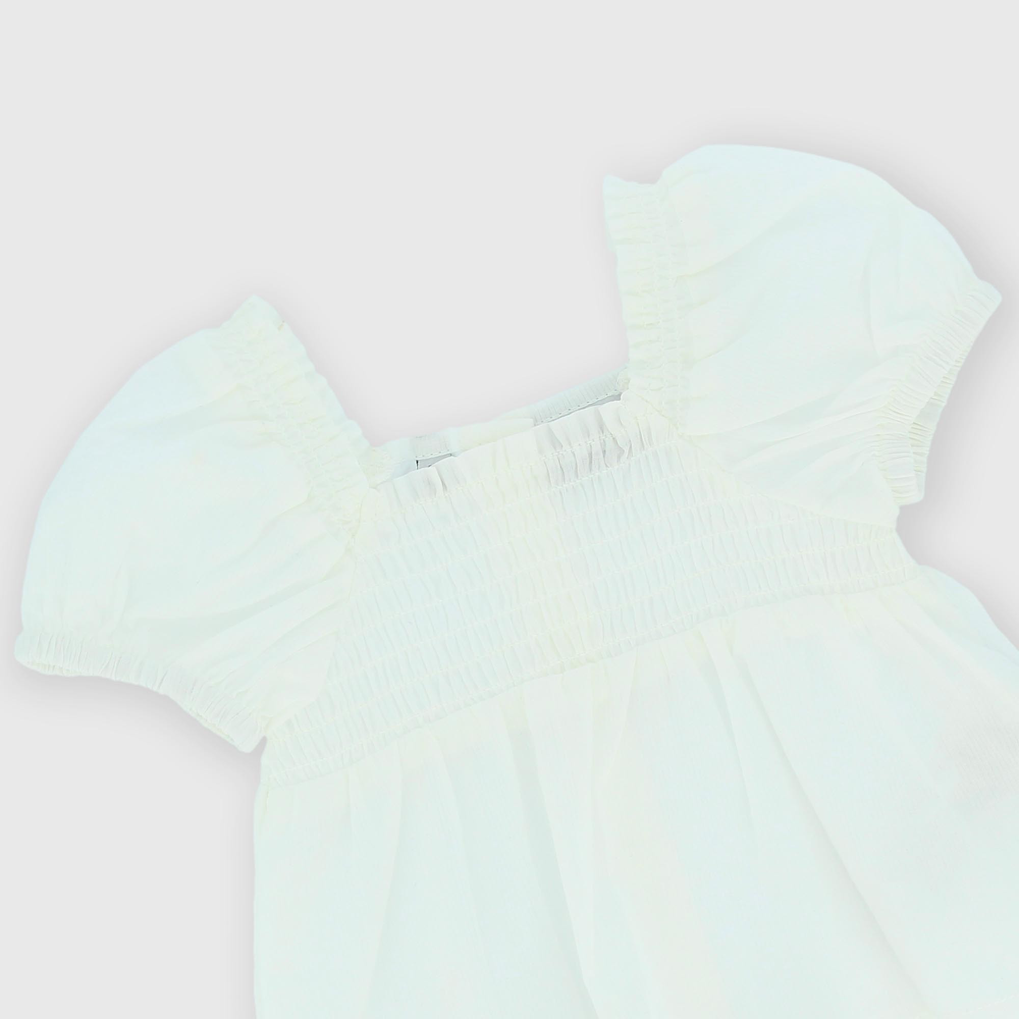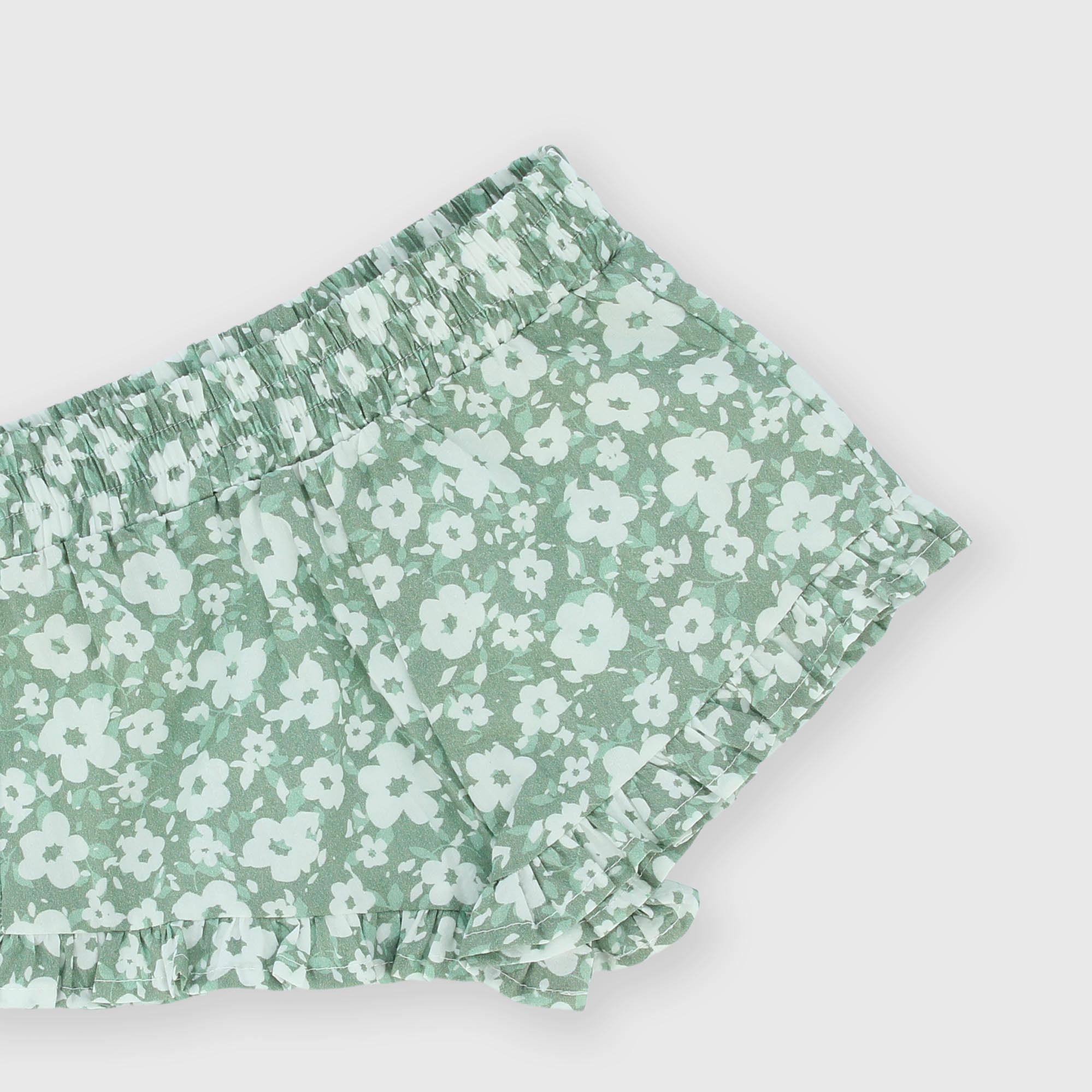 Composé deux pièces. Pull col carré avec manches courtes. Fermeture derrière avec boutons. Couture élastique sur la poitrine. Pantalon avec taille élastique et fleurs imprimés all-over.