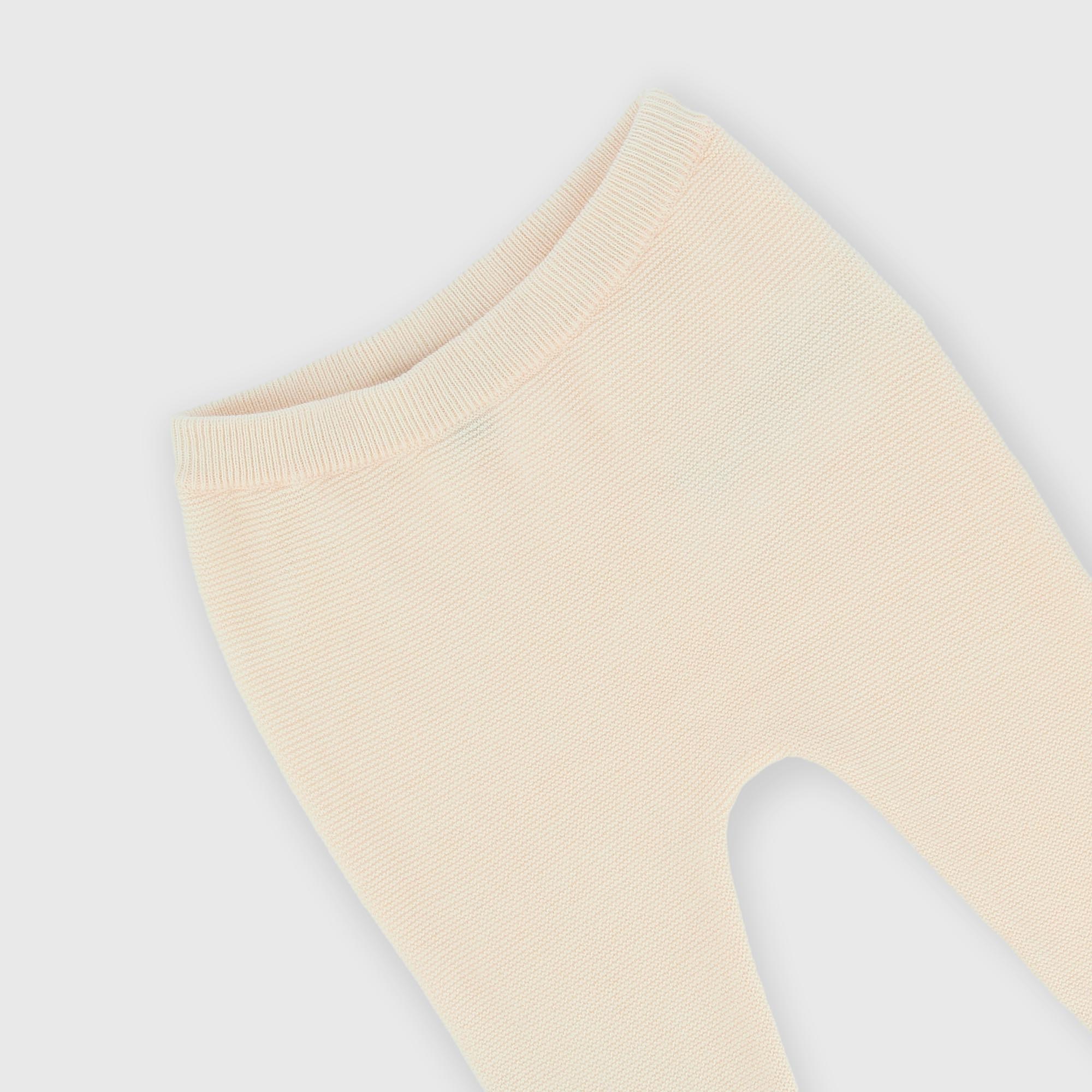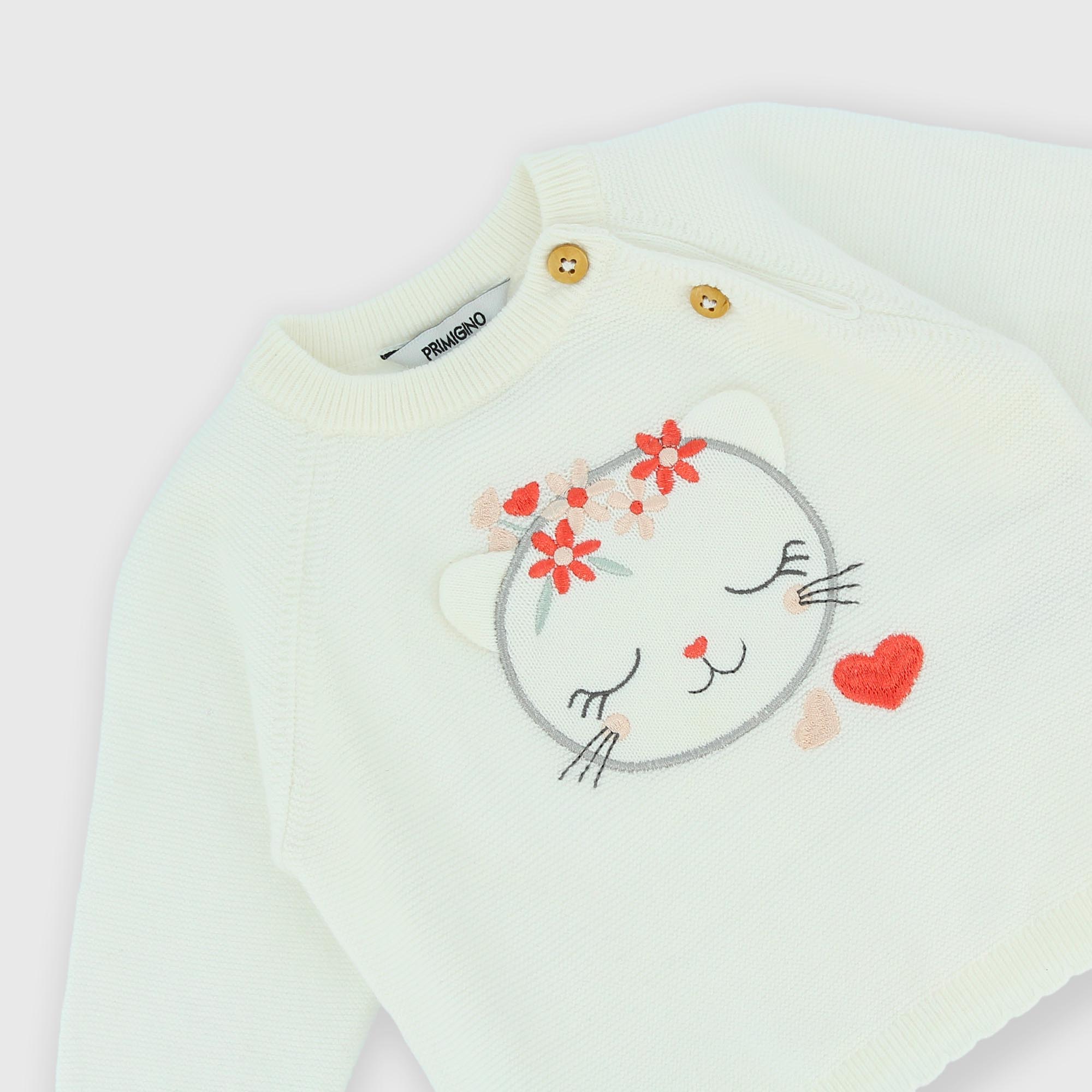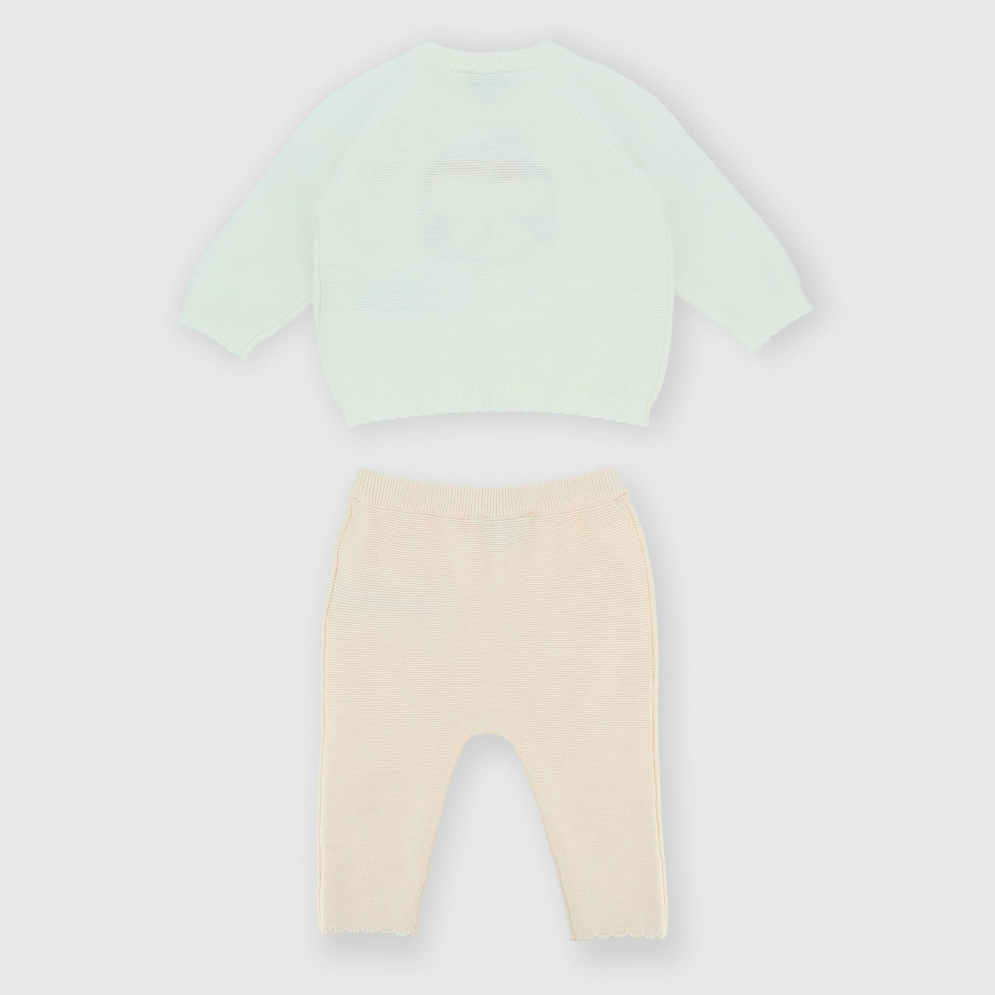 Complet tricoté en doux coton composé de deux pièces. Pull manches longues avec application brodée devant. Fermeture genre kimono. Pantalons avec taille élastique.