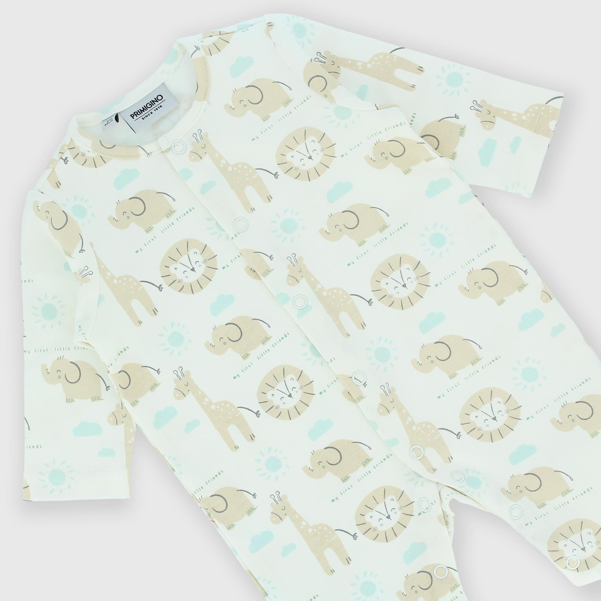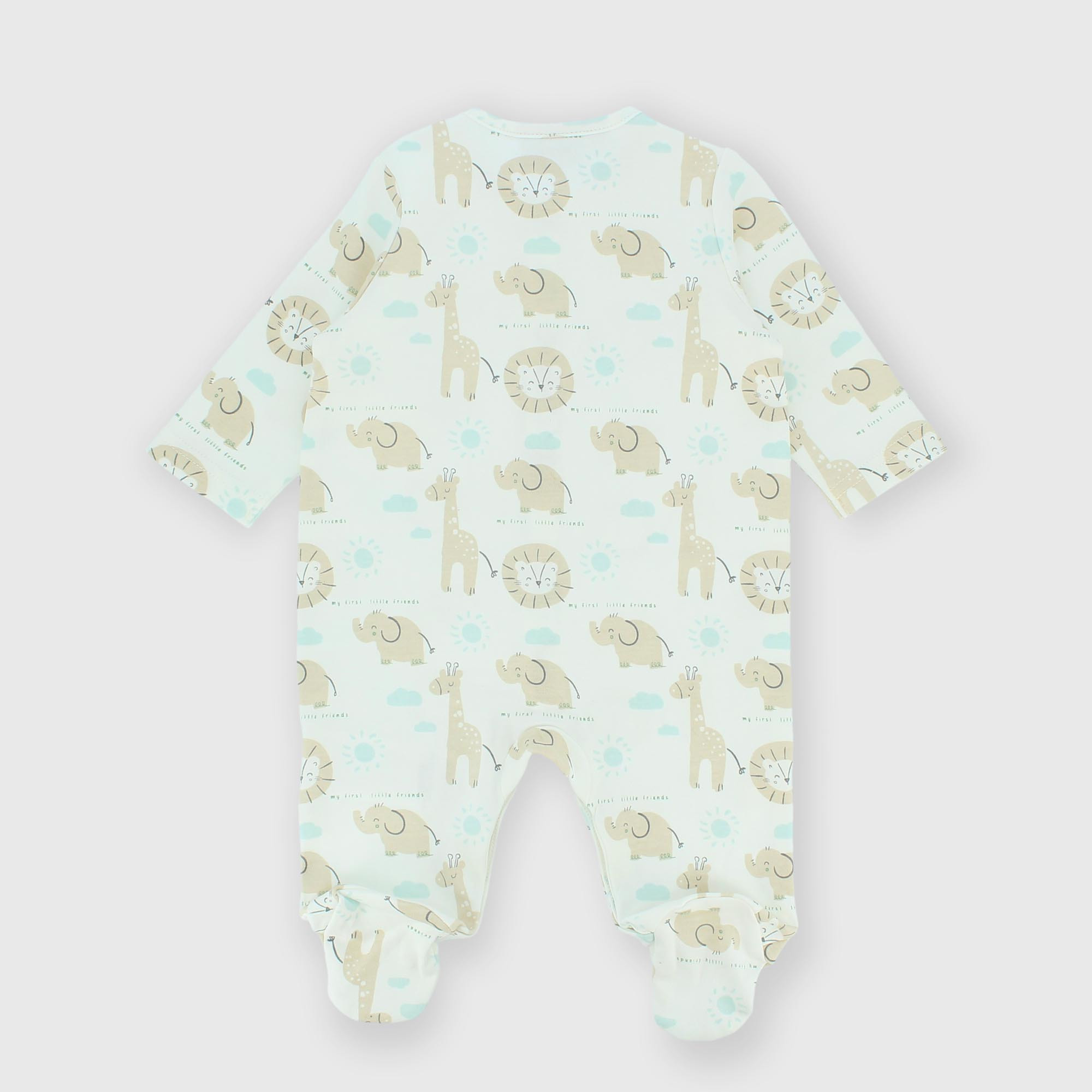 Combinaison en Interlock, col-rond, manches longues. Fermeture devant avec boutons pression. Animaux imprimés all-over.