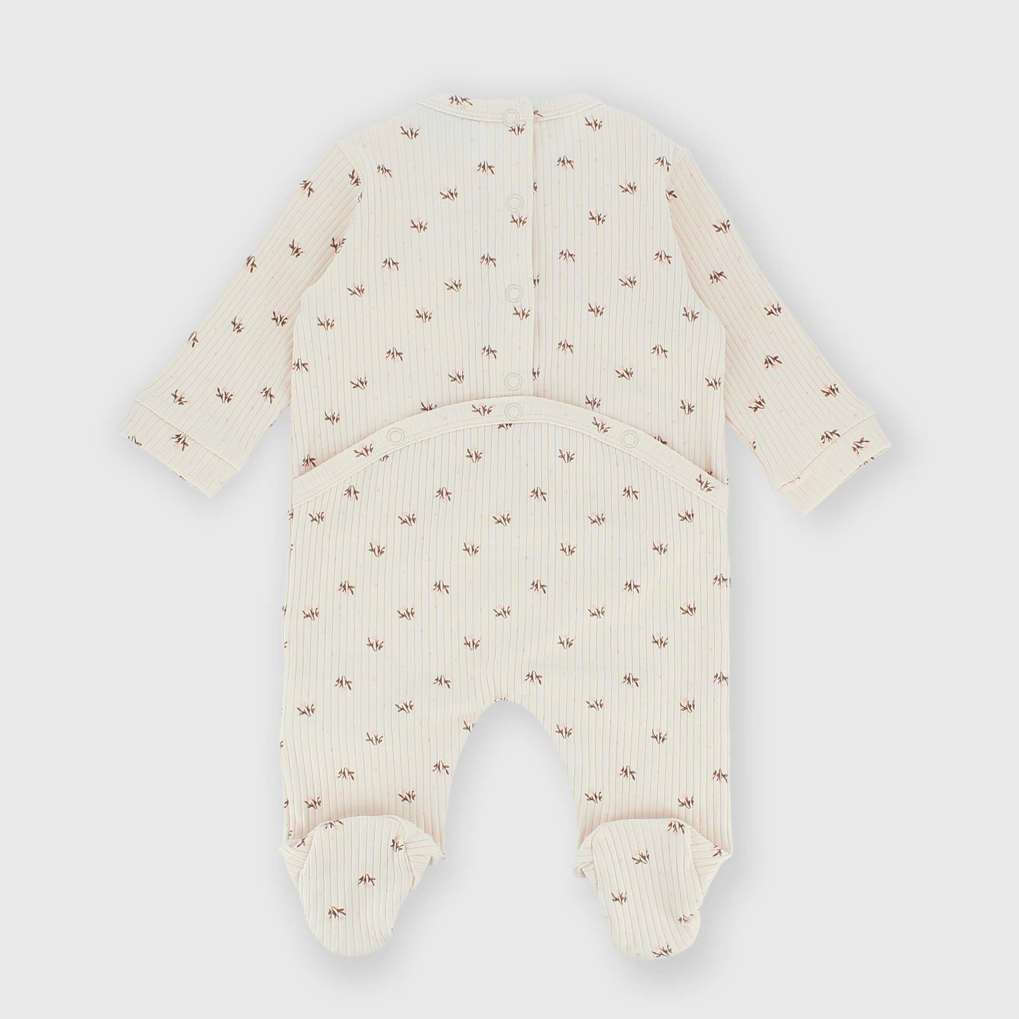 Combinaison côtelée, raz de cou et manches longues. Faux boutons et volants sur l'encolure. Fermeture derrière avec boutons pression. Fleurs imprimées all-over.