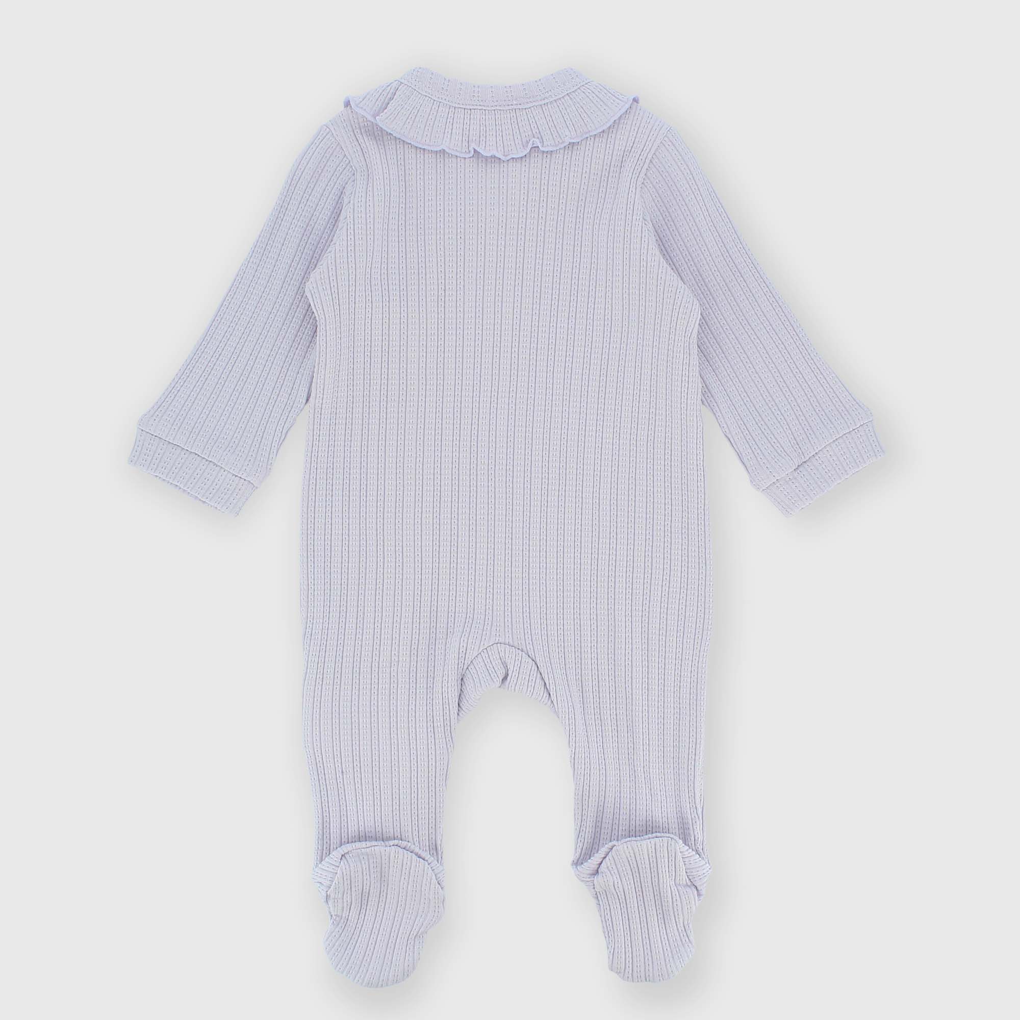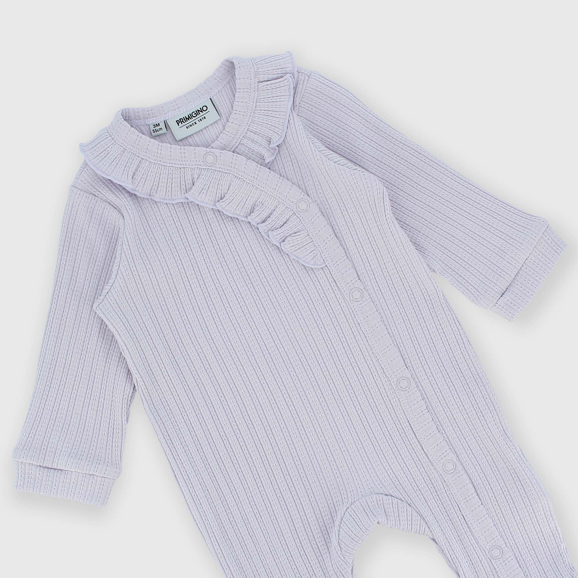 Combinaison côtelée, raz de cou et manches longues. Fermeture kimono avec boutons pression. Volants appliqués autour de l'encolure et devant.