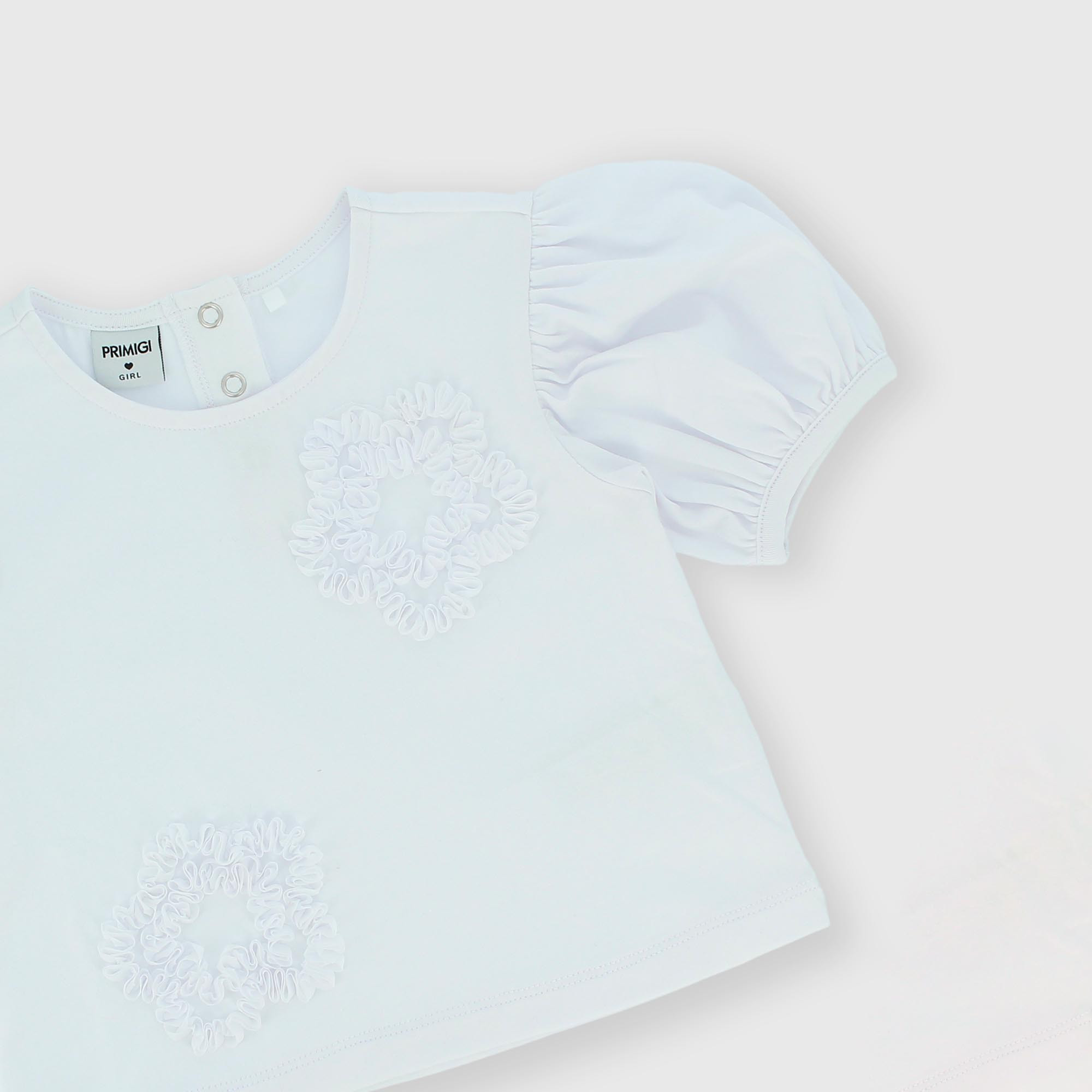 T-shirt en Jersey élastique, col-rond, manches courtes. Fermeture avec boutons pression sur le dos. Application en organza à forme de fleur devant.