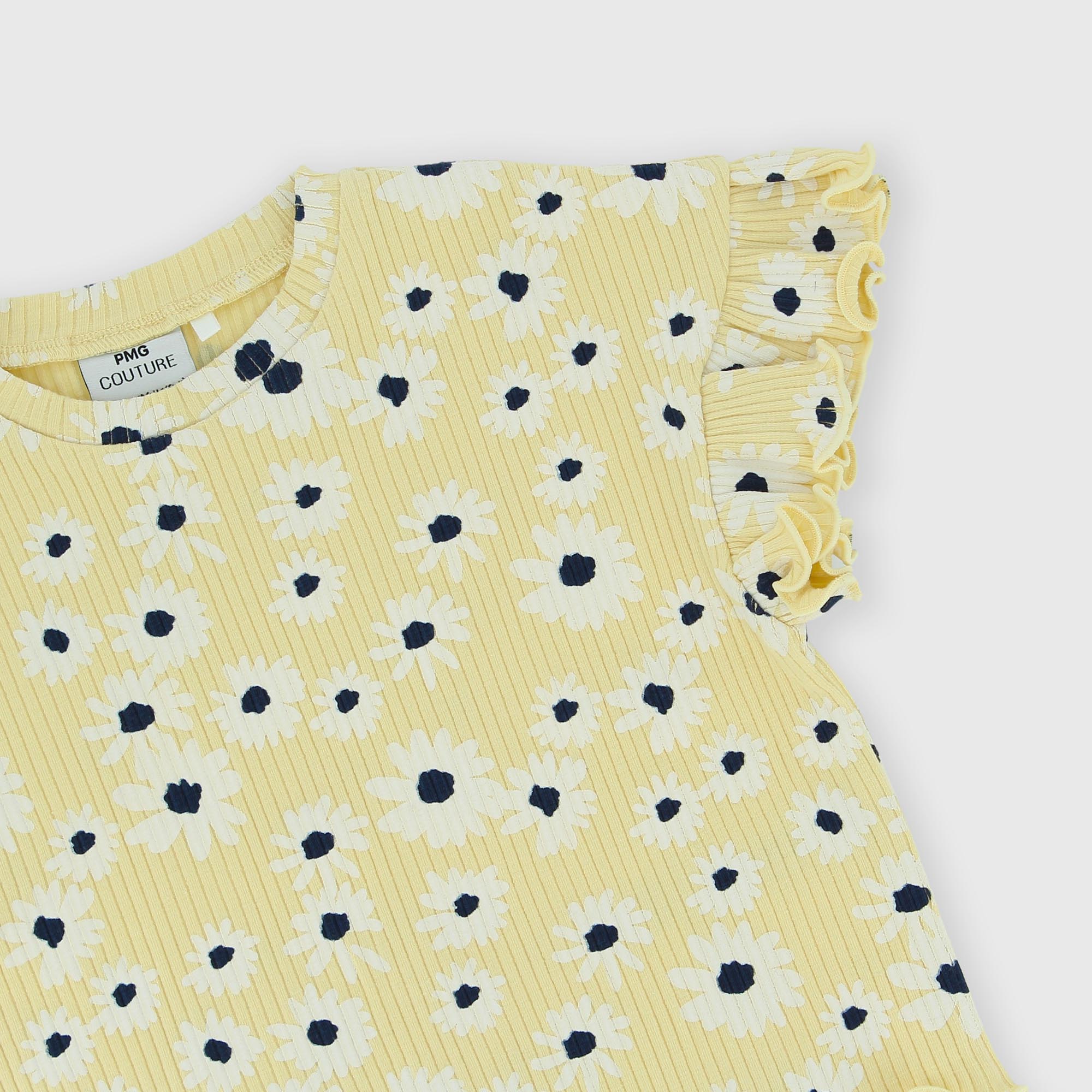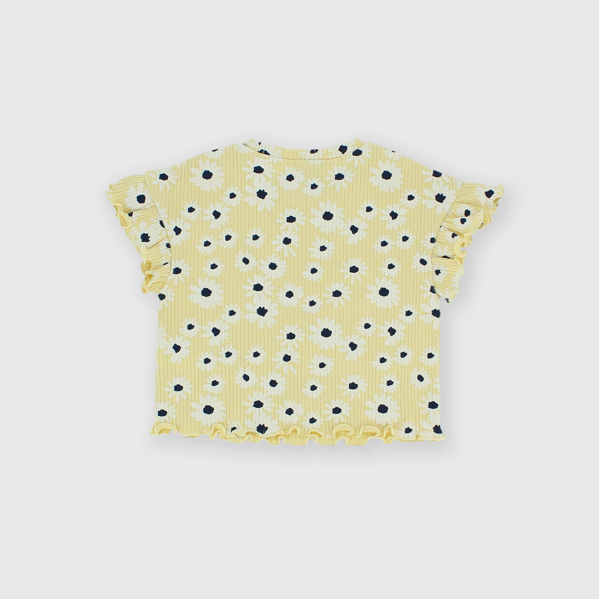T-shirt côtelé, col-rond, manches courtes avec volants. Fleurs imprimées all-over.