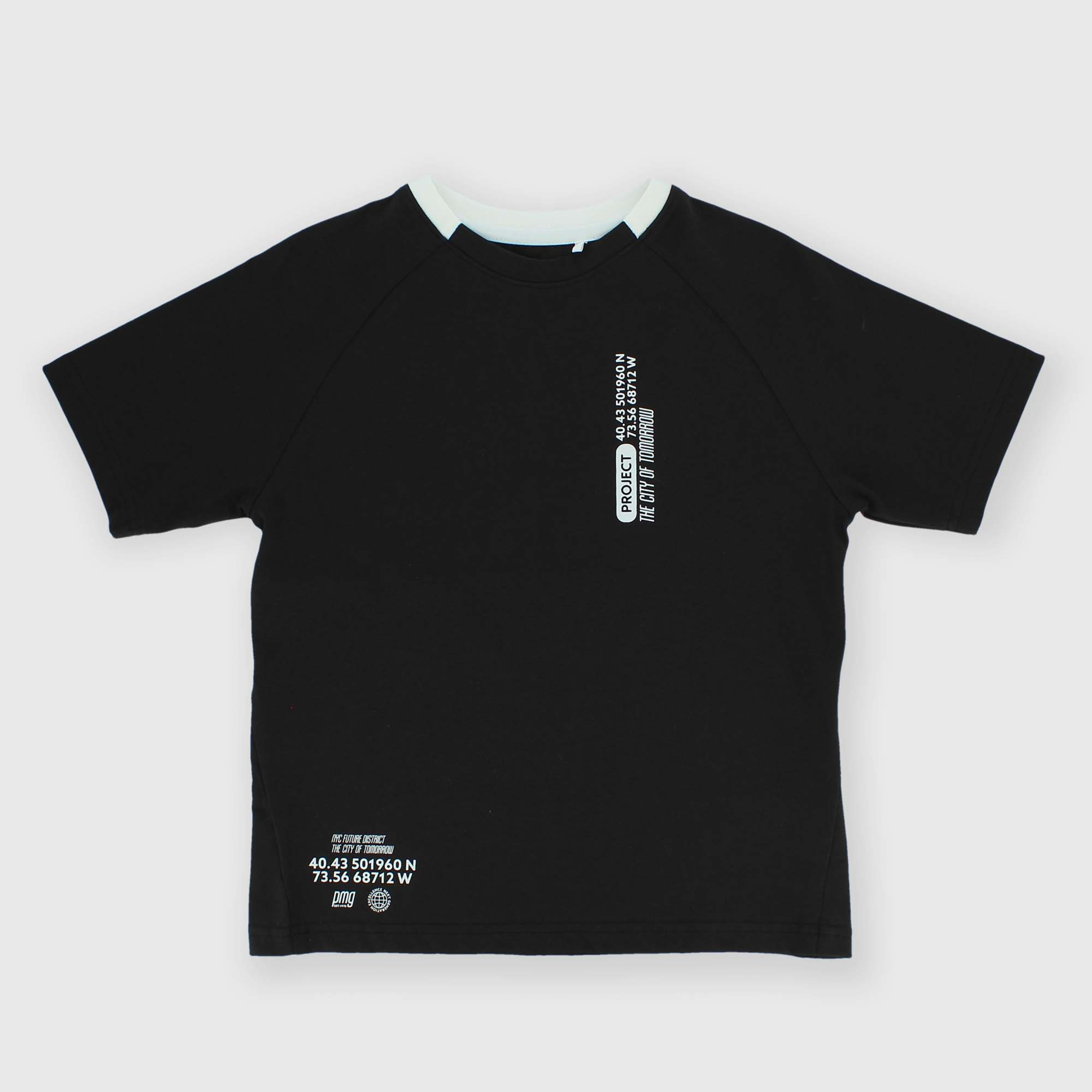 Pull en Jersey, raz de cou, manches courtes. Imprimé avec lettrage devant et derrière. Col côtelé et à contraste.