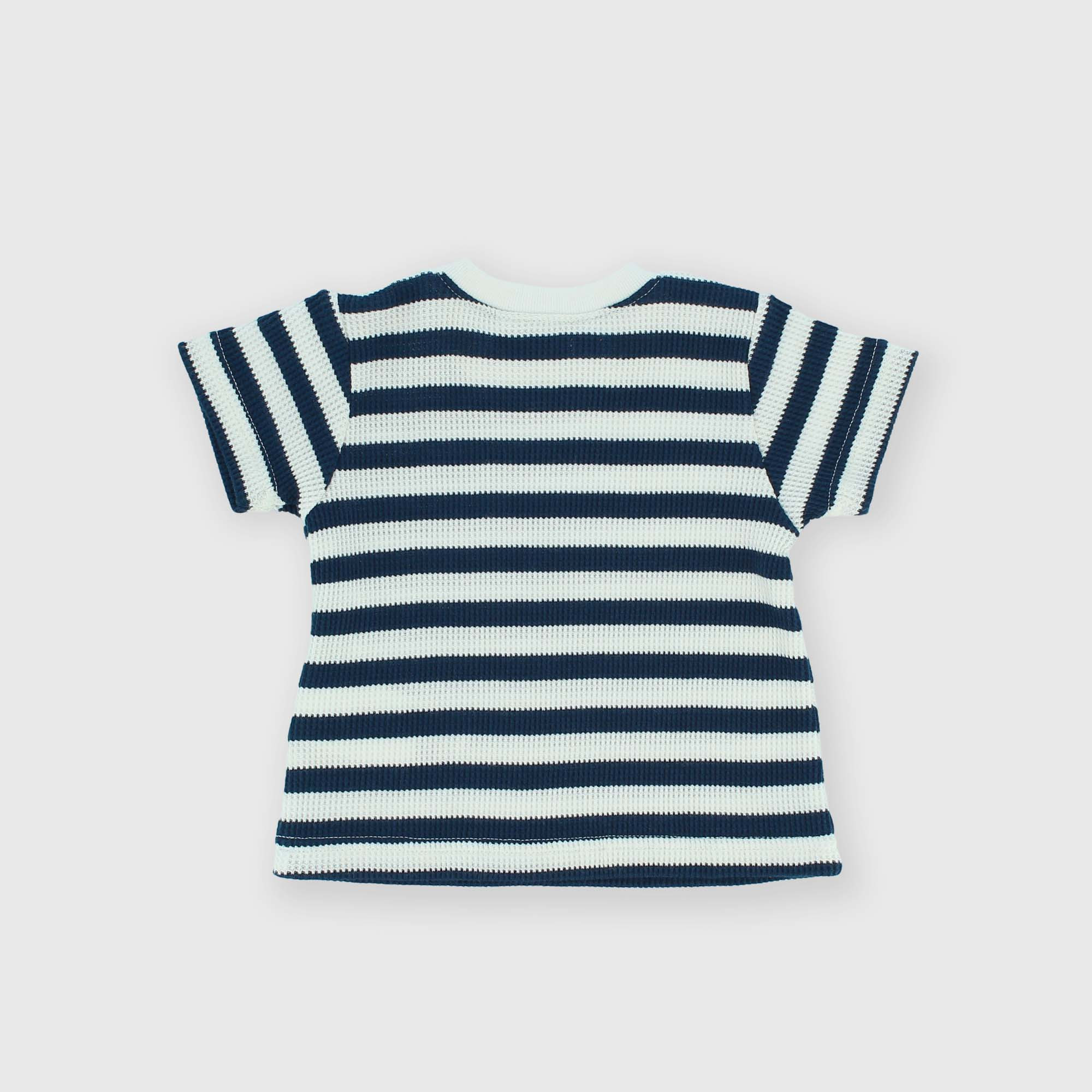 T-shirt en Jersey, rayures teint fil, raz de cou, manches courtes. Fermeture avec boutons pression sur l'épaule.