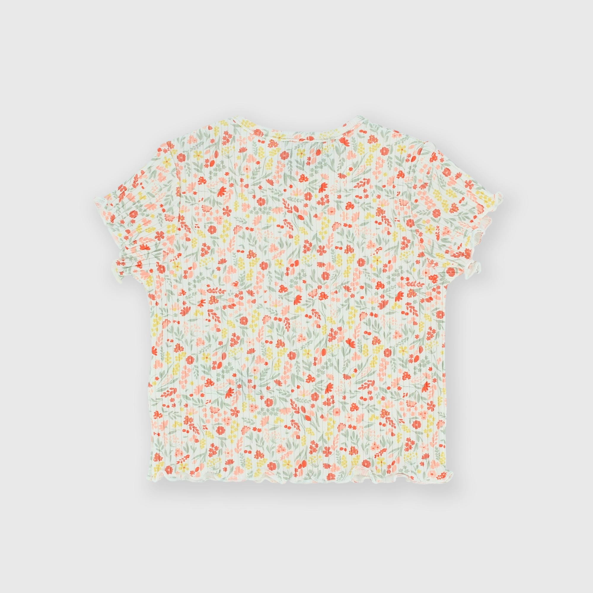 T-shirt côtelé, col-rond, manches courtes. Fermeture avec boutons pression sur l'épaule. Fleurs imprimées all-over.