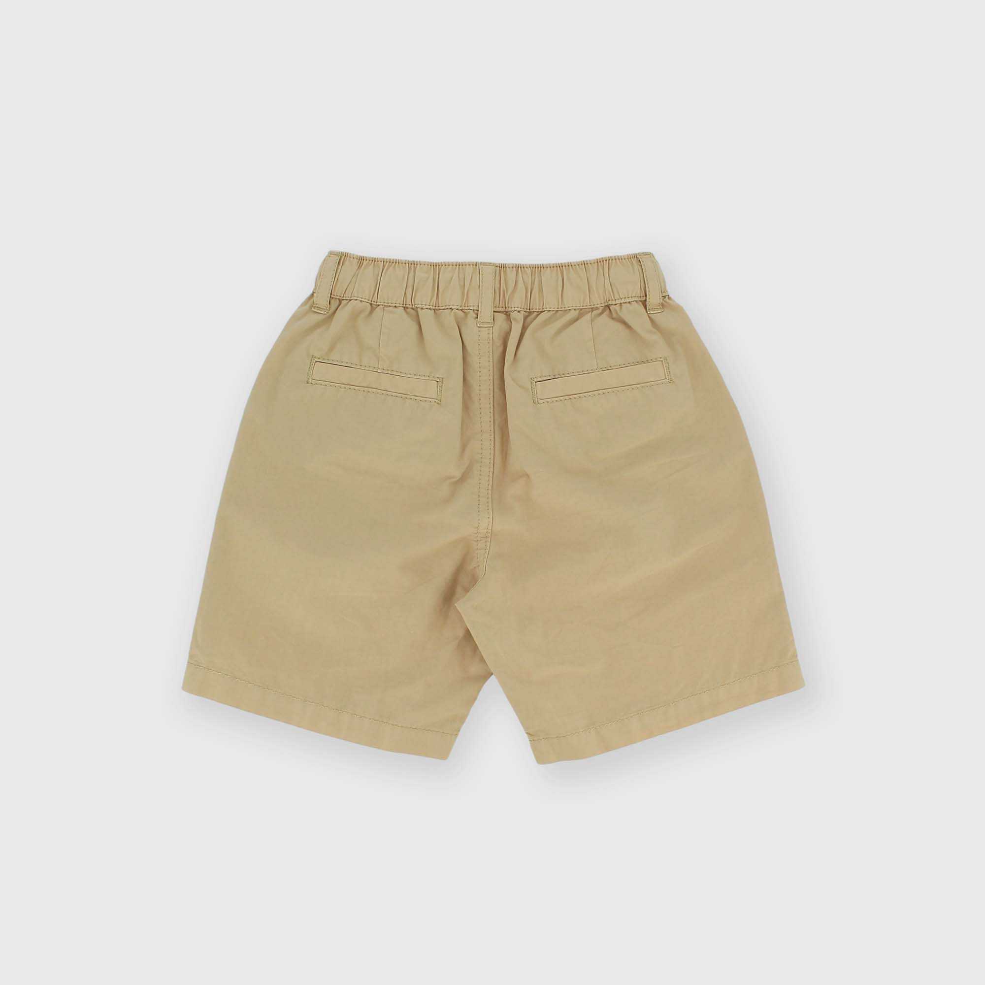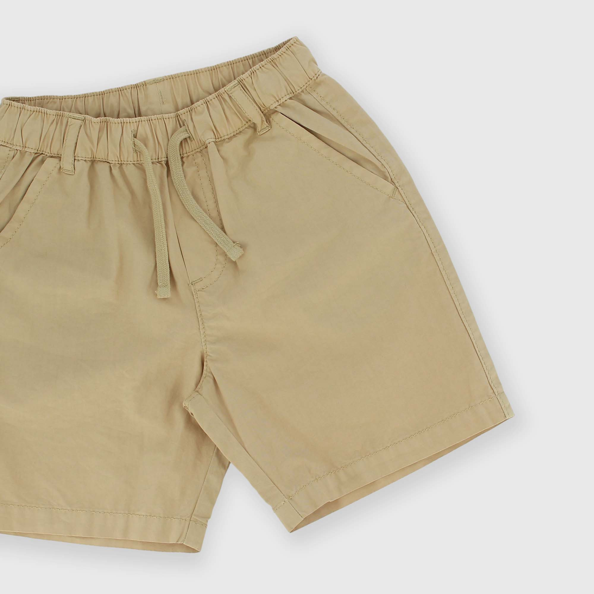 Bermudas en popeline teint en pièce avec taille élastique et lacets devant. Poches françaises devant et à lisière derrière.