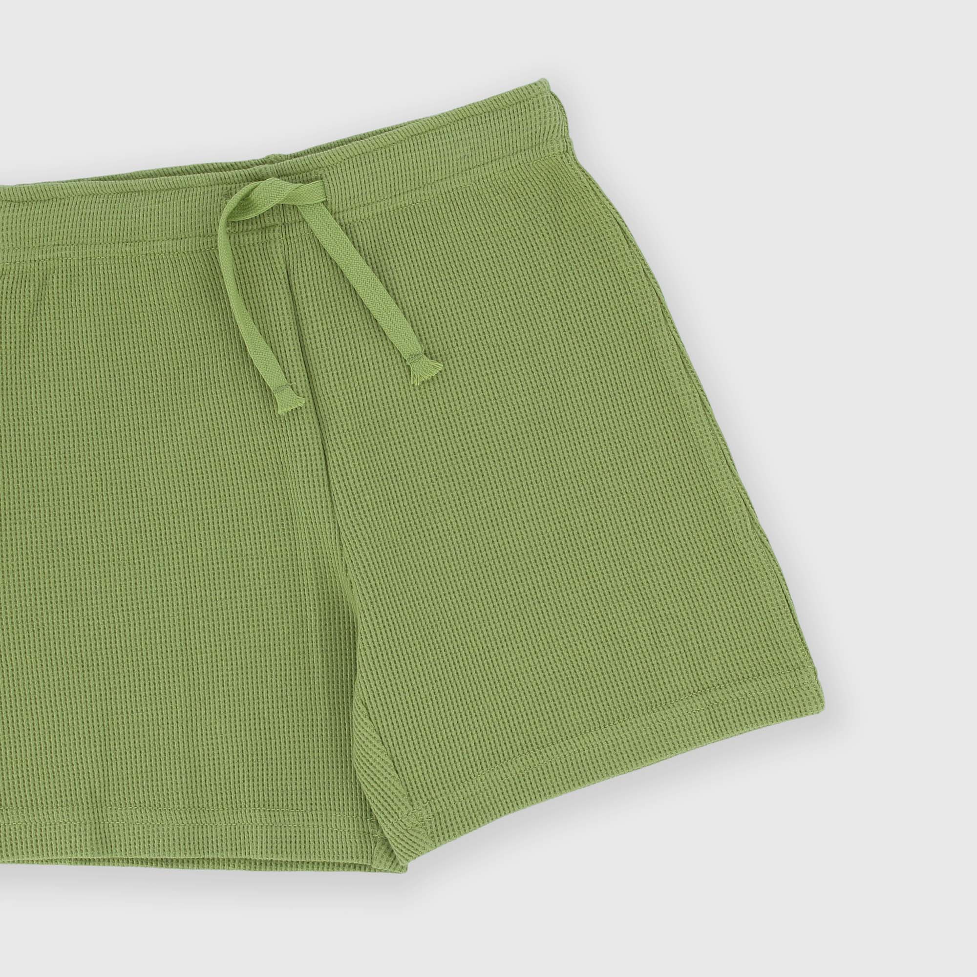 Bermuda avec taille élastique et lacets devant. Fabrication effet nid d'abeille.