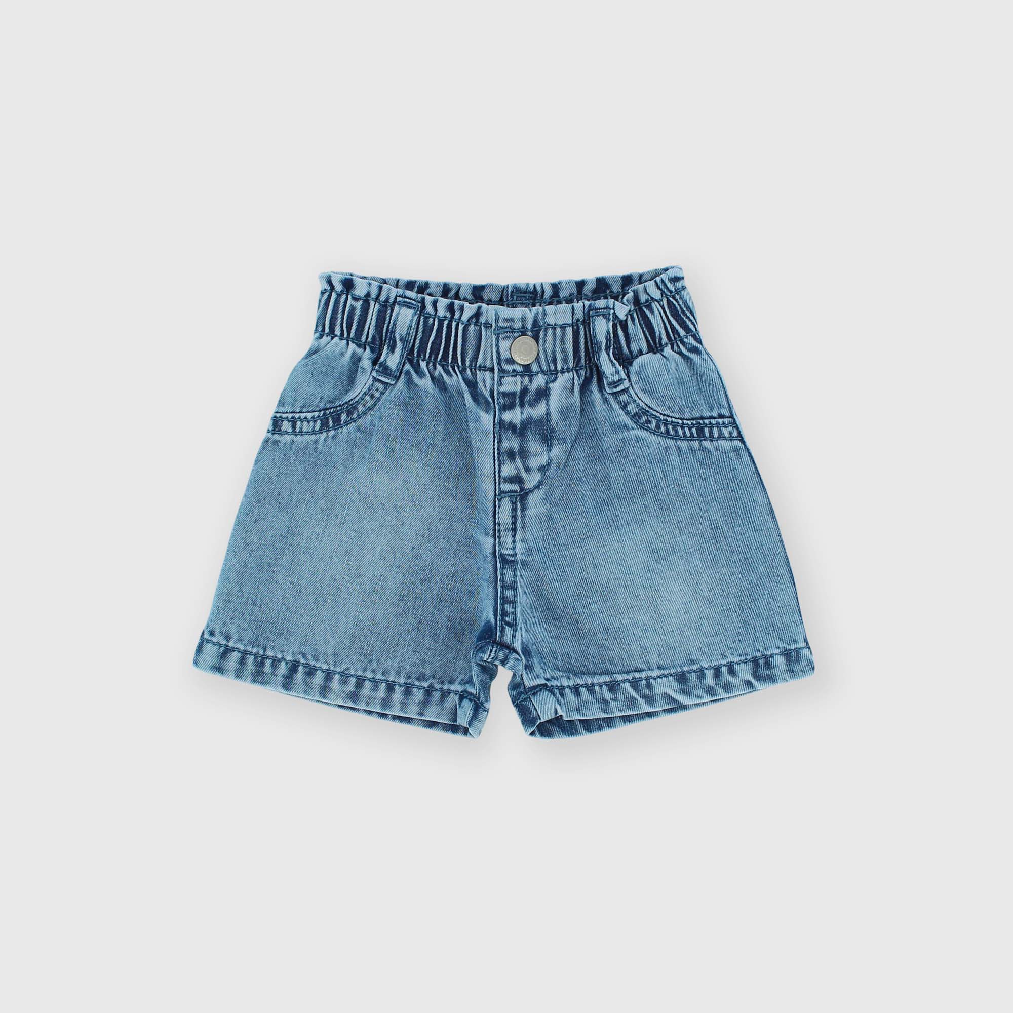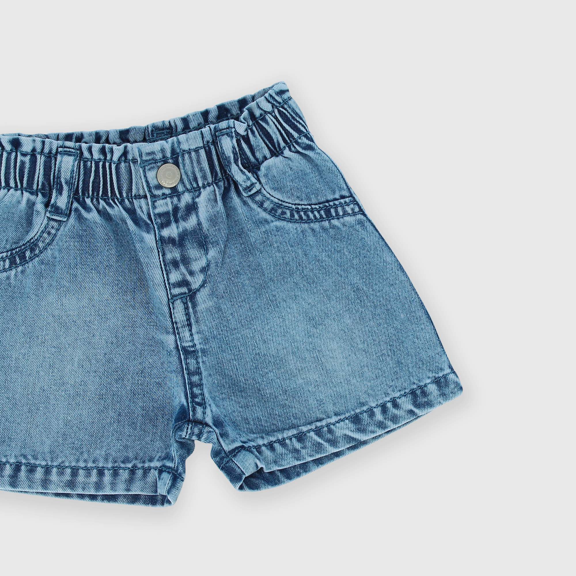Shorts en jeans avec taille élastique. Fermeture avec bouton automatique. Poches appliquées derrière.