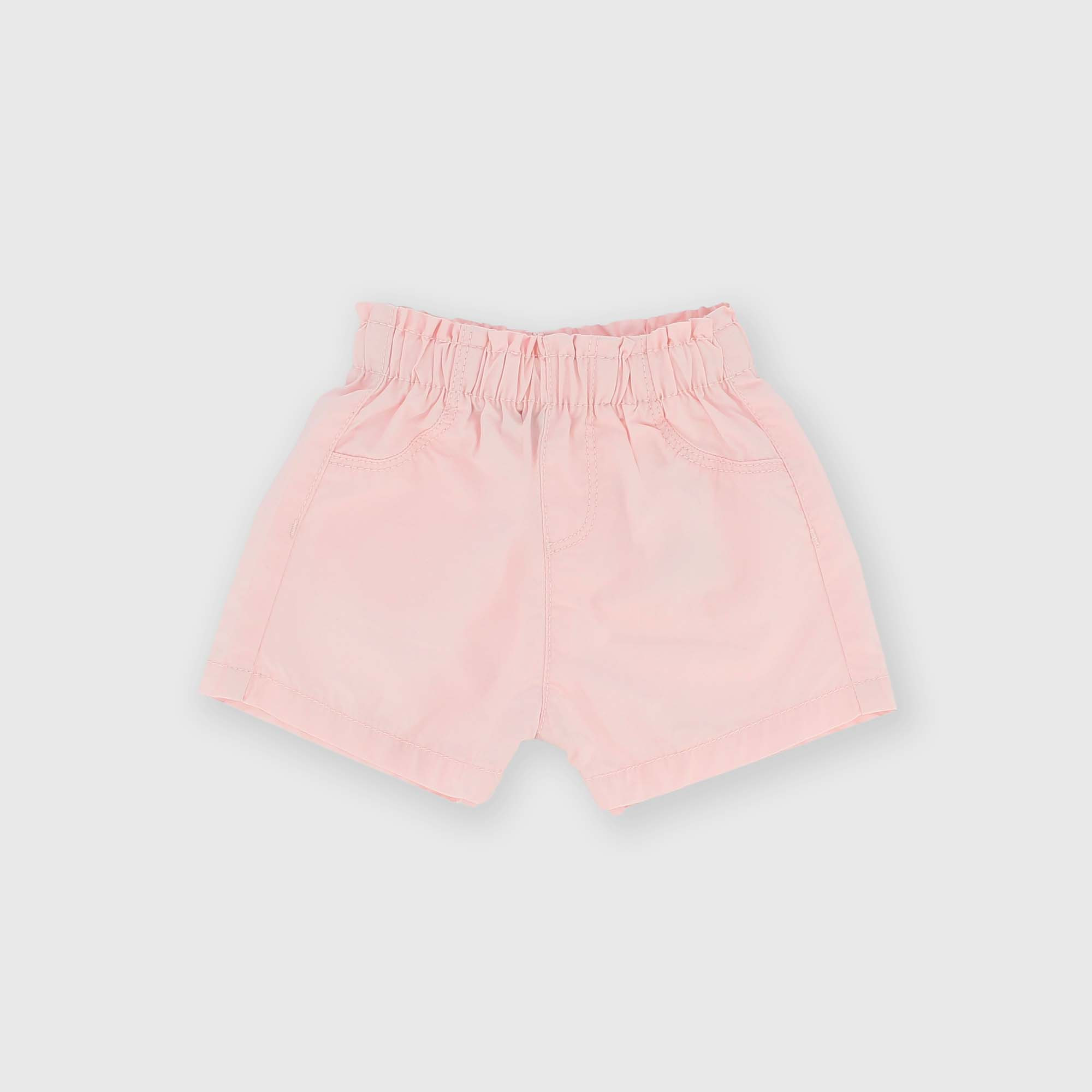 Shorts en popeline avec taille élastique. Fermeture avec bouton automatique. Poches appliquées derrière.