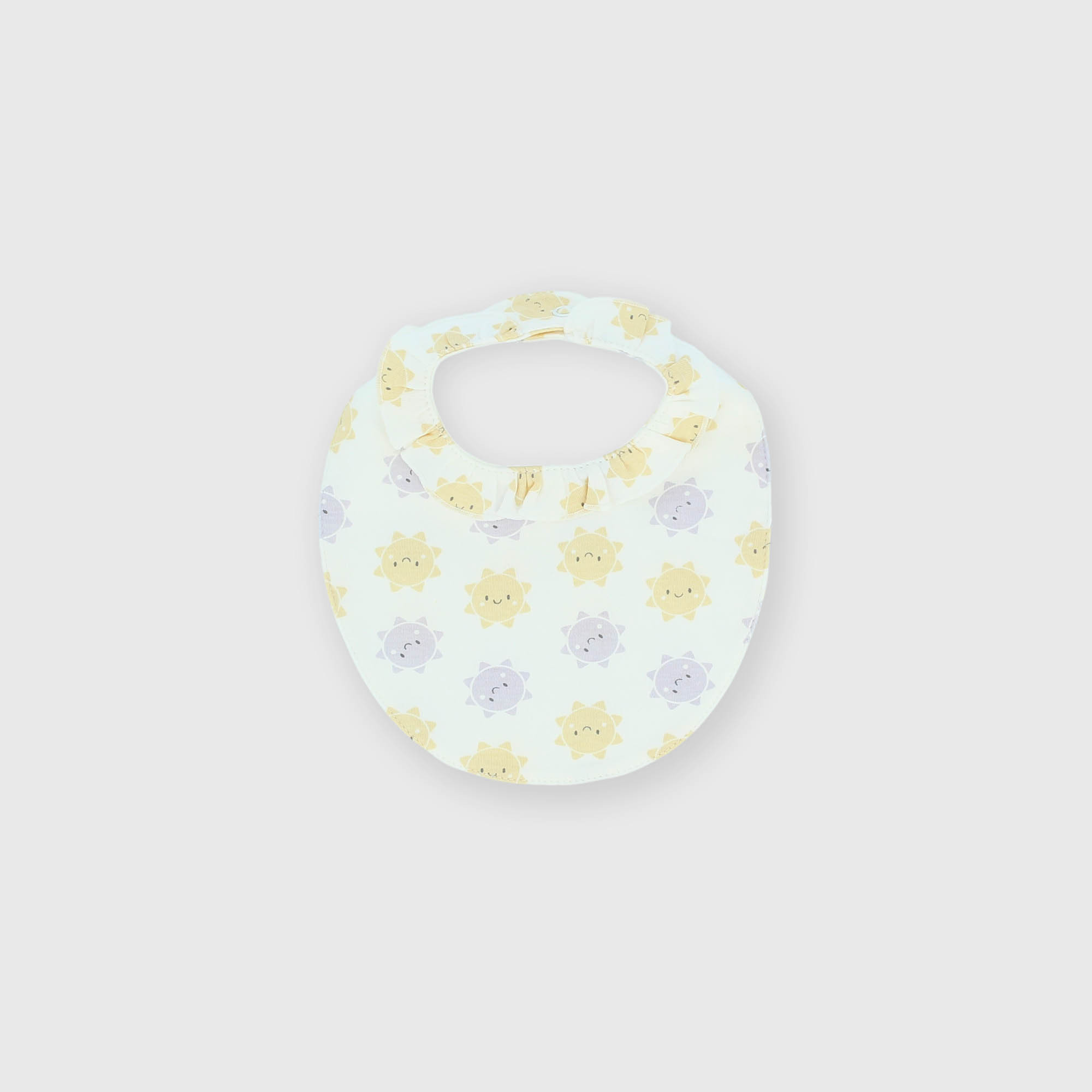 Bavette en coton avec fermeture boutons pression. Volant sur le cou. Imprimé soleil all-over.