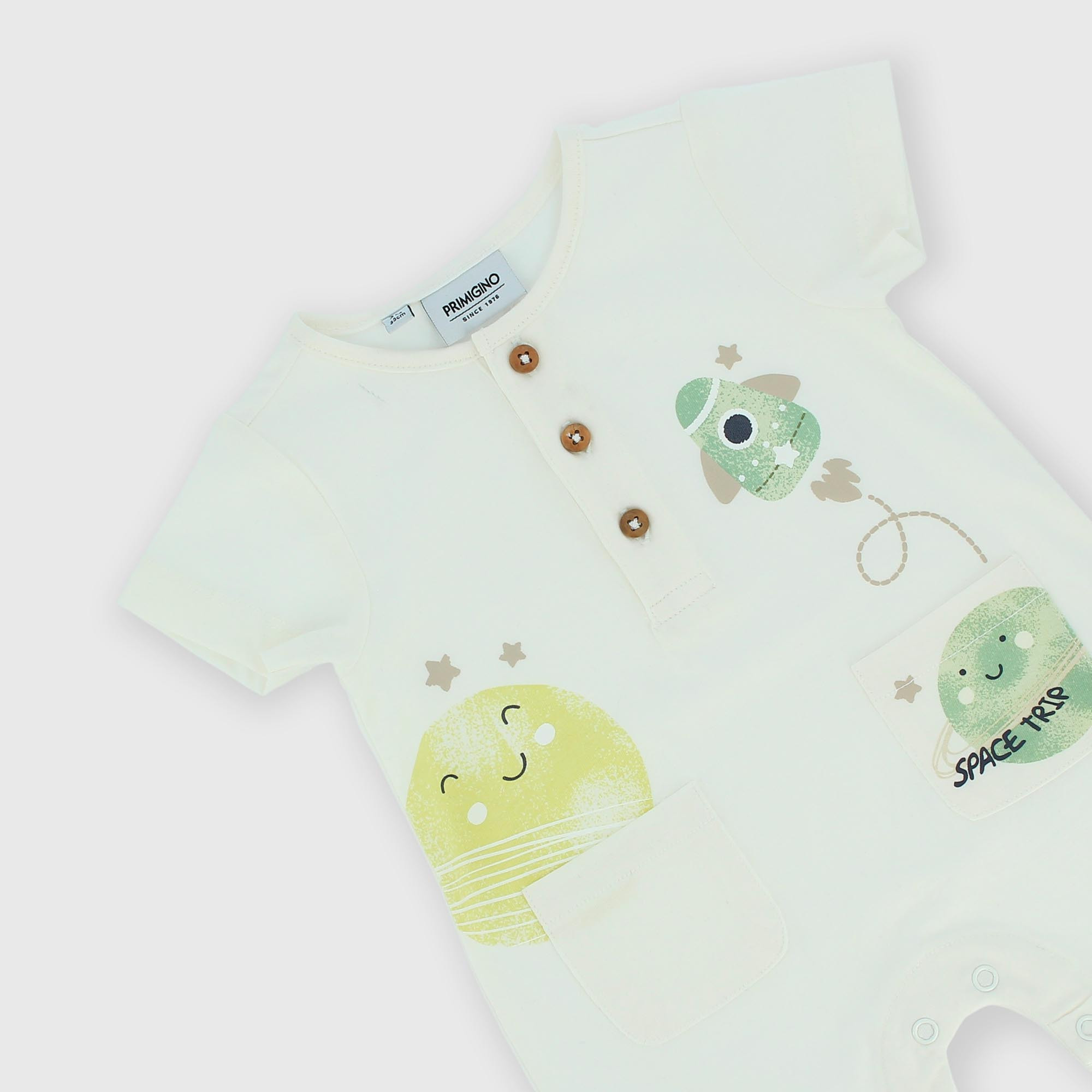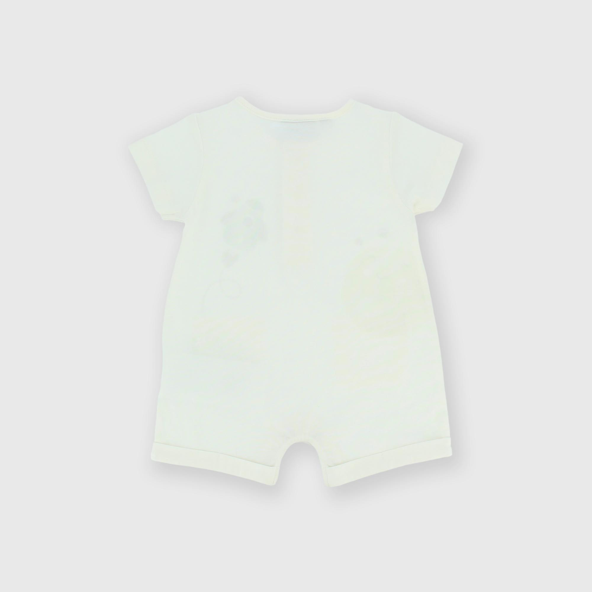 Combinaison en Jersey, col rond, manches courtes. Boutons en bois sur l'encolure. Fermeture avec boutons pression sur l'entrejambe. Imprimé et poches appliquées devant.