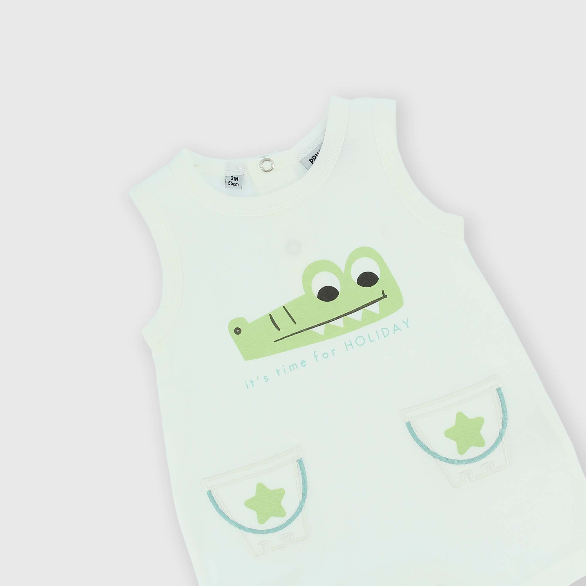 Combinaison côtelé, raz de cou, sans manches. Boutons pression derrière et sur l'entrejambe. Poches appliquées.