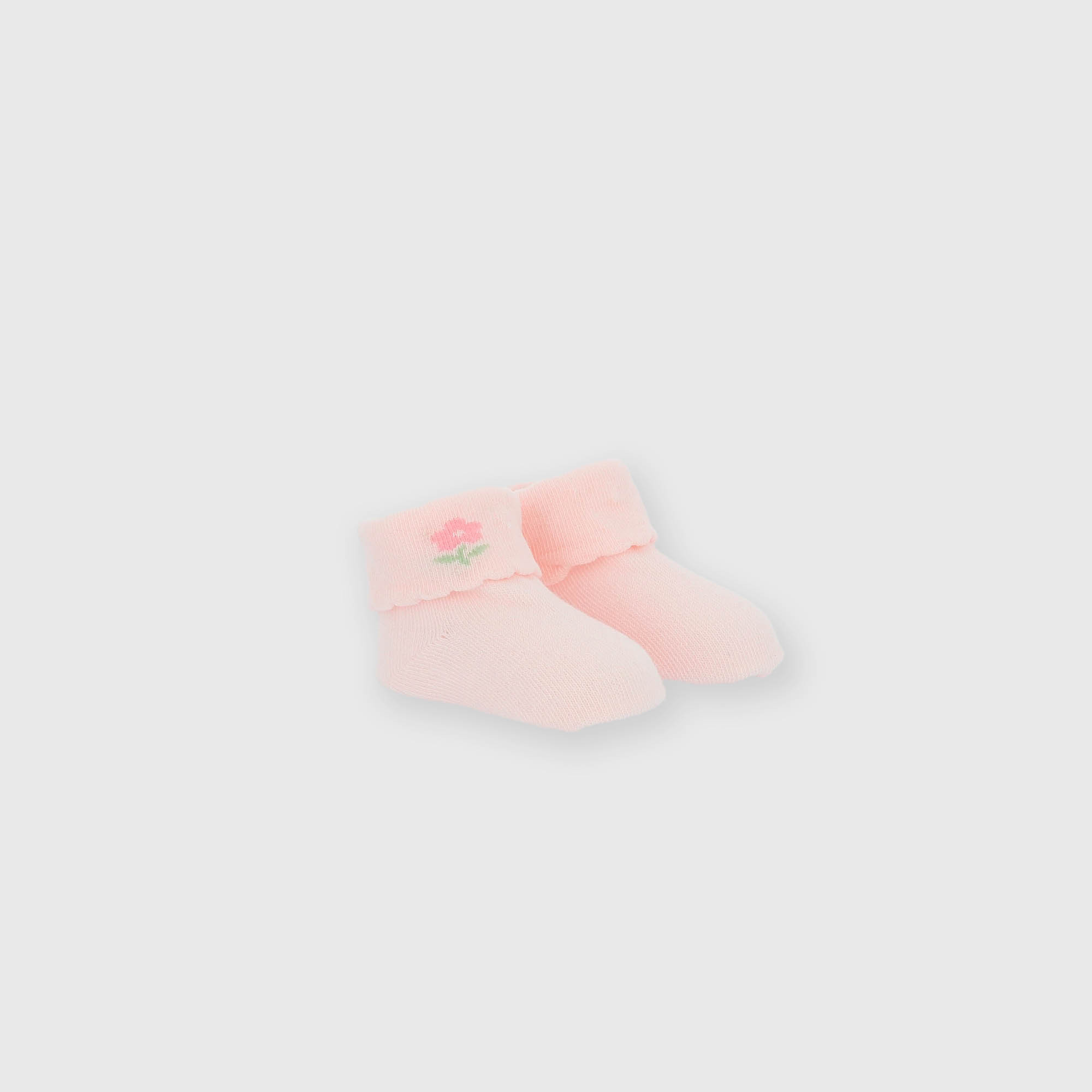 Chaussettes courtes nouveau-née couleur unie avec revers et fleur. Ourlet festonné.