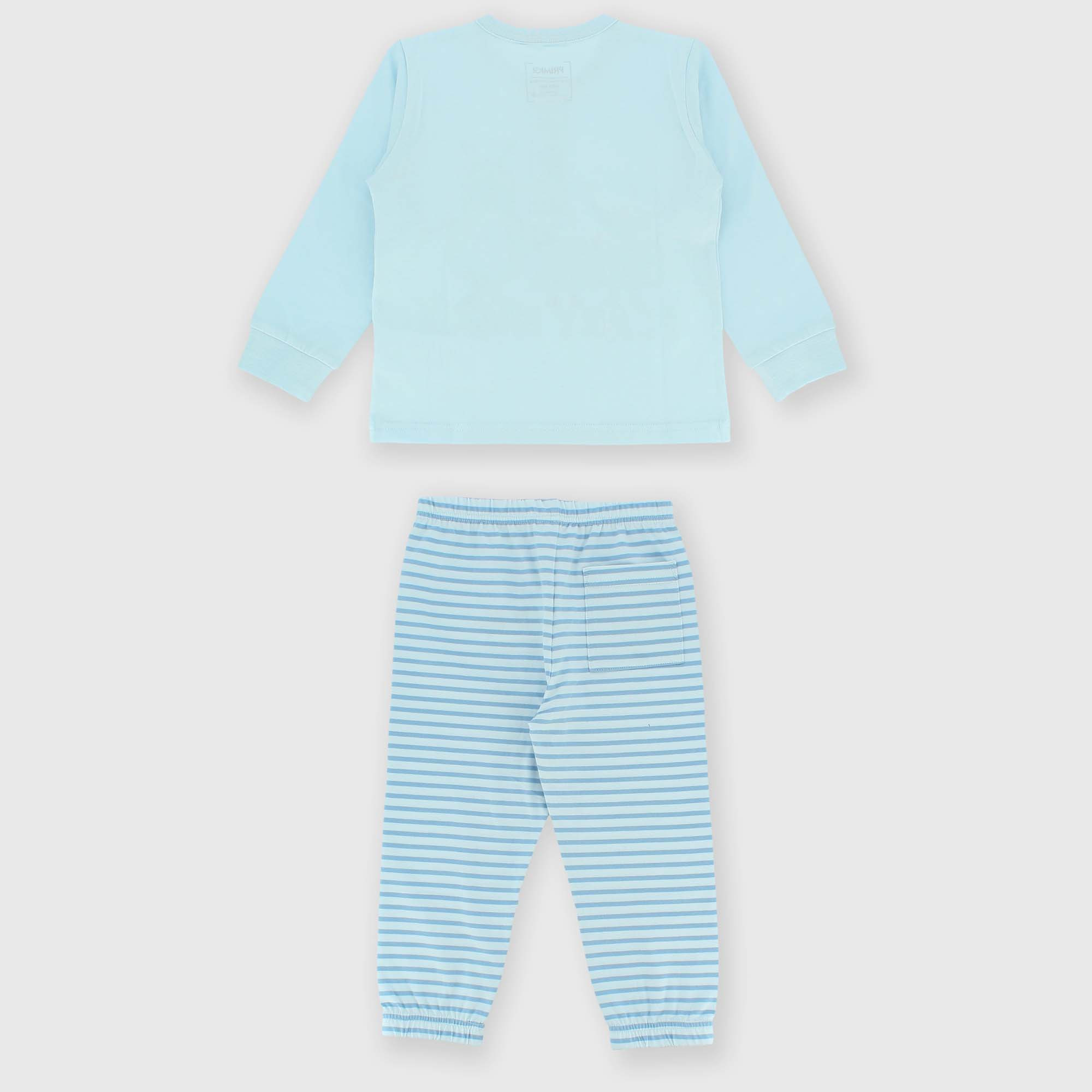 Complet pyjama en Jersey. Pull col-rond, manches longues, avec boutons devant. Imprimé devant et poignets côtelés. Pantalon avec taille élastique et rayures teint -fil. Poche appliquée derrière et fond élastique.