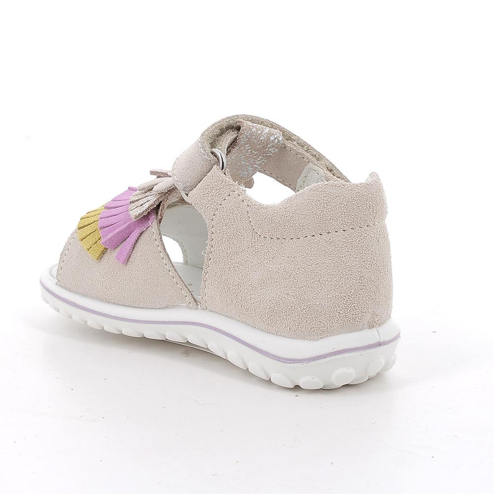 Sandales premiers pas pour fillettes, douces et confortables, avec fermeture velcro pour un enfilage facile et sûr. La tige est ornée de franges qui ajoutent une touche ludique, tandis que la semelle souple soutient les premiers mouvements en tout confort. La semelle intérieure en cuir offre un appui hygiénique et transpirant.