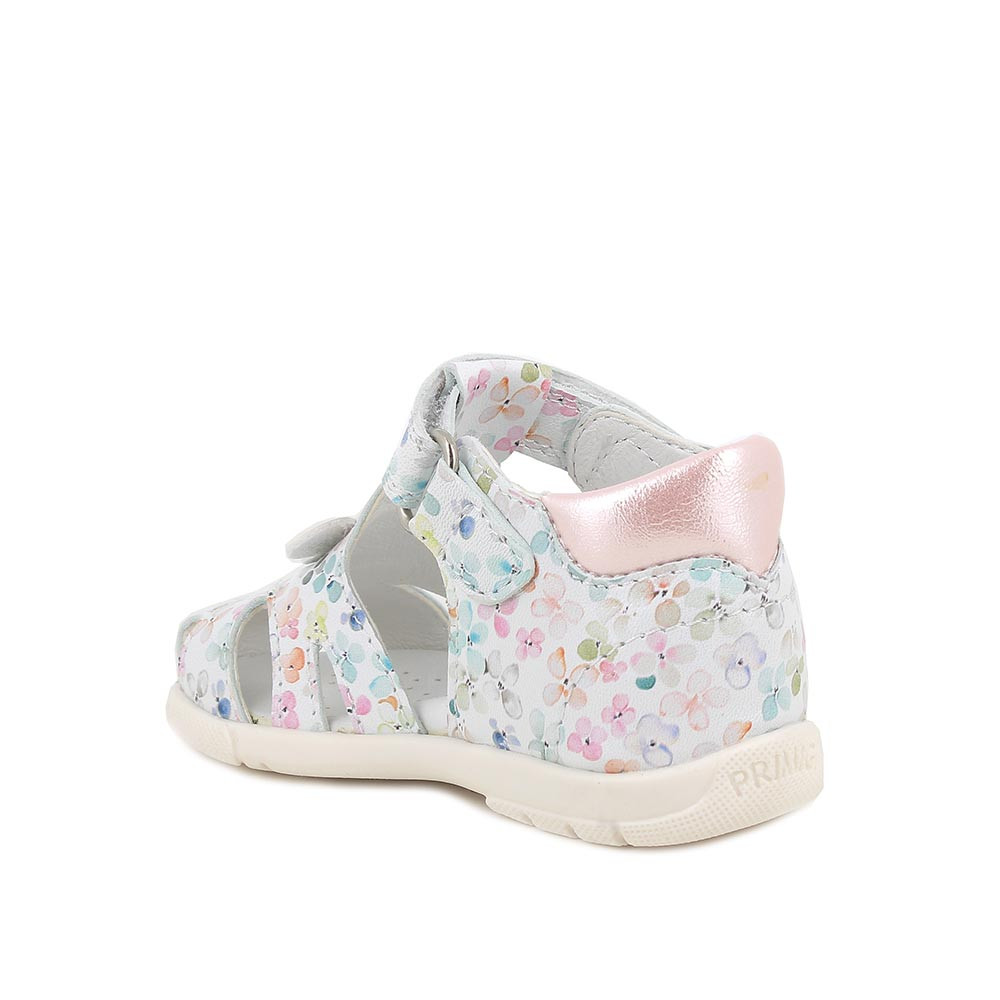 Des sandales premier pas pour fille avec la pointe fermée. La qualité des matériaux et de la construction assure un environnement sain et un soutien adéquat dans cette phase délicate de la croissance. Le design est raffiné et frais. La semelle intérieure en cuir sans chrome offre un soutien doux et la semelle arrondie laisse de la place au mouvement pour les orteils.