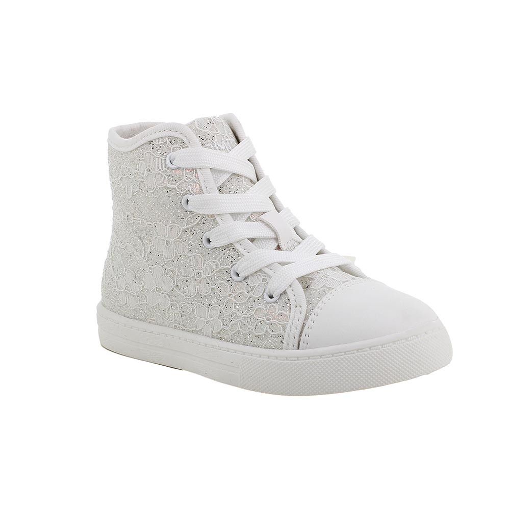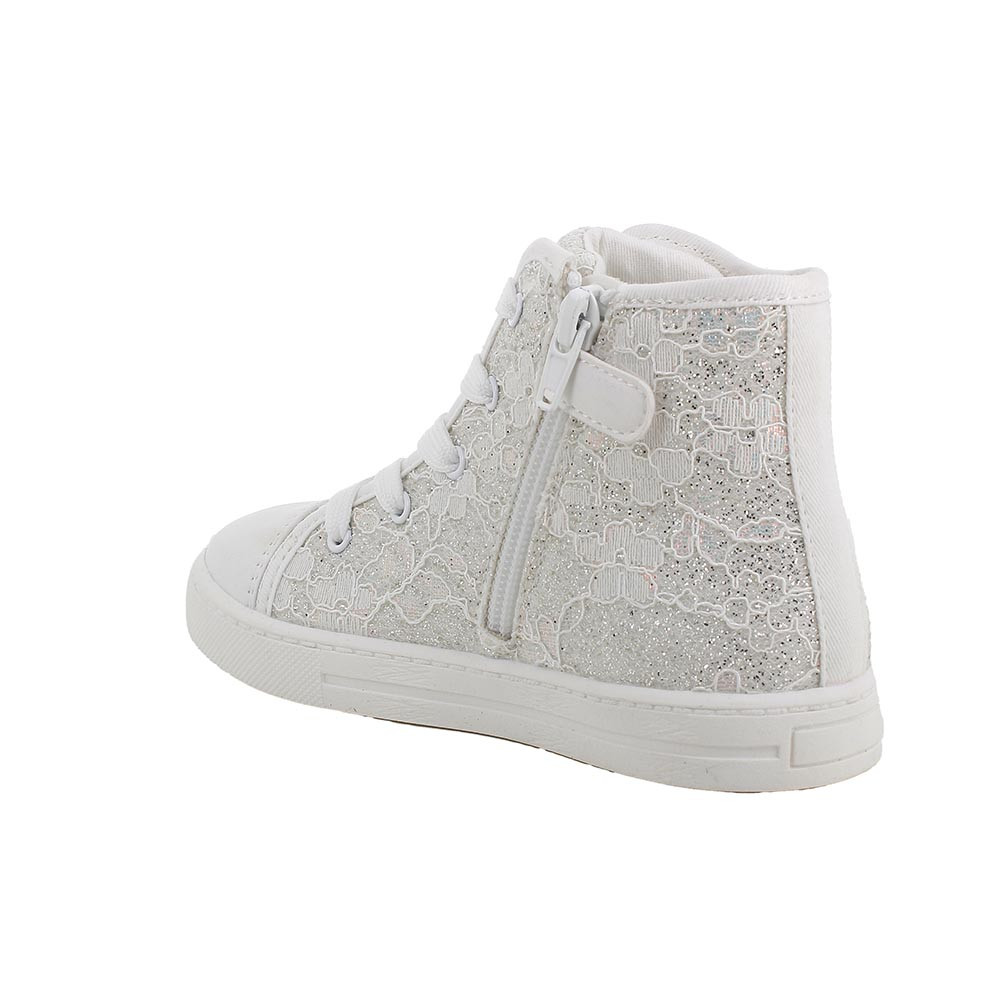 Baskets hautes pour fille en tissu. Faciles à assortir. En plus des lacets, elles disposent d'une fermeture éclair interne pratique. La semelle est plate avec une pointe arrondie. La semelle intérieure est amovible et recouverte de cuir pour garantir transpirabilité et hygiène.