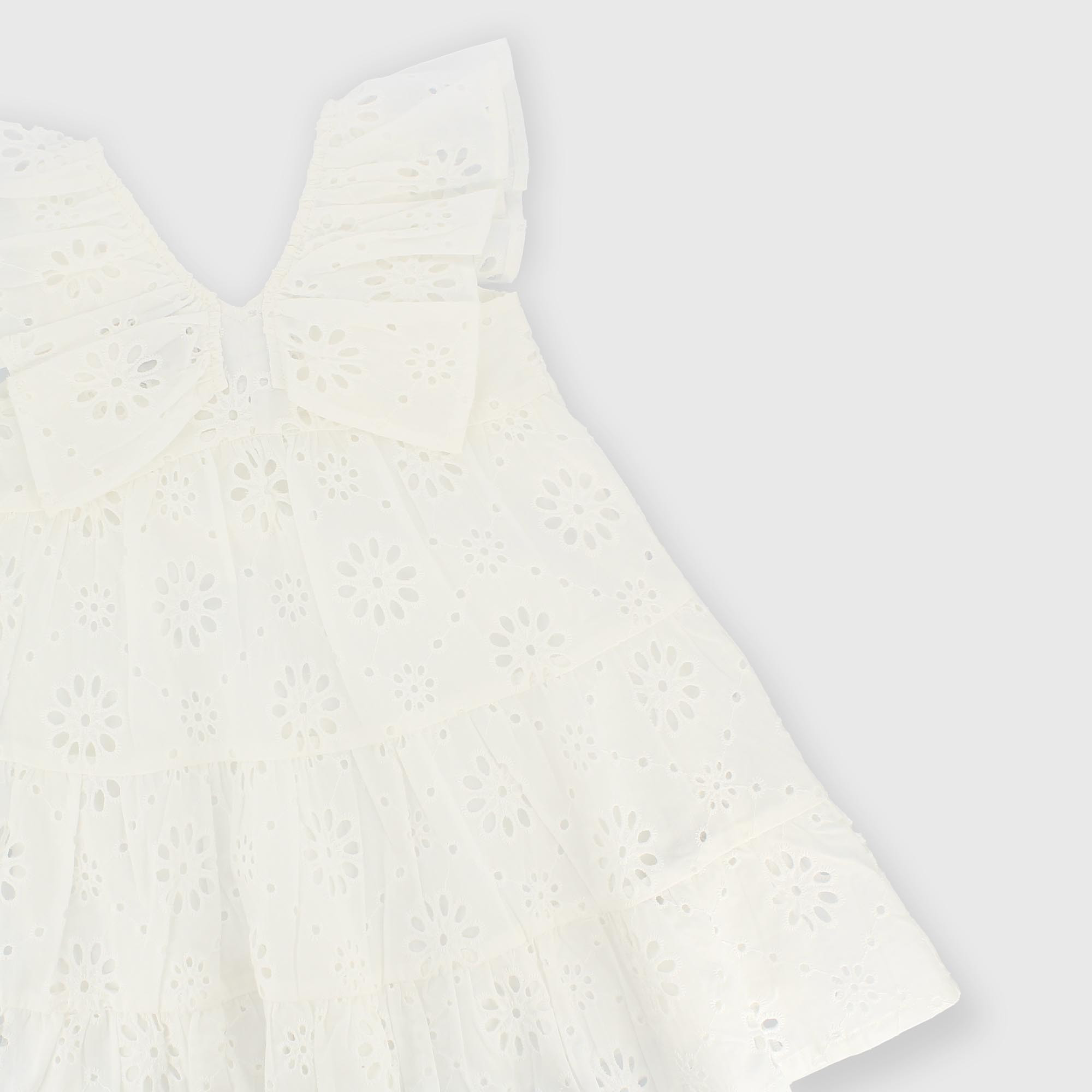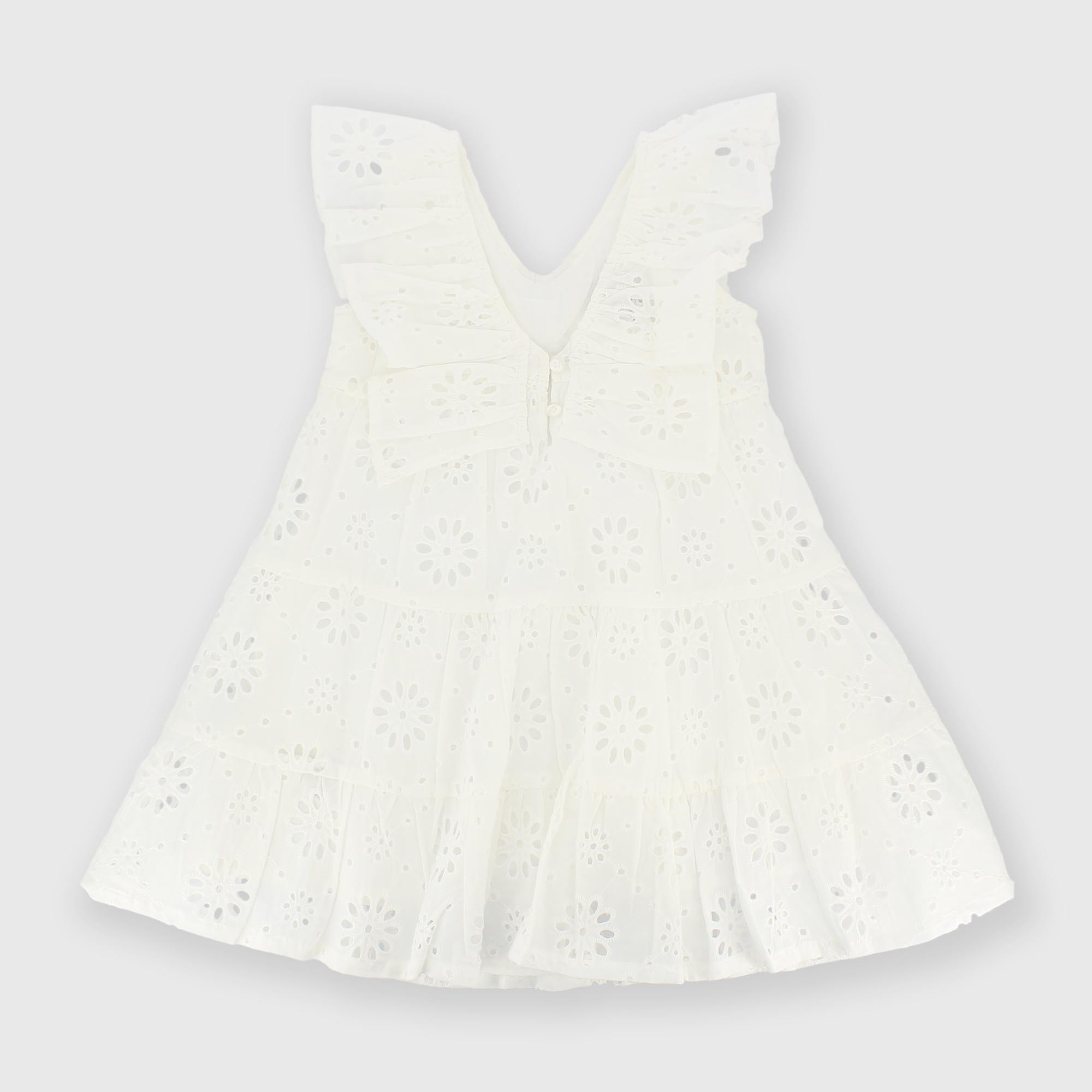 Robe en dentelle San-Gallo, décolleté en V. Volants sur le décolleté. Fermeture par petits boutons à l'arrière. Doublure intérieure.
