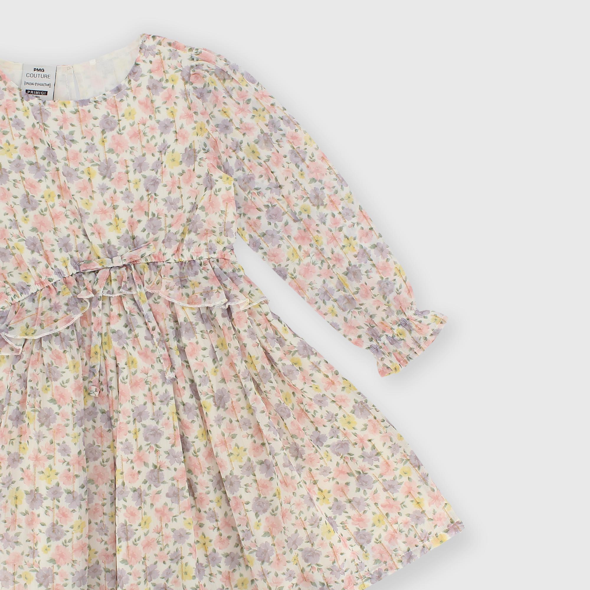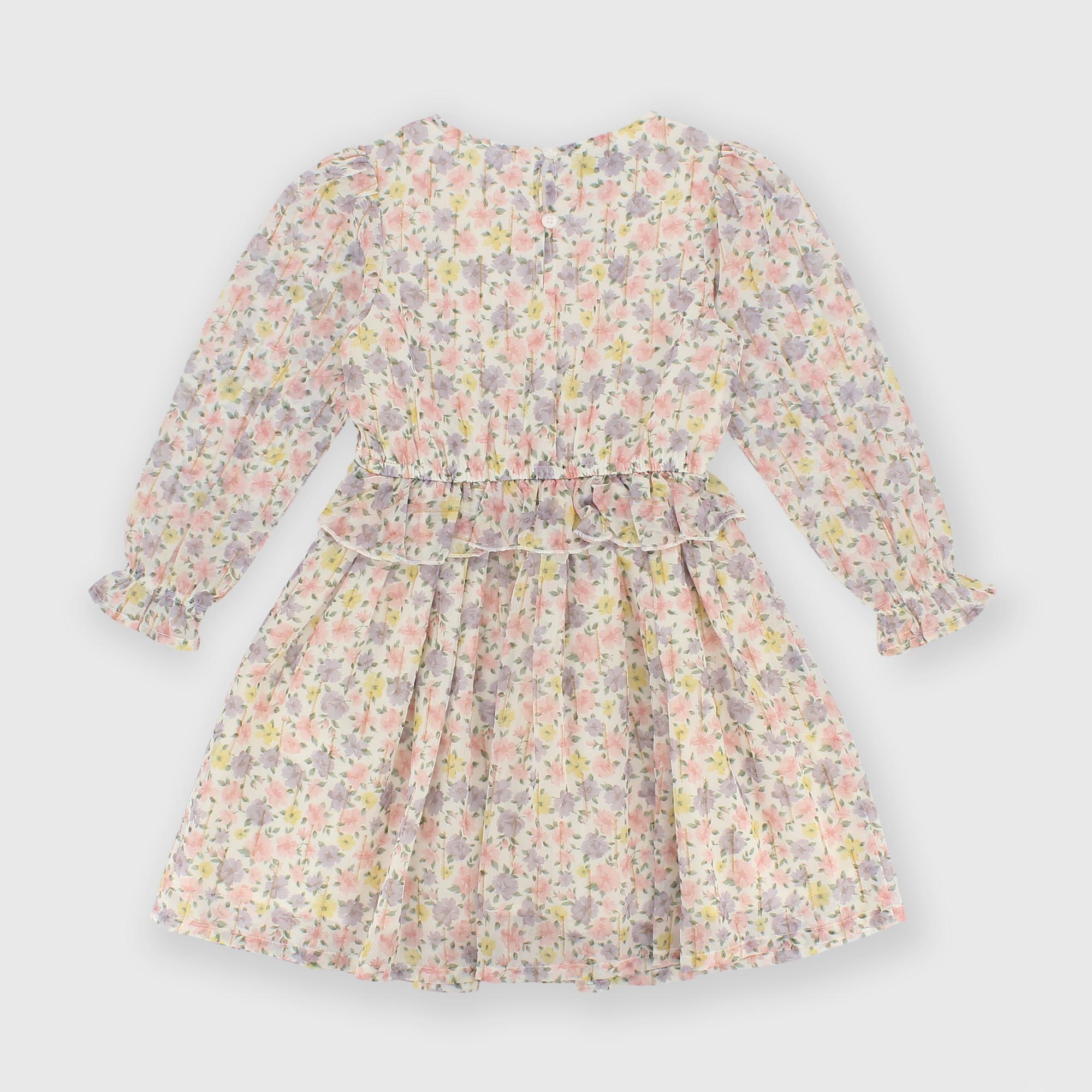 Robe en voile imprimé floral, col rond, manches longues. Fermeture au dos avec des petits boutons. Taille élastique avec un petit nœud appliqué. Volants insérés à la taille.
