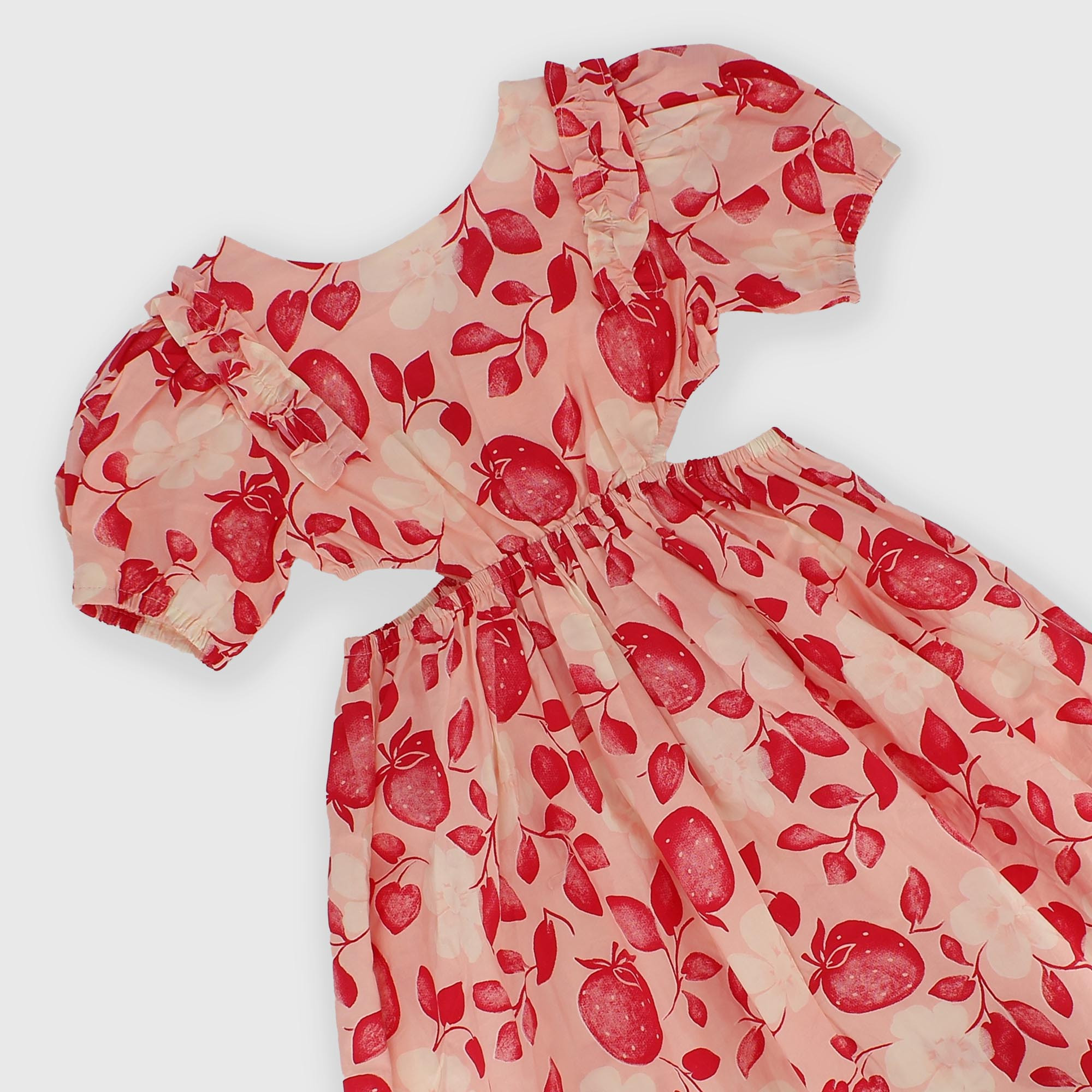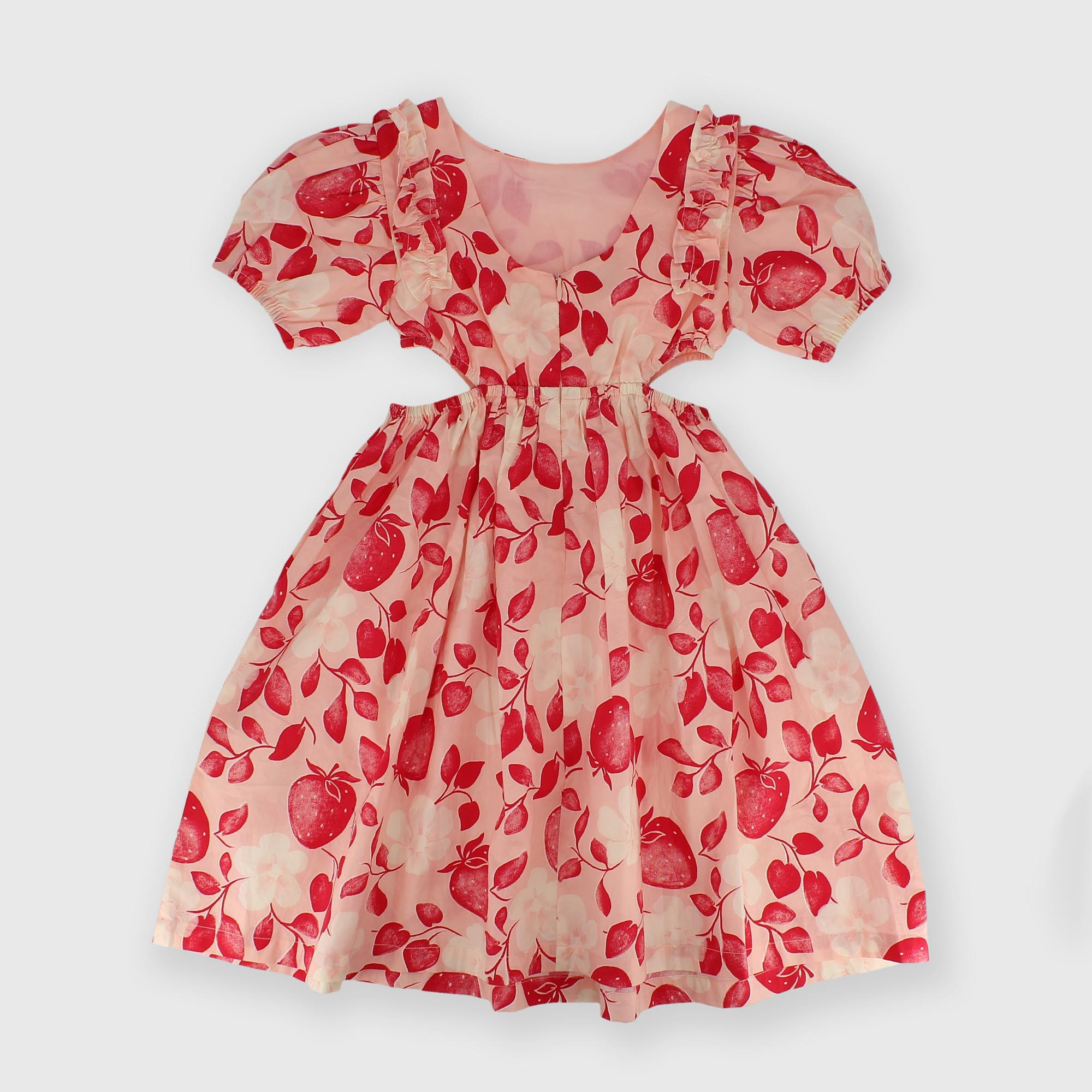 Robe en coton, encolure ronde, avec manches courtes bouffantes. Fermeture par zip invisible au dos. Jupe ample. Imprimé intégral.