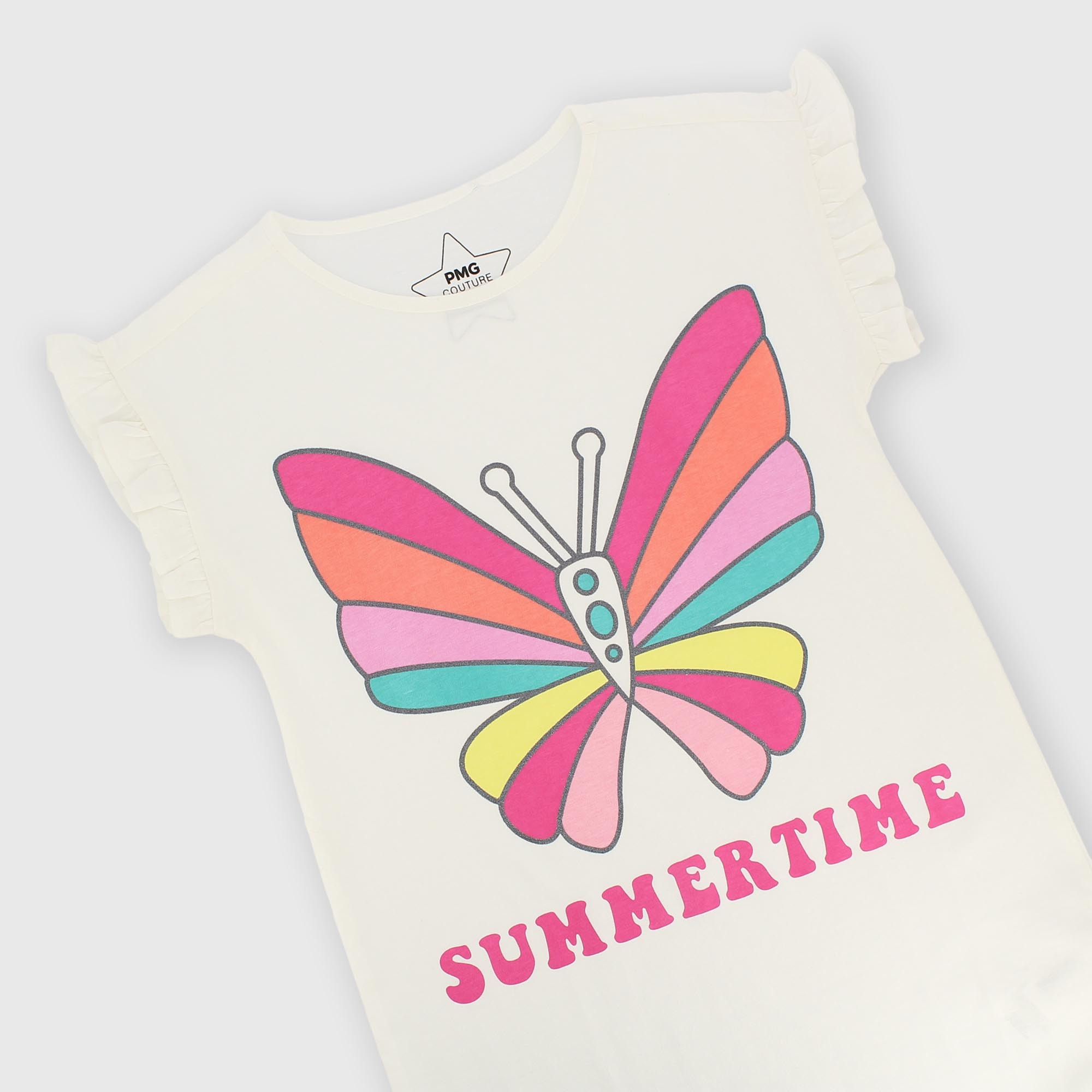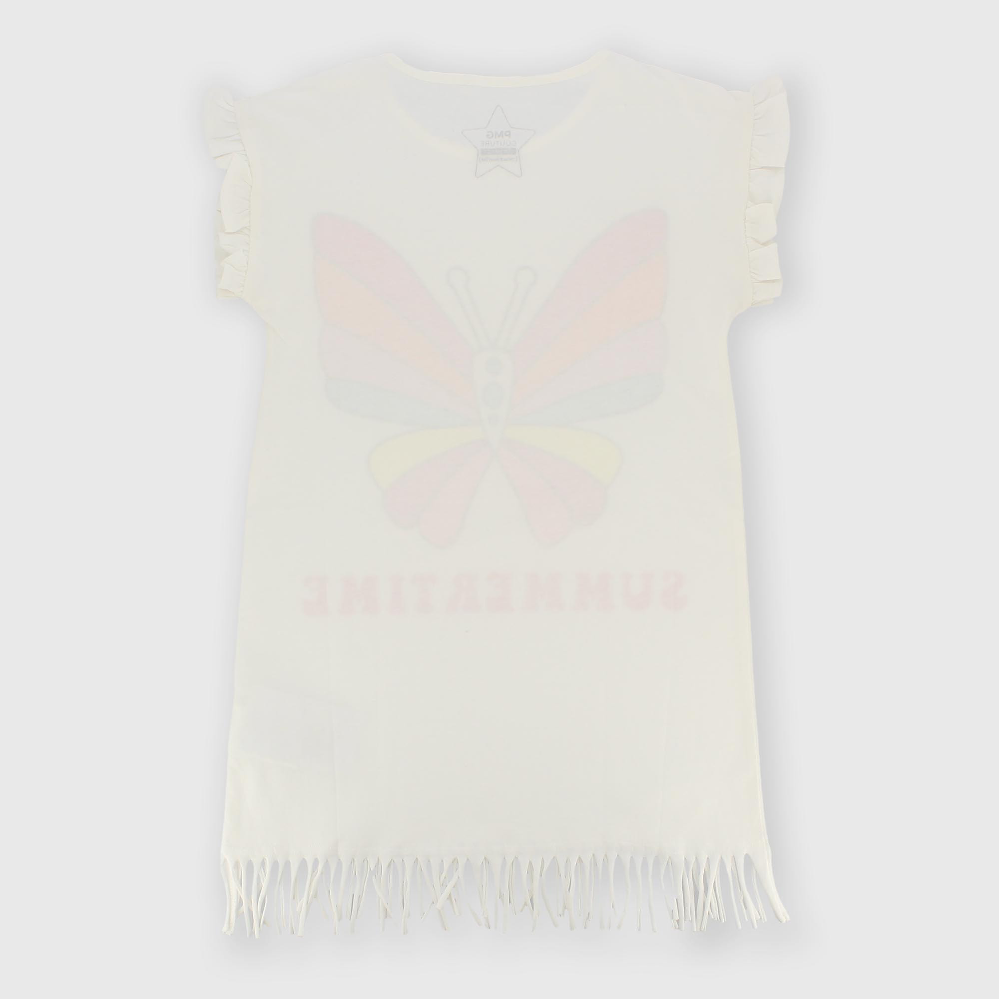 Paréo en jersey, col rond, manches courtes avec volants. Imprimé papillon sur le devant. Ourlet avec petites franges.