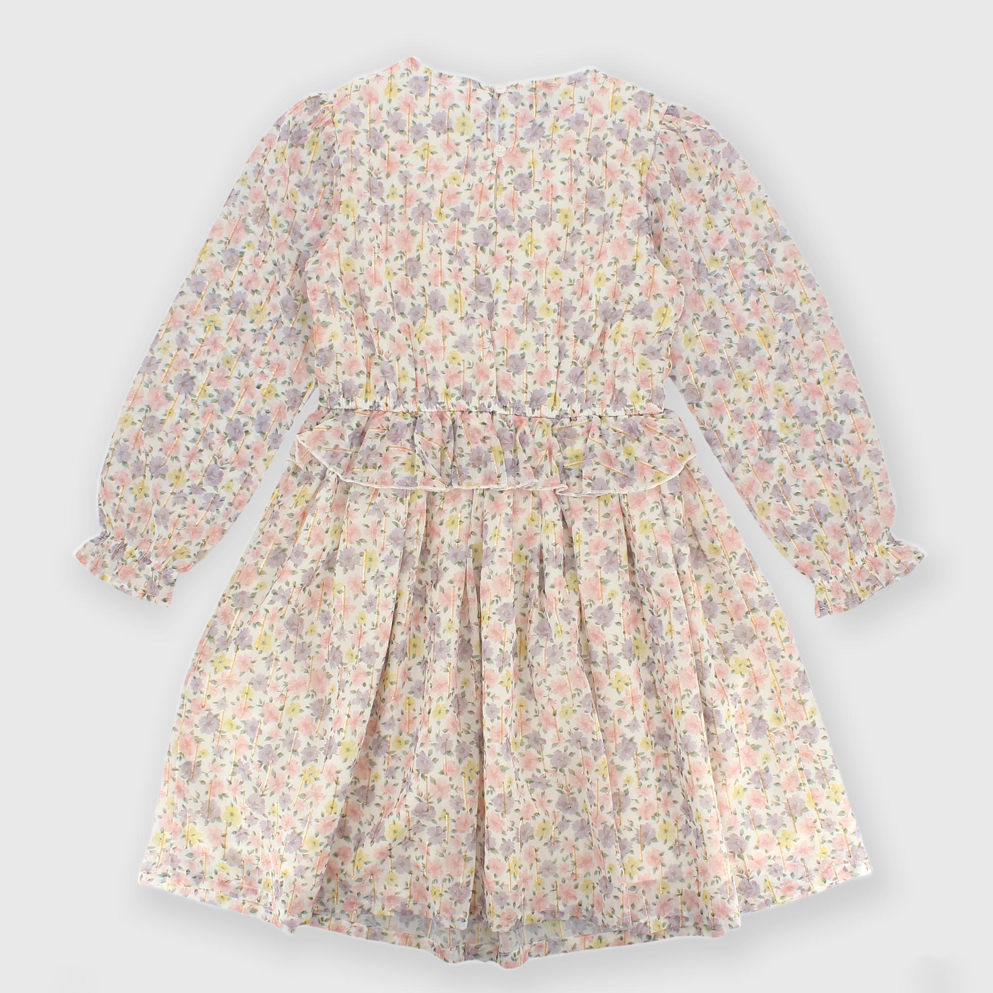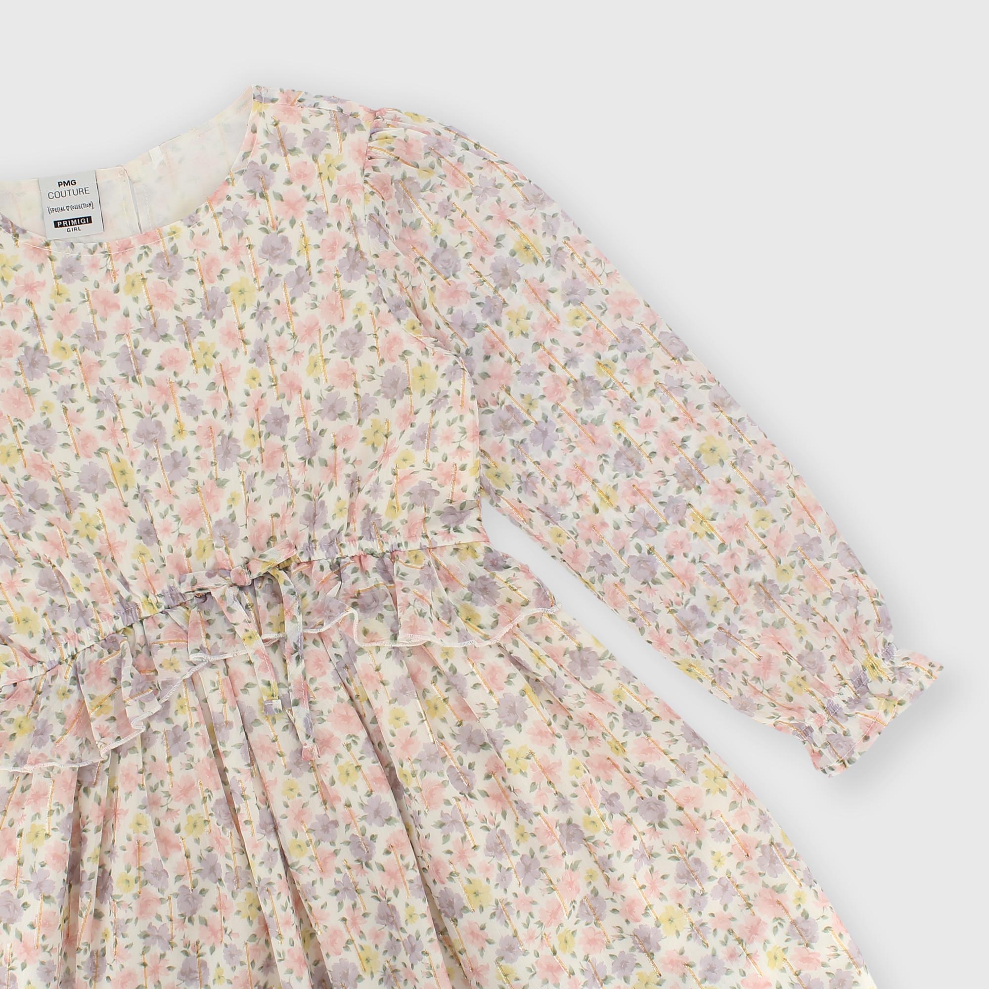 Robe en voile imprimé floral, col rond, manches longues. Fermeture au dos avec petits boutons. Taille élastique avec nœud appliqué. Volants insérés à la taille.