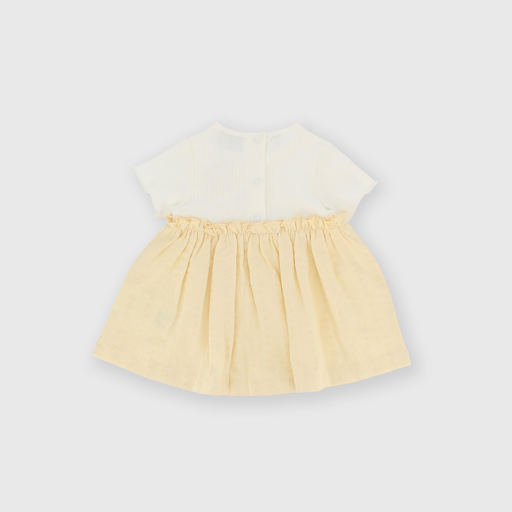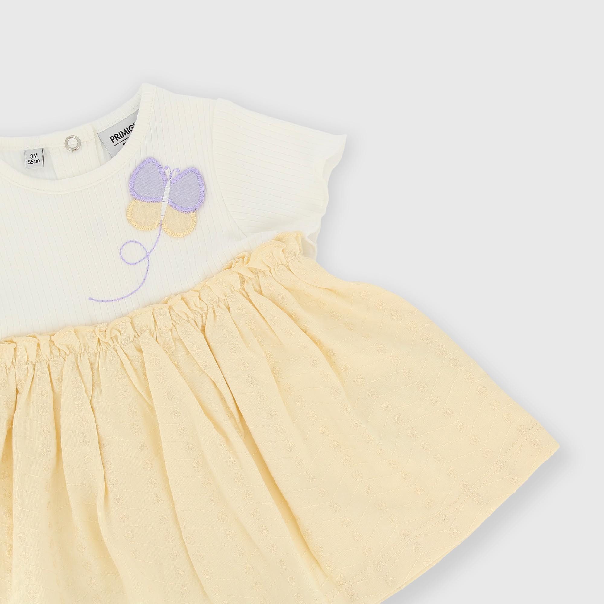 Robe côtelée et jersey, col rond, manches courtes. Fermeture par boutons-pression au dos. Papillon brodé appliqué sur la poitrine. Jupe avec petites broderies. Finitions au point de poupée.