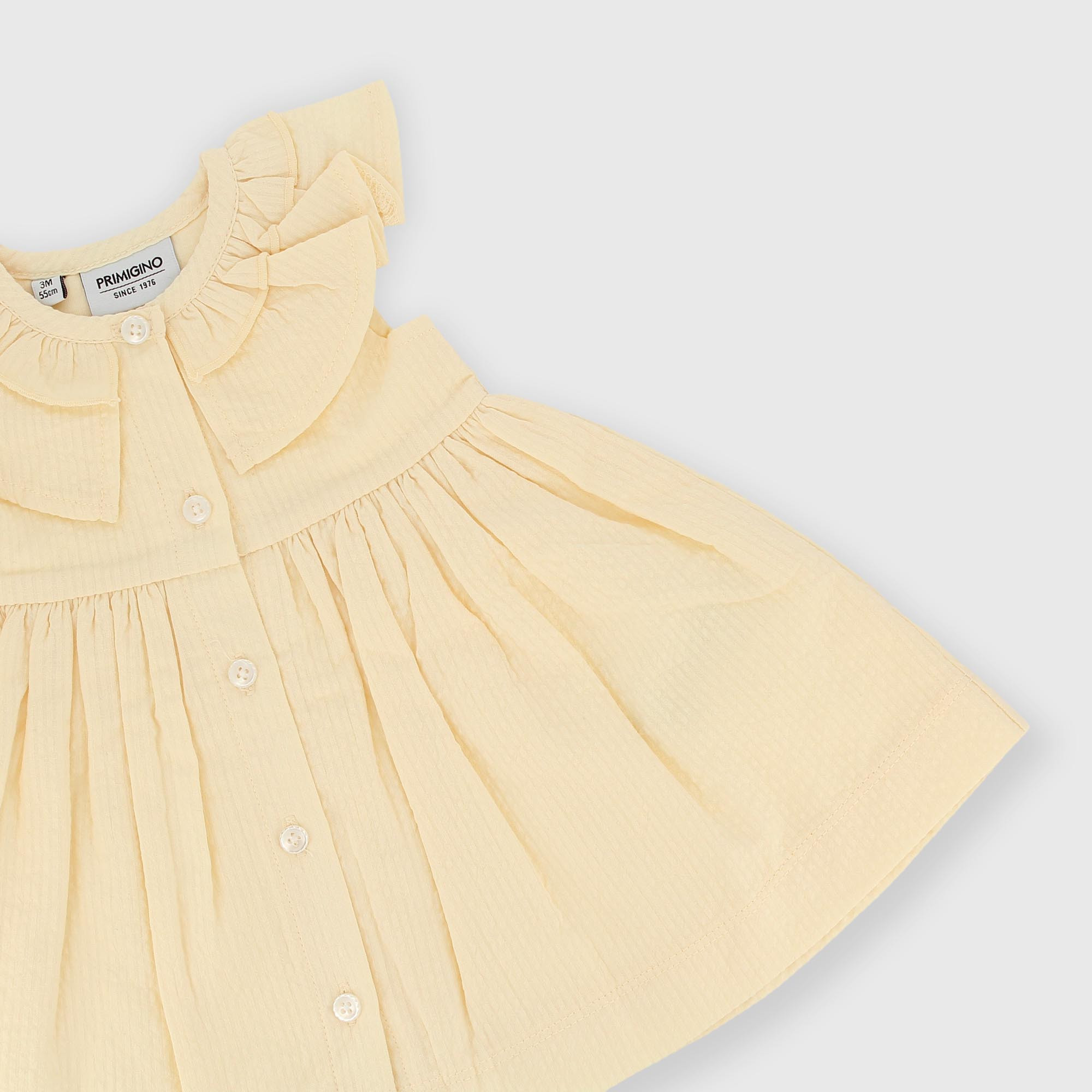 Robe, col rond, emmanchures. Volants à l’encolure. Fermeture bouton à l’avant. Doublure.