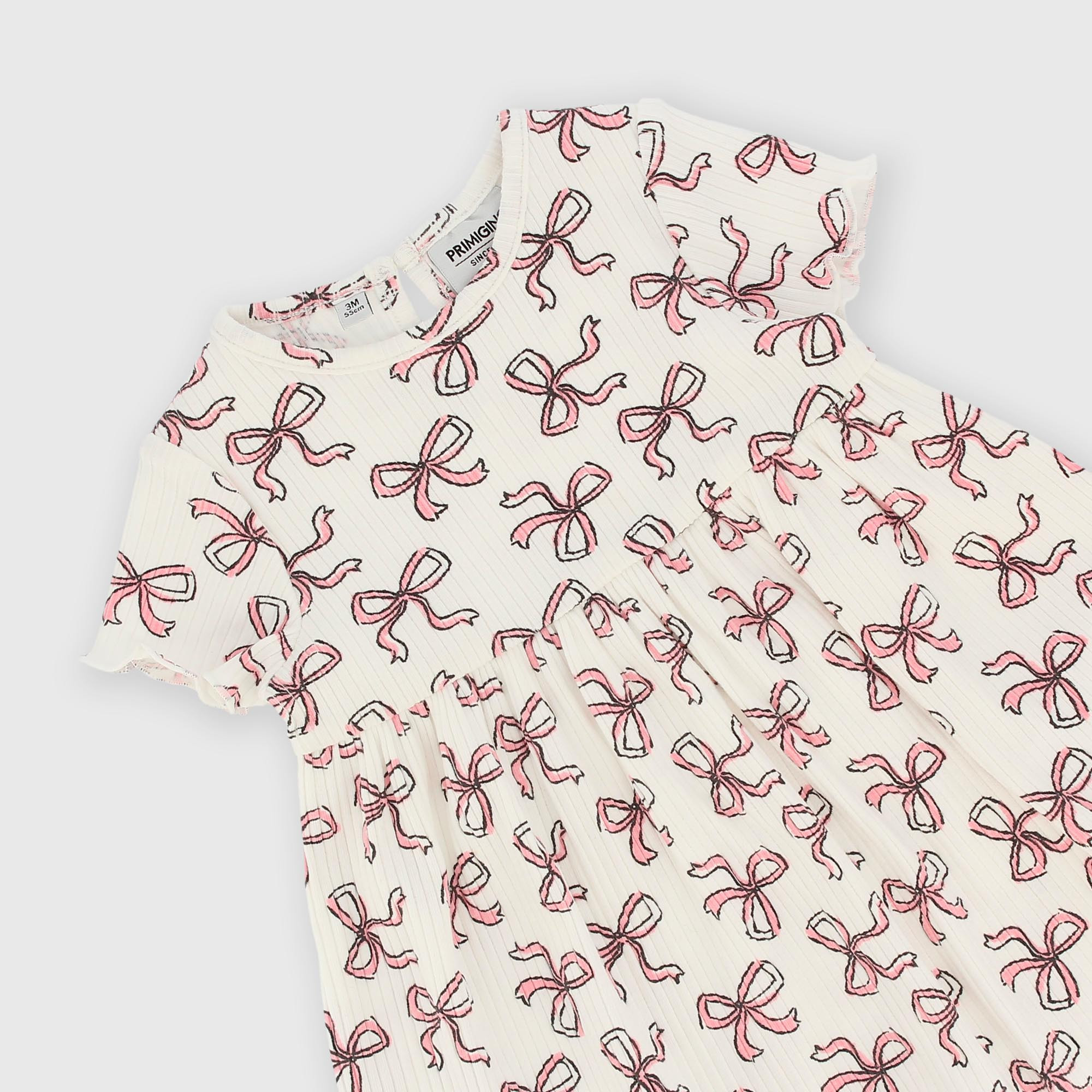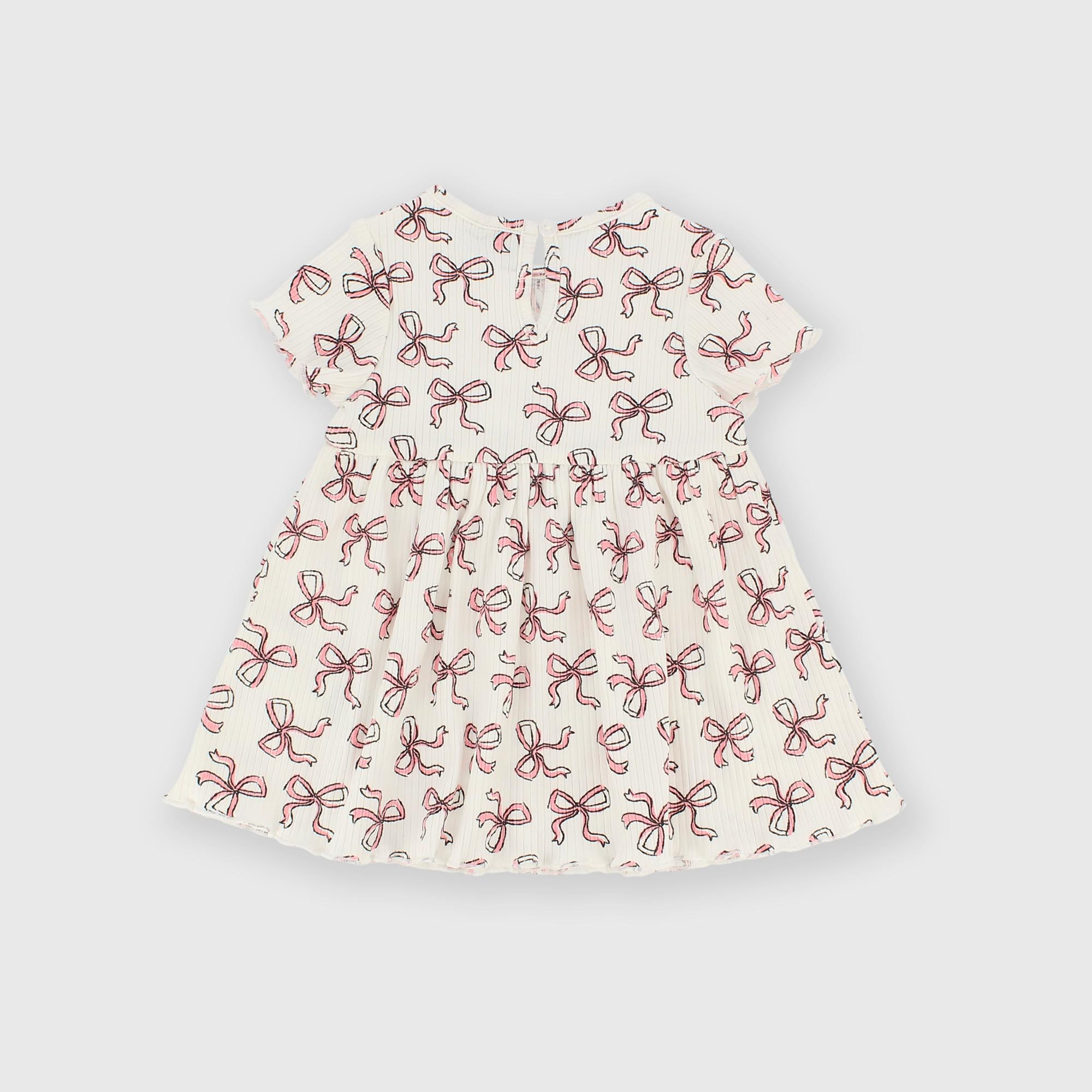 Robe côtelée, col rond, manches courtes. Fermeture à forme de goutte avec bouton à l'arrière. Imprimé floral intégral. Finitions avec point de poupée.