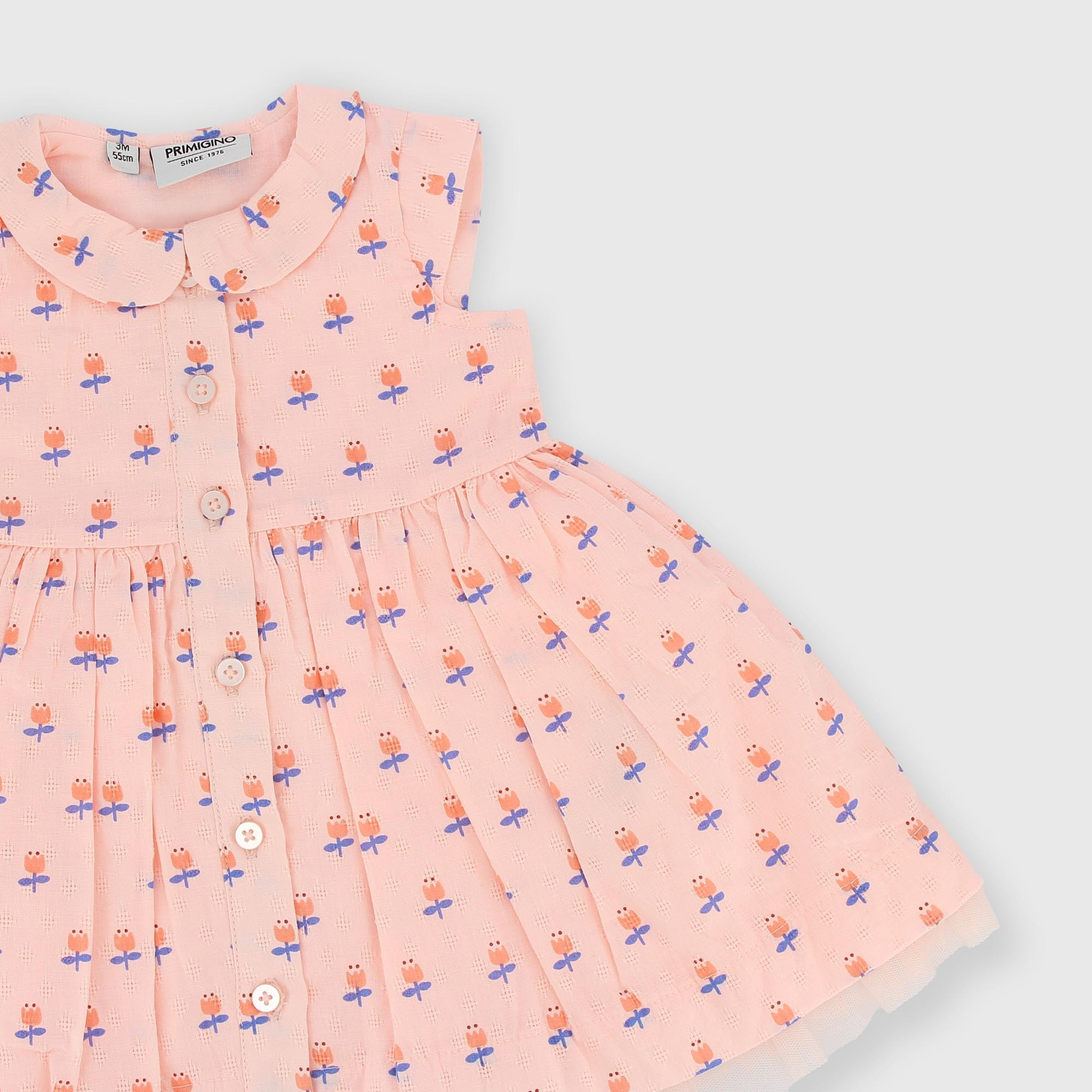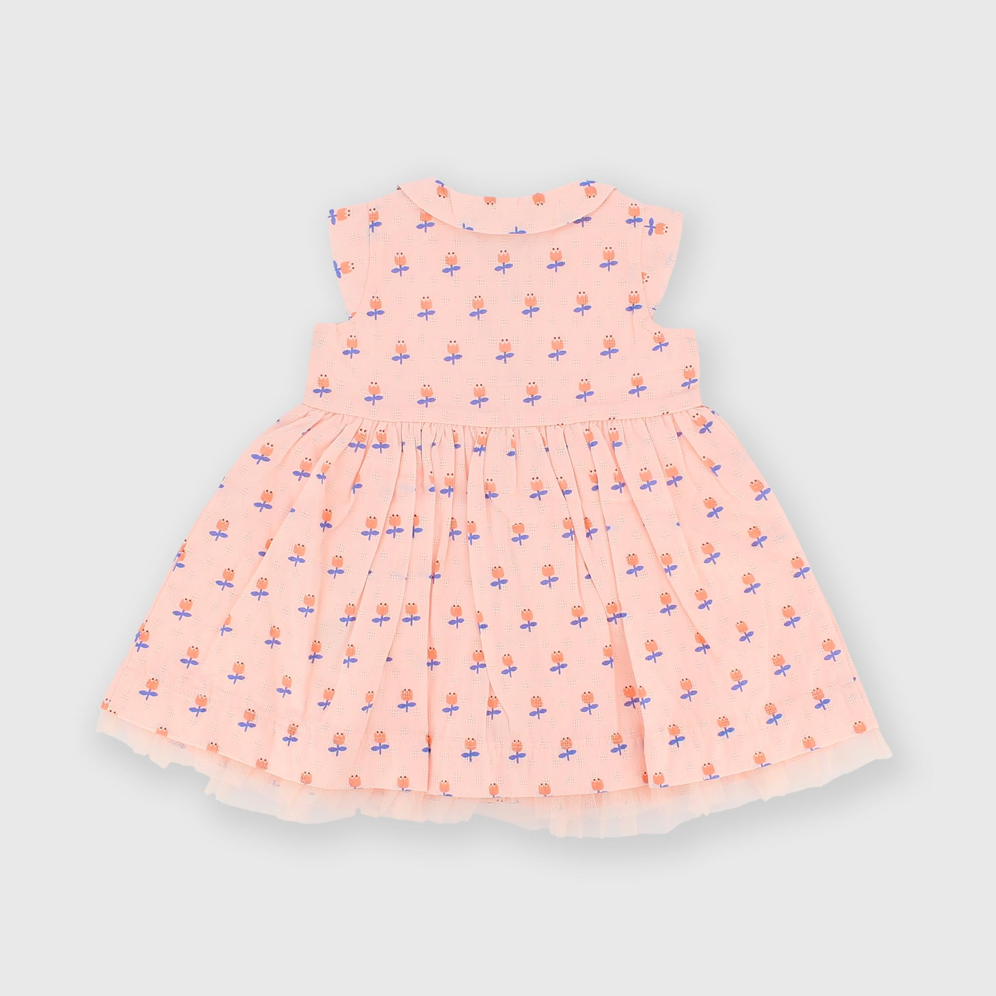 Robe avec col Peter Pan, à manches courtes. Boutonnage à l'avant. Imprimé fleuri intégral. Tulle au bas. Doublure intérieure.