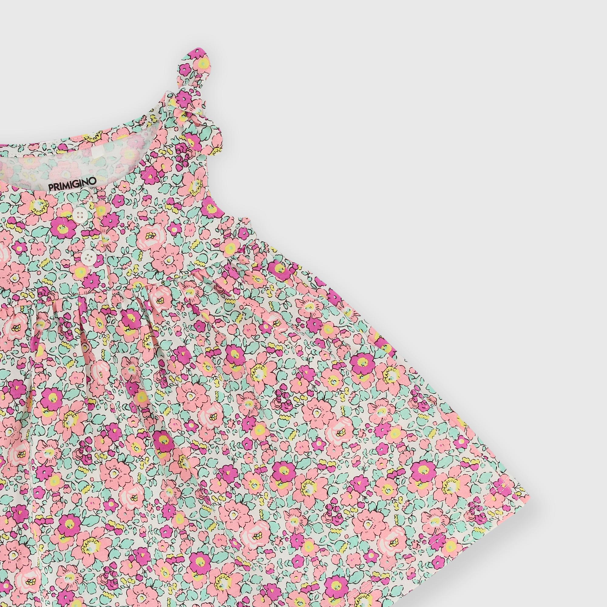 Paréo en jersey avec bretelles. Petits boutons à l'avant. Petits nœuds appliqués sur les épaules. Imprimé à fleurs partout.