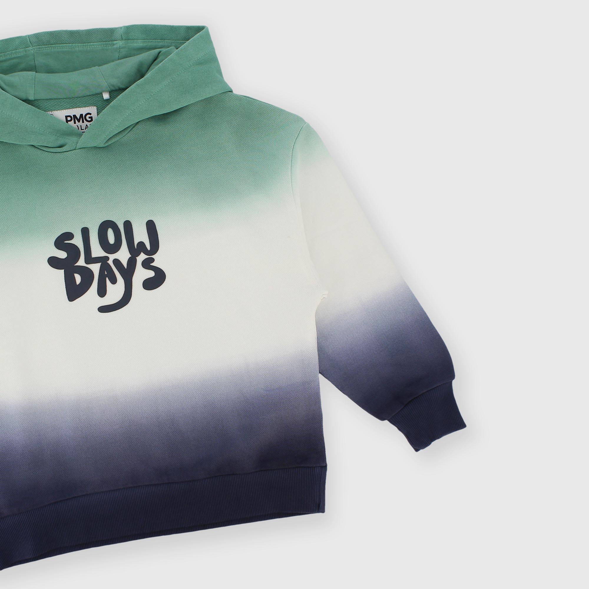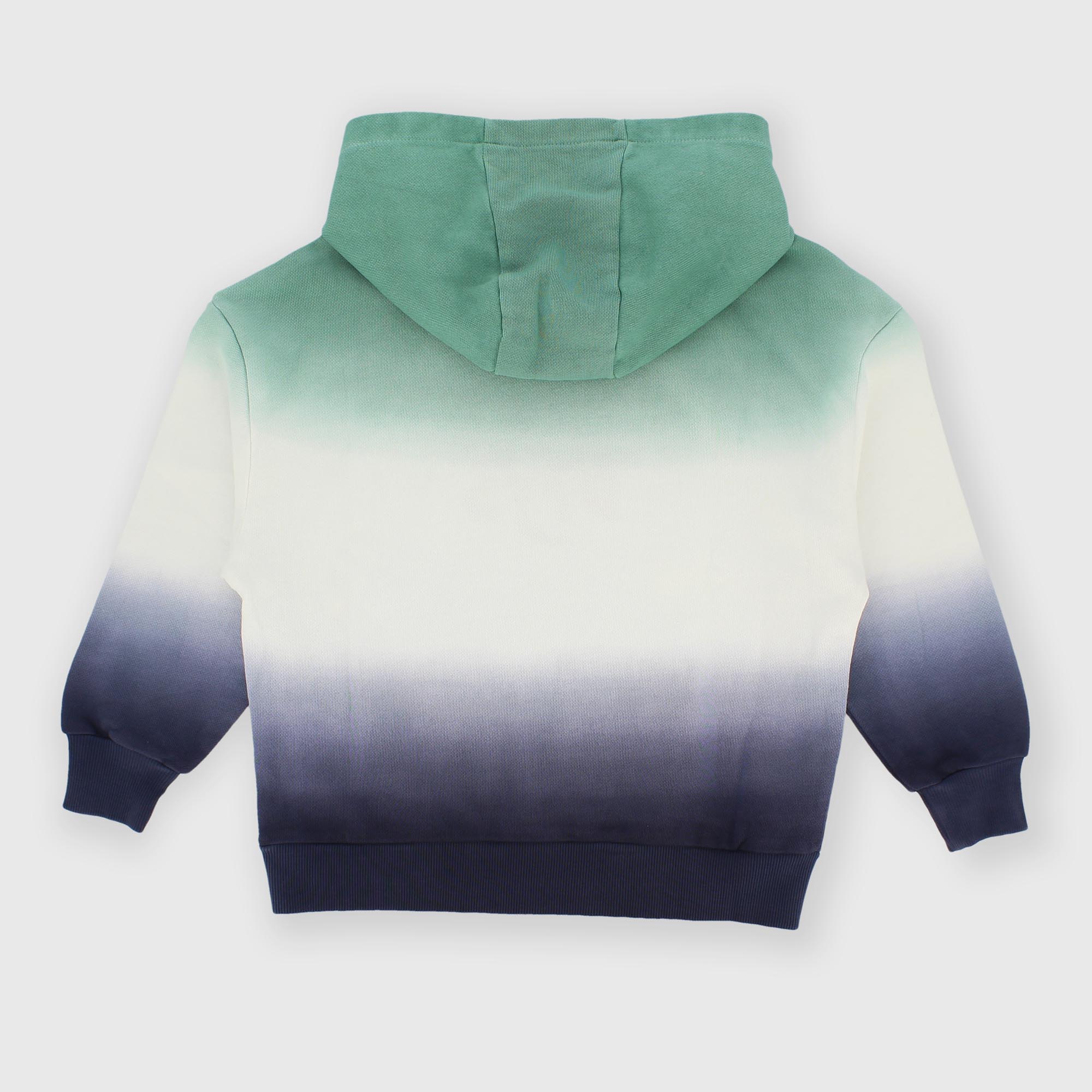 Sweatshirt dégradée à capuche, manches longues. Impression sur le devant. Poignets et bas côtelés.
