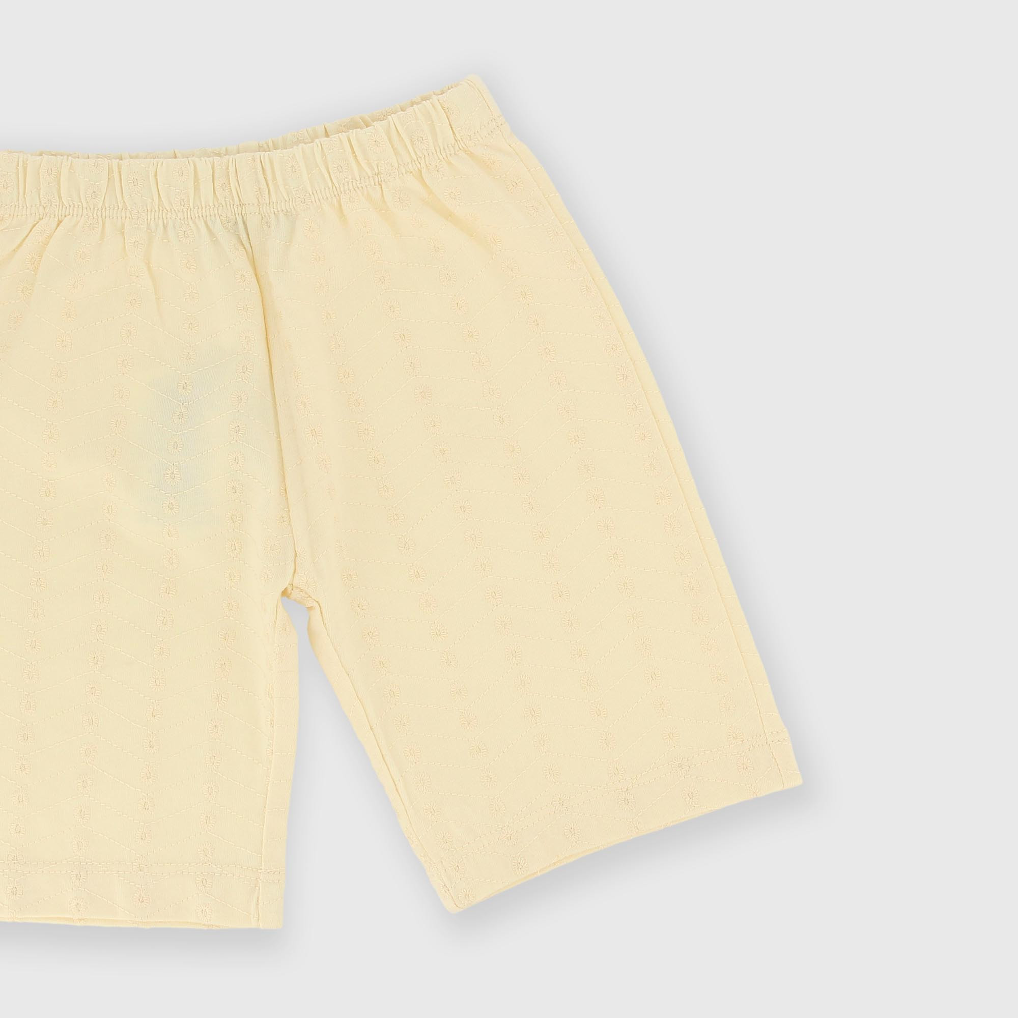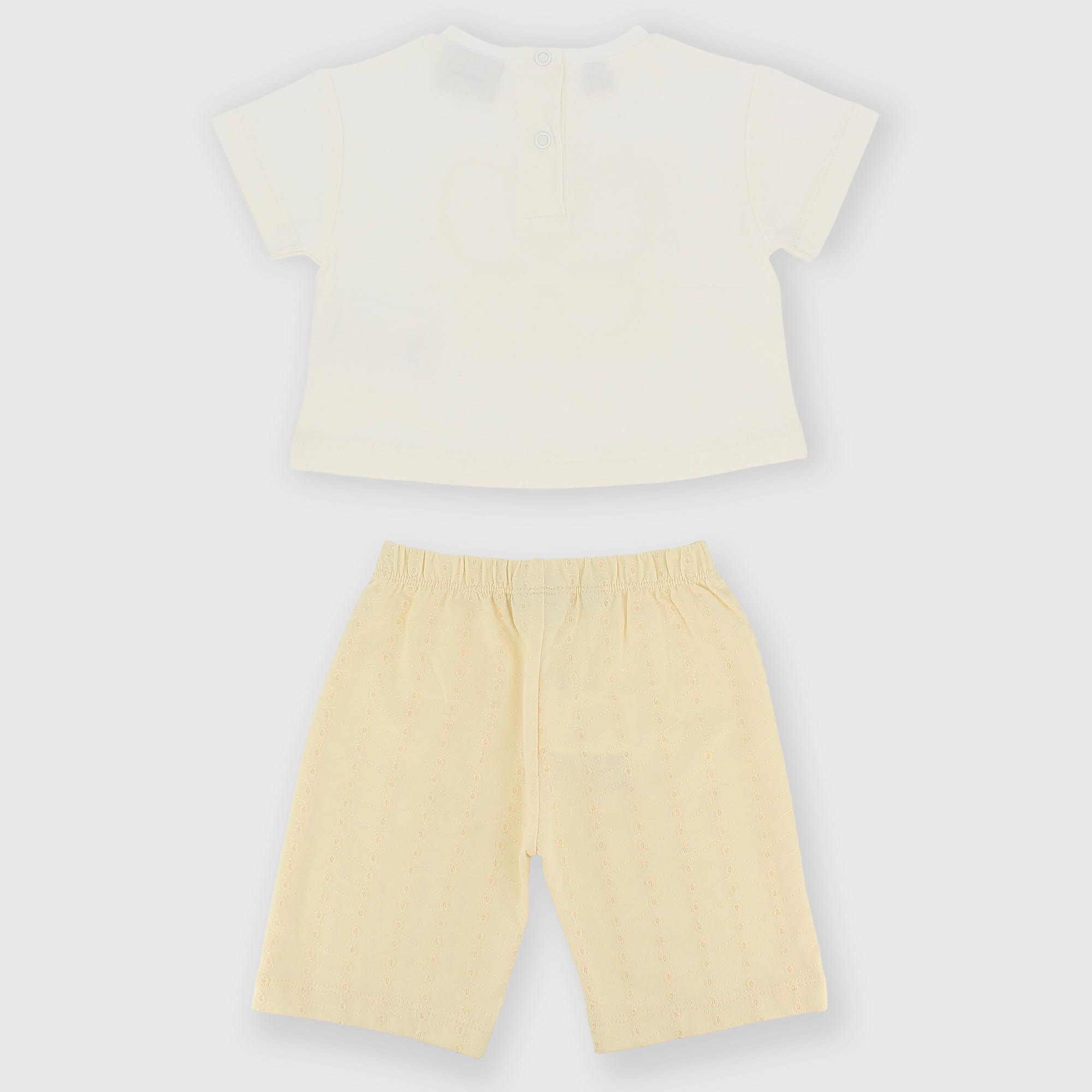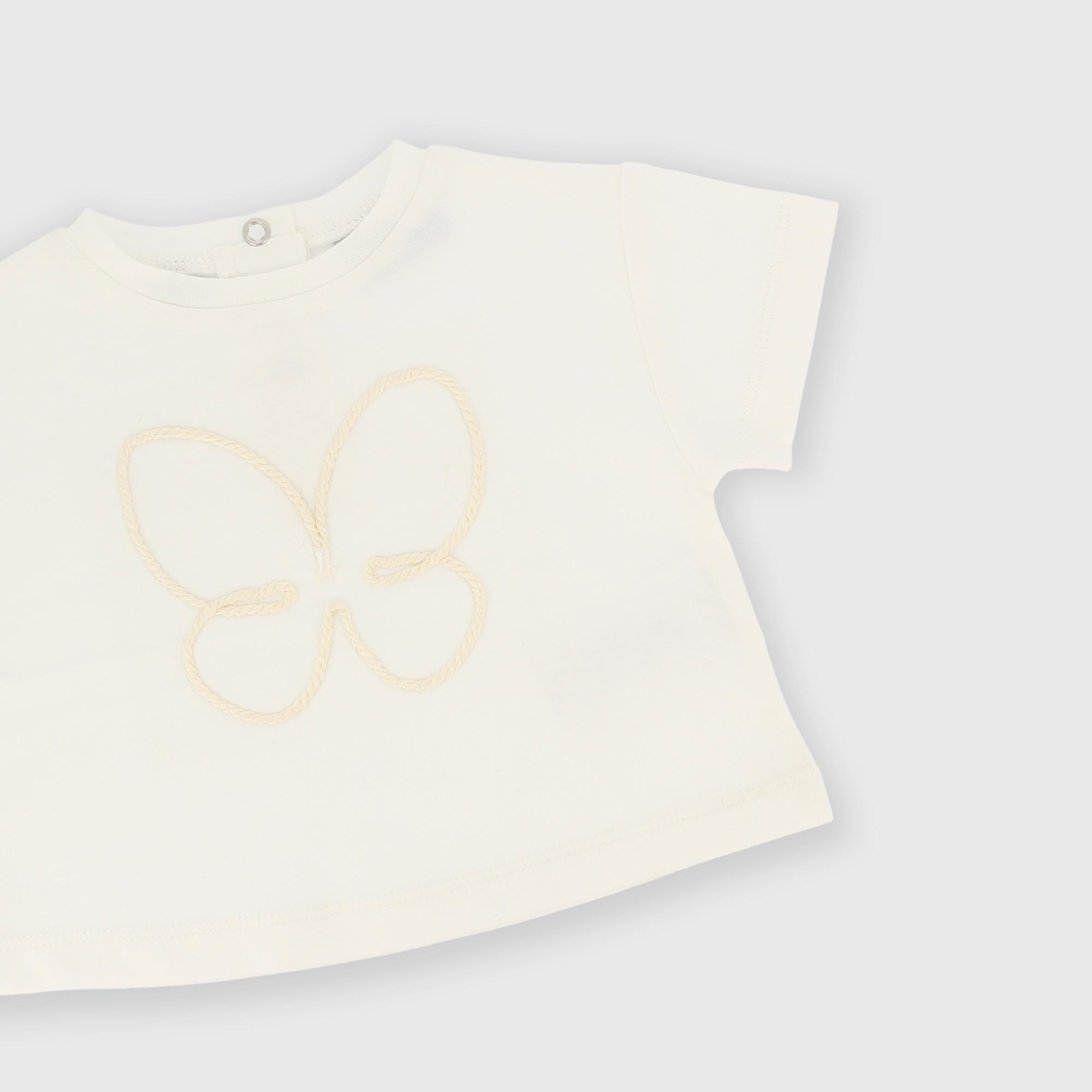 Ensemble en jersey composé de deux pièces. T-shirt à col rond et manches courtes. Fermeture à boutons-pression au dos. Papillon sur le devant. Pantalon en jersey brodé avec taille élastique.