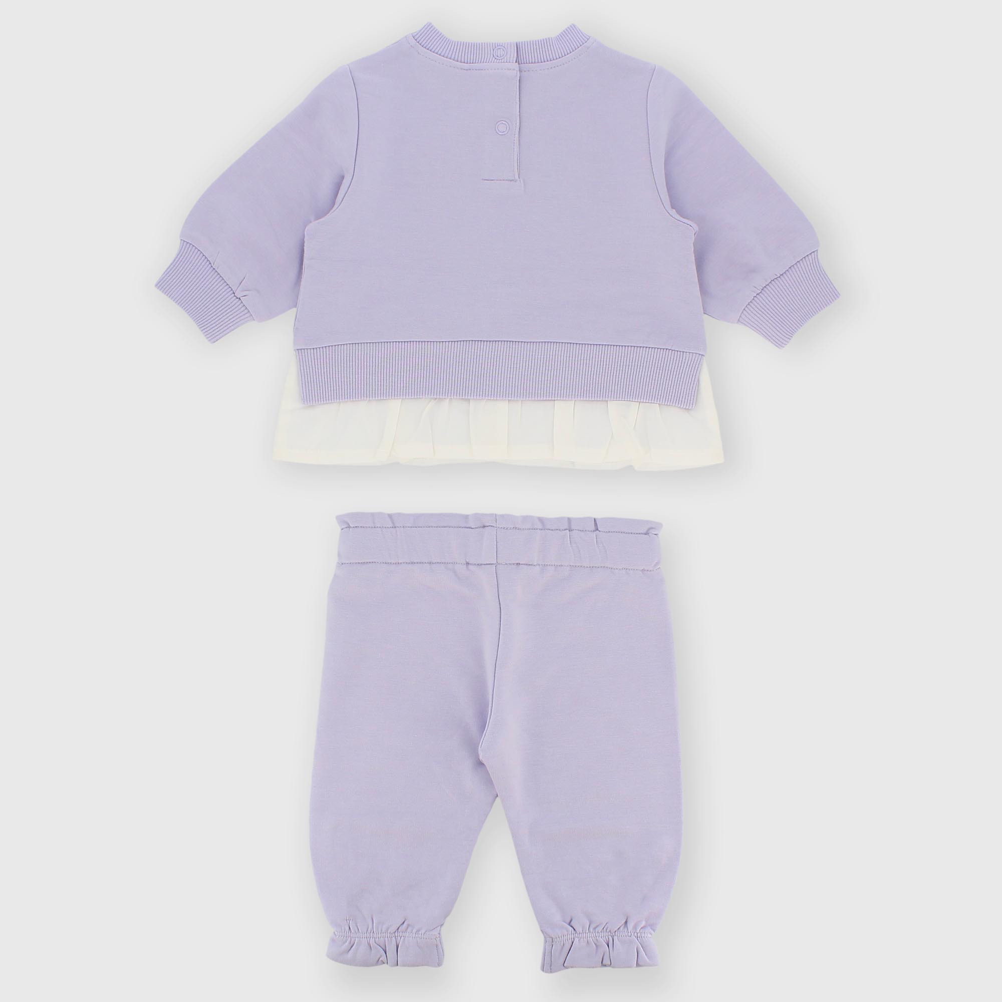 Ensemble composé de deux pièces. Sweat-shirt à col rond, manches longues. Fermeture par boutons-pression au dos. Broderies et appliques sur le devant. Empiècement fausse chemise. Col, poignets et bas côtelés. Pantalon en molleton avec taille élastiquée. Bas élastiqué avec petits volants.
