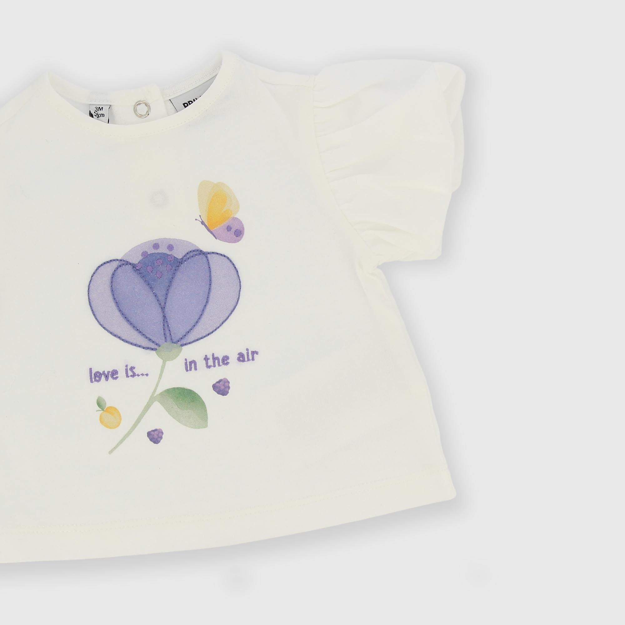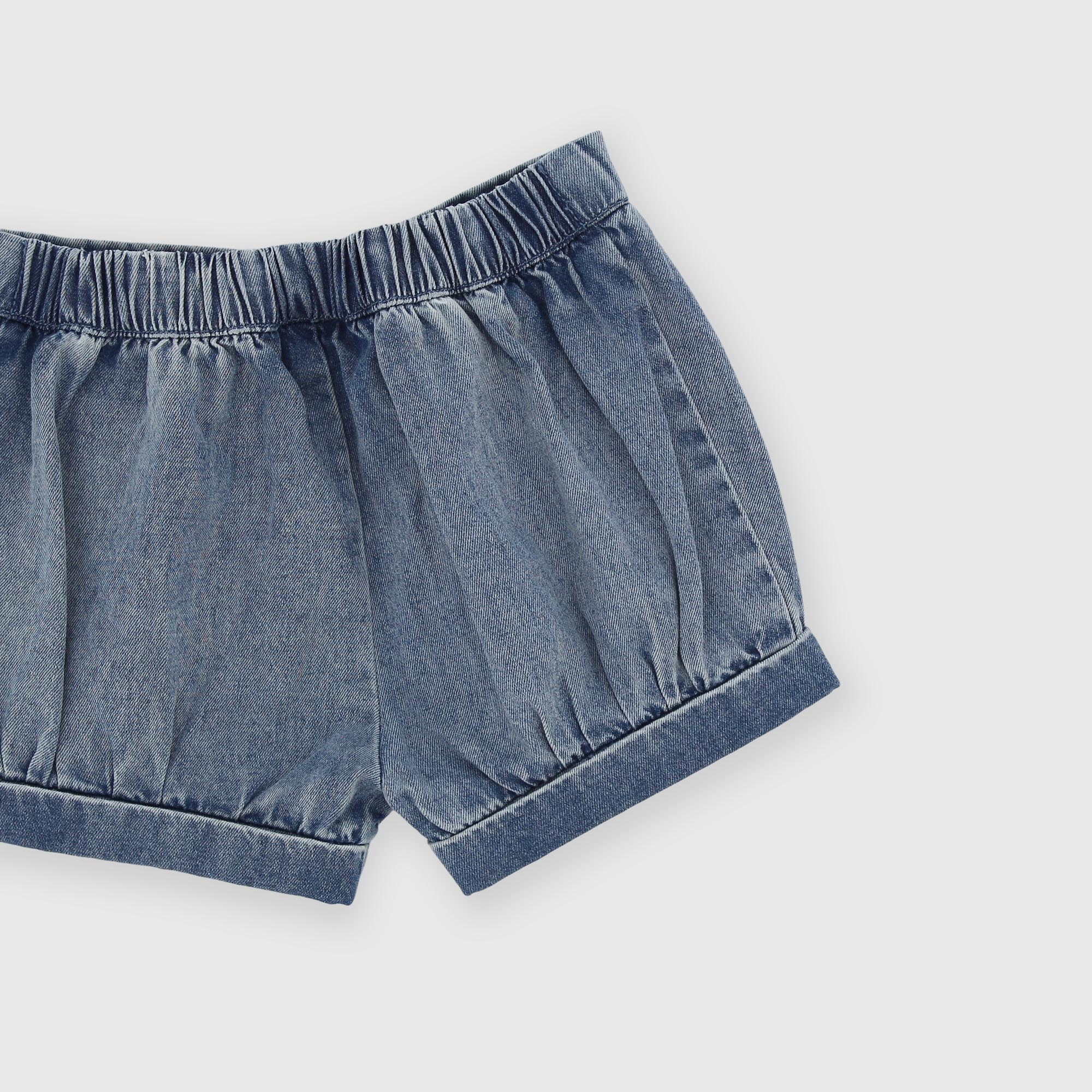 Ensemble composé de deux pièces. T-shirt en jersey à col rond, manches courtes bouffantes. Fermeture au dos avec boutons pression. Imprimés et broderies sur le devant. Short en jean avec taille élastique.