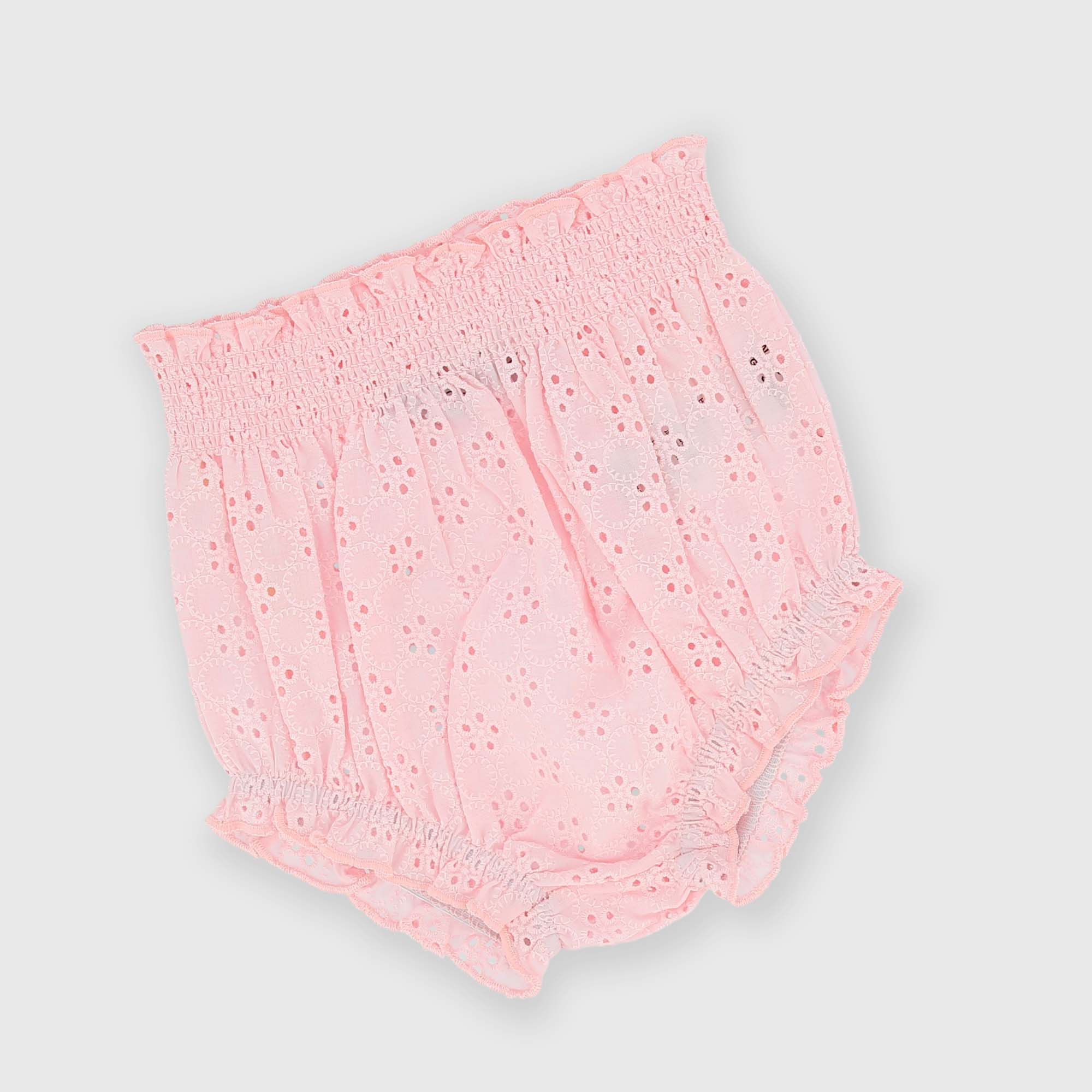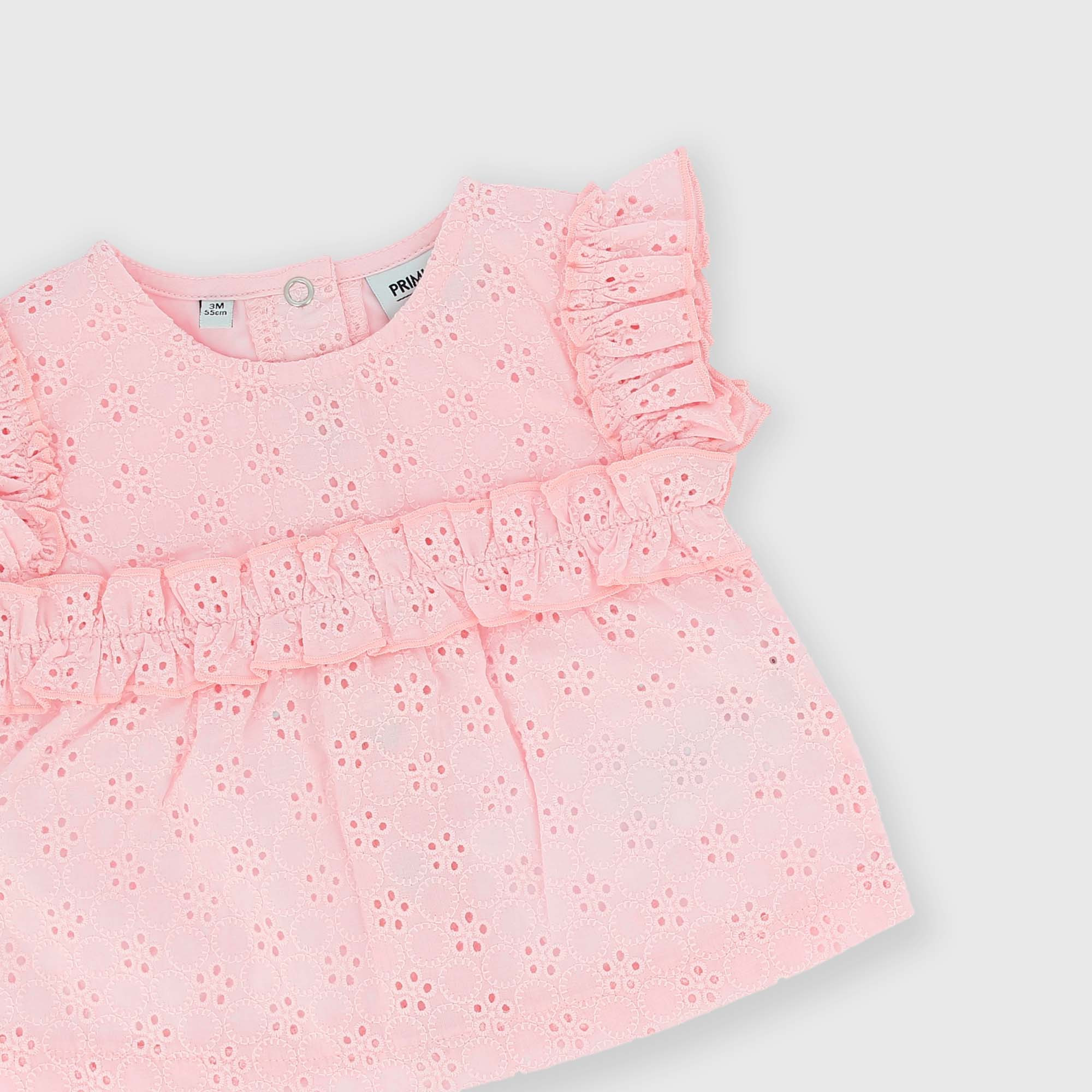 Complet en dentelle San Gallo composé de deux pièces. Maillot avec volants sur les épaules et sur poitrine. Fermeture derrière avec boutons pression. Slip avec taille élastique.