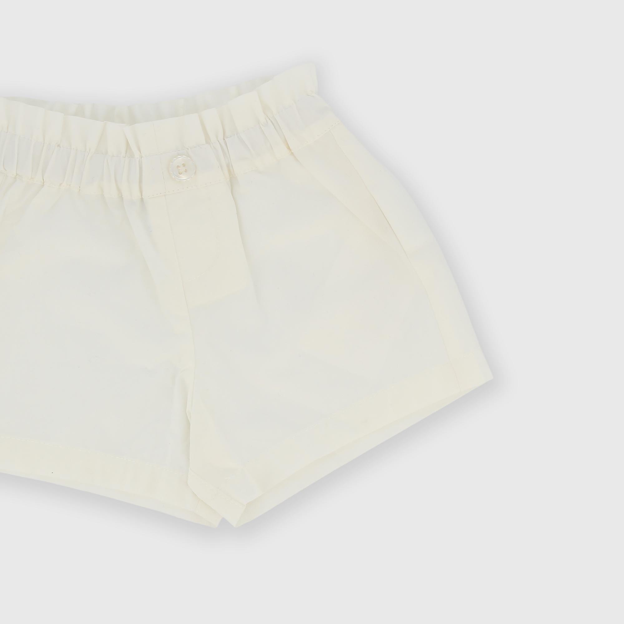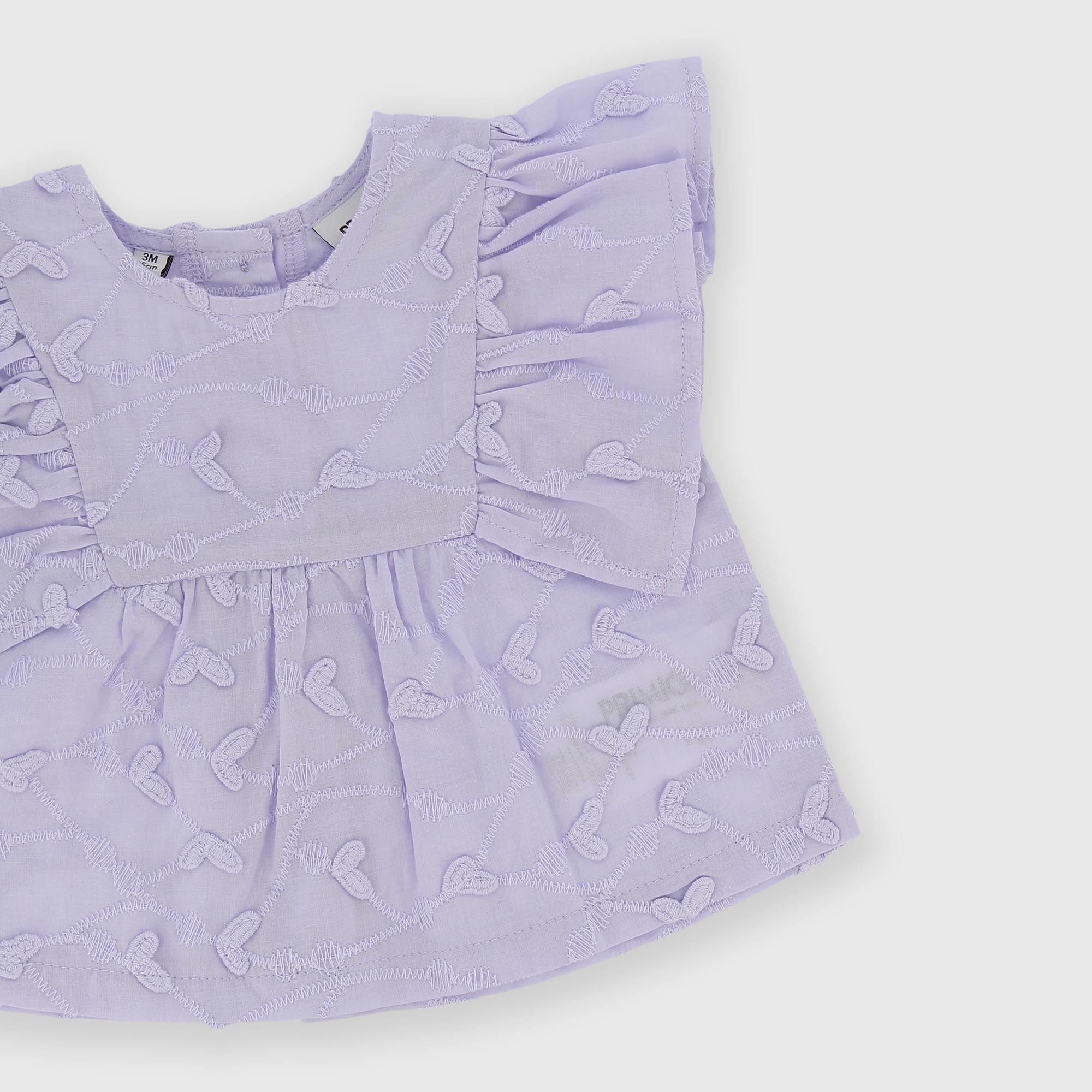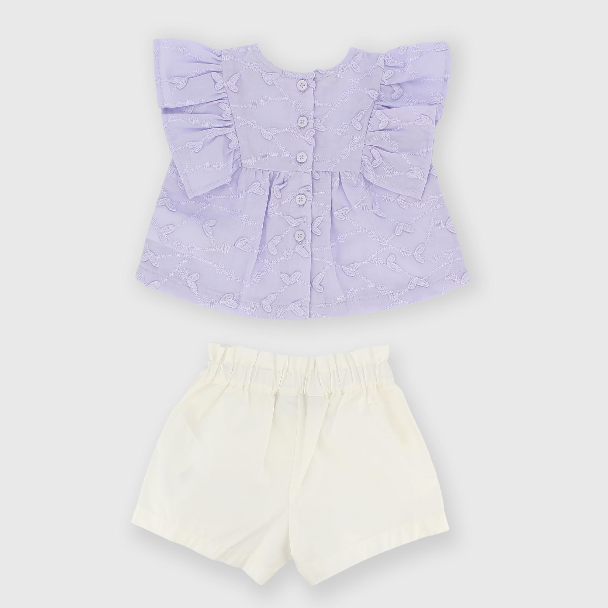 Ensemble complet composé de deux pièces. Blouse à col rond avec volants sur les épaules. Fermeture arrière avec petits boutons. Broderie et appliques en forme de cœur ton sur ton. Short avec taille élastiquée et petit bouton.