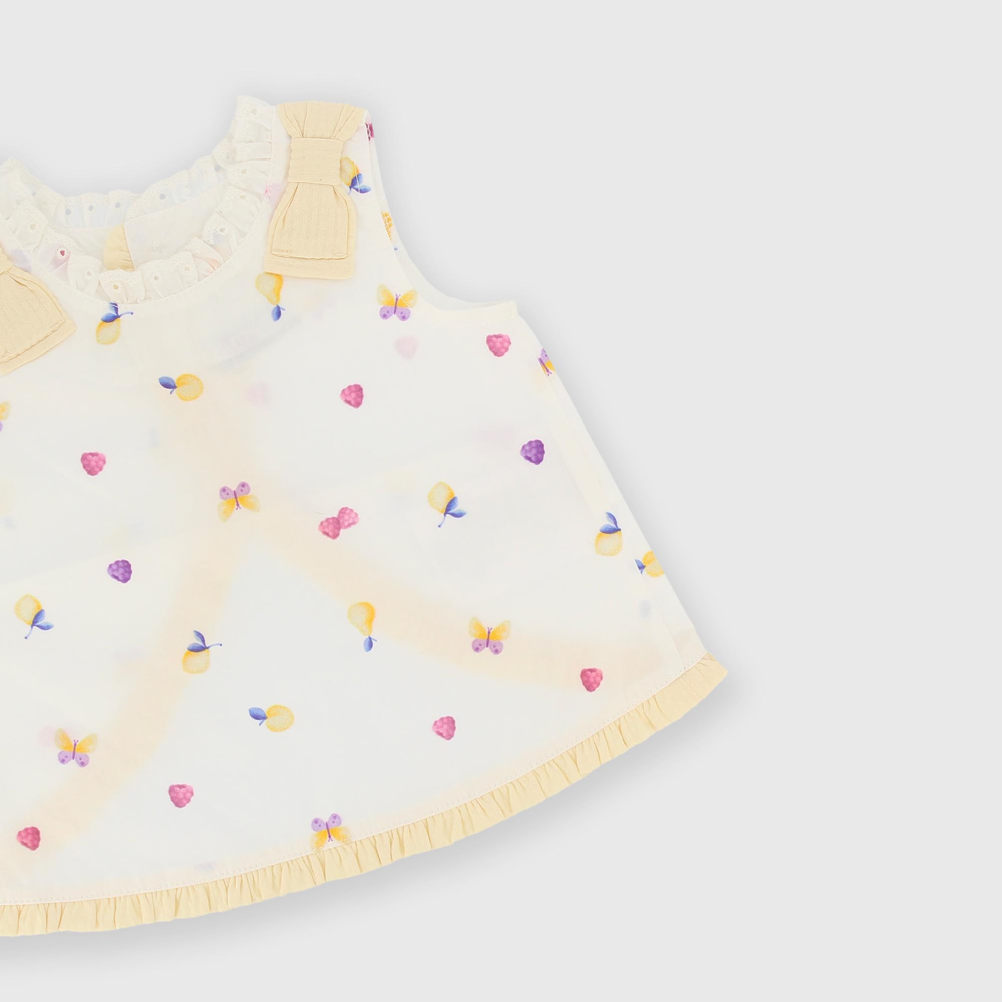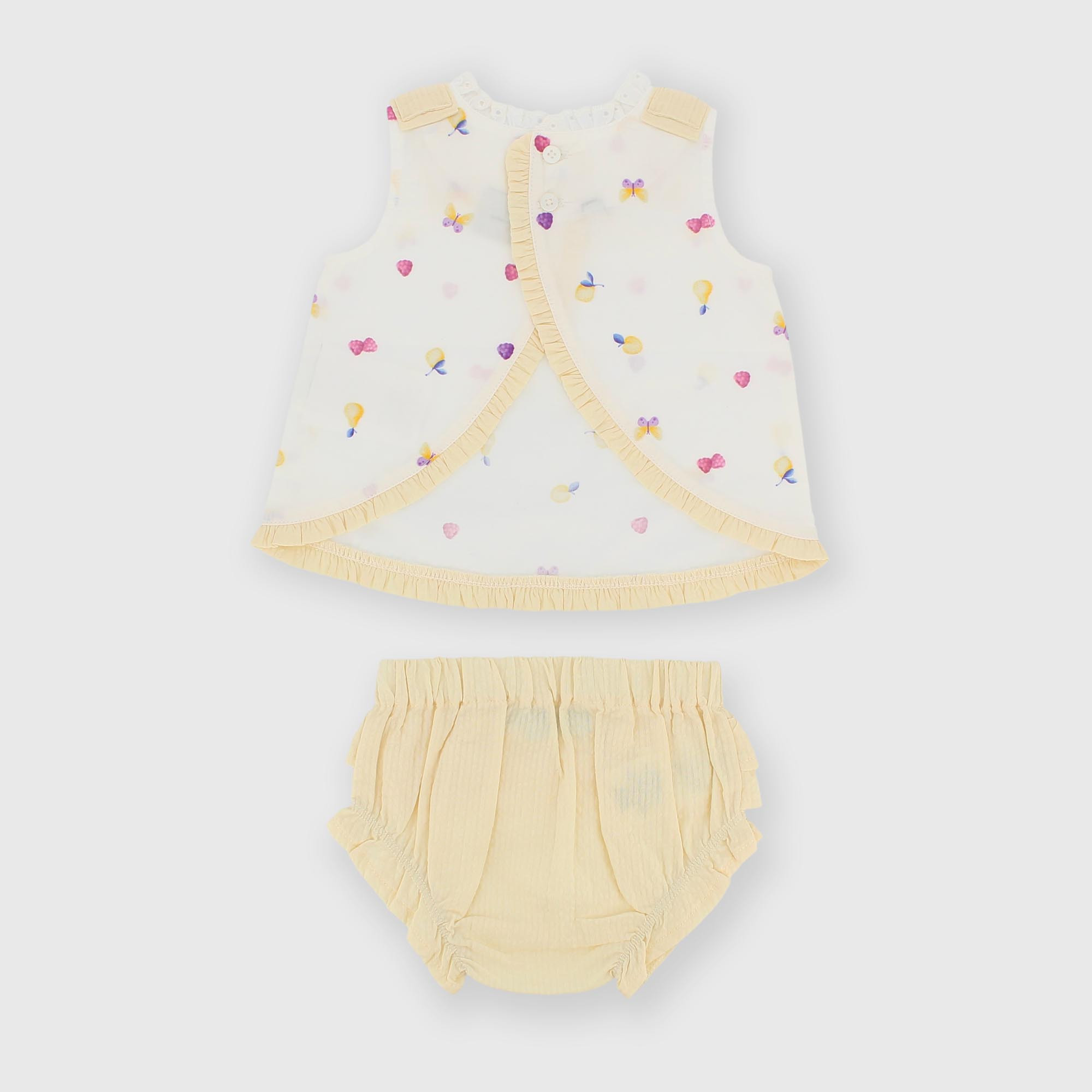 Ensemble composé de deux pièces. Blouse à col rond, emmanchures. Petits nœuds appliqués sur les épaules. Boutons au dos. Imprimé fruits sur toute la surface. Culotte avec taille élastiquée et volants au dos.