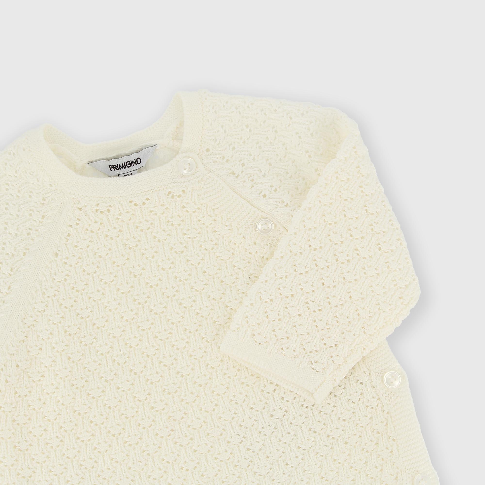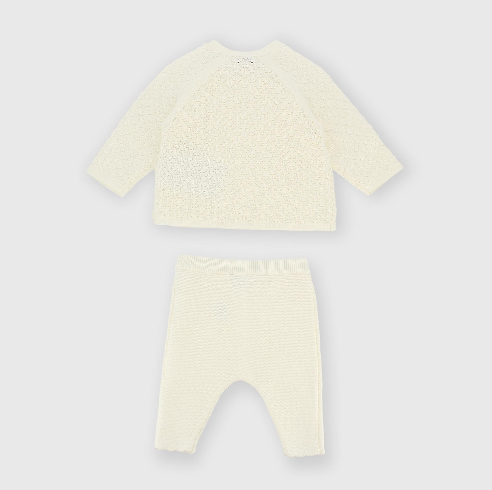 Ensemble tricot en coton doux composé de deux pièces. Pull avec motif ajouré, à manches longues. Fermeture à bouton genre kimono. Pantalon avec taille élastique.