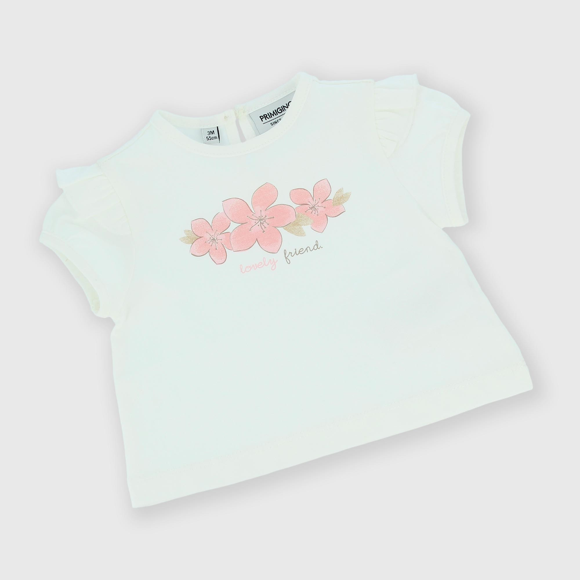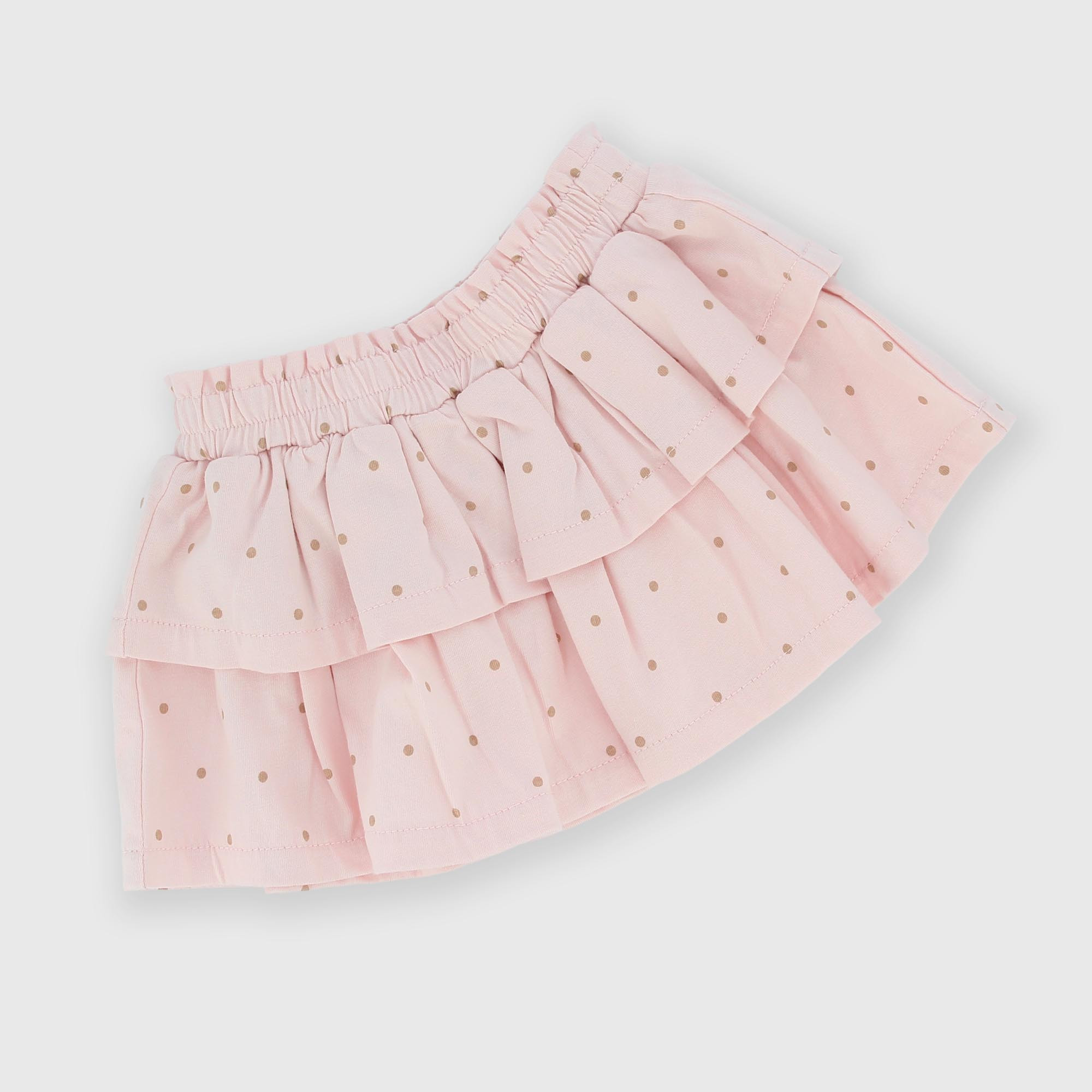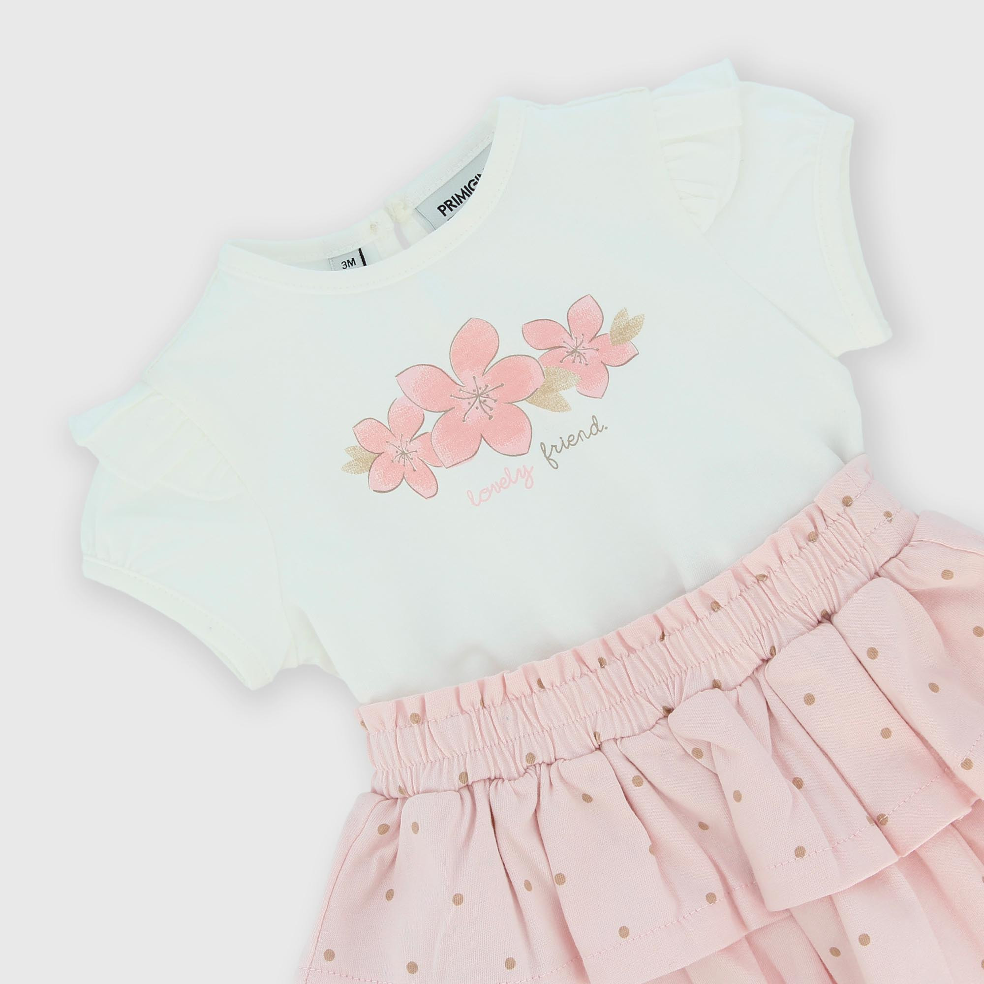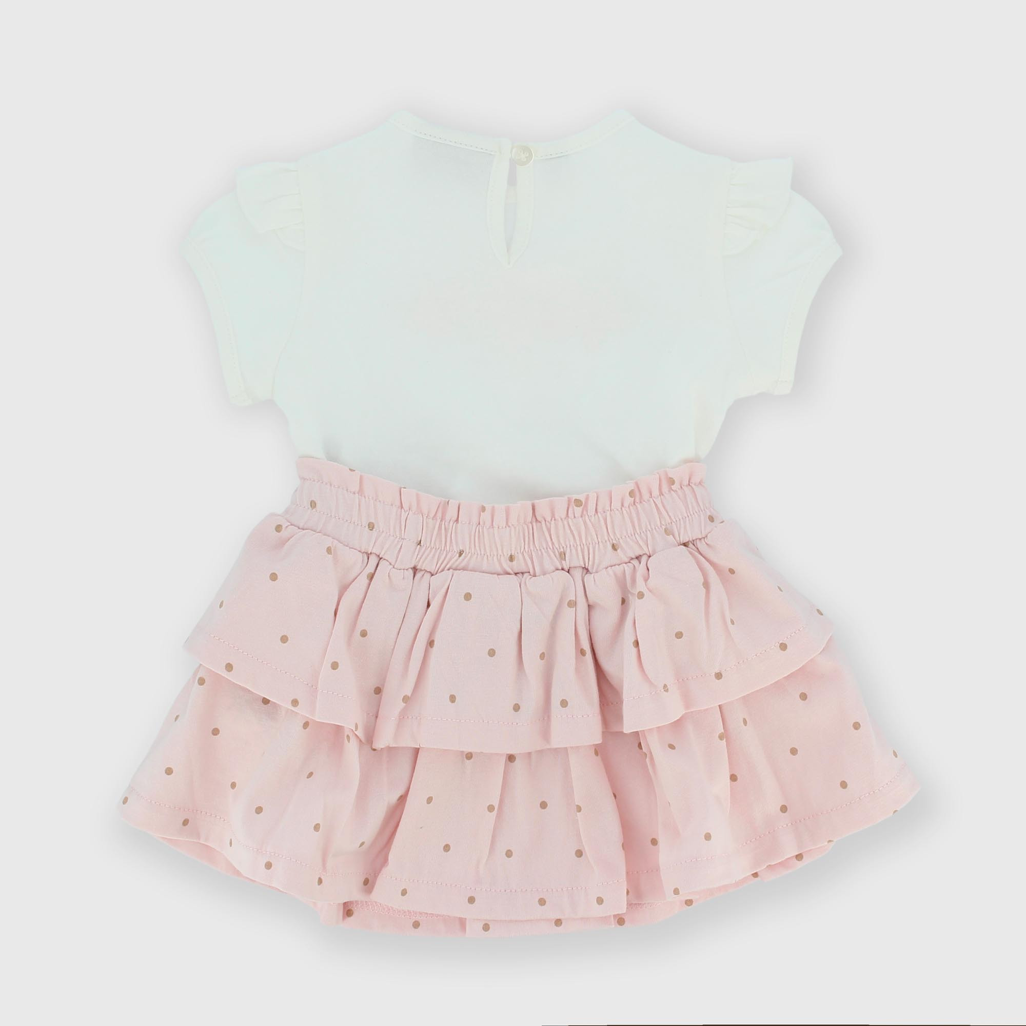Complet en Jersey composé de deux pièces. Pull col-rond à manches courtes. Volants appliqués sur les épaules et imprimé devant. Fermeture avec bouton derrière. Pantalon à volant avec taille élastique. Imprimé pois all-over.