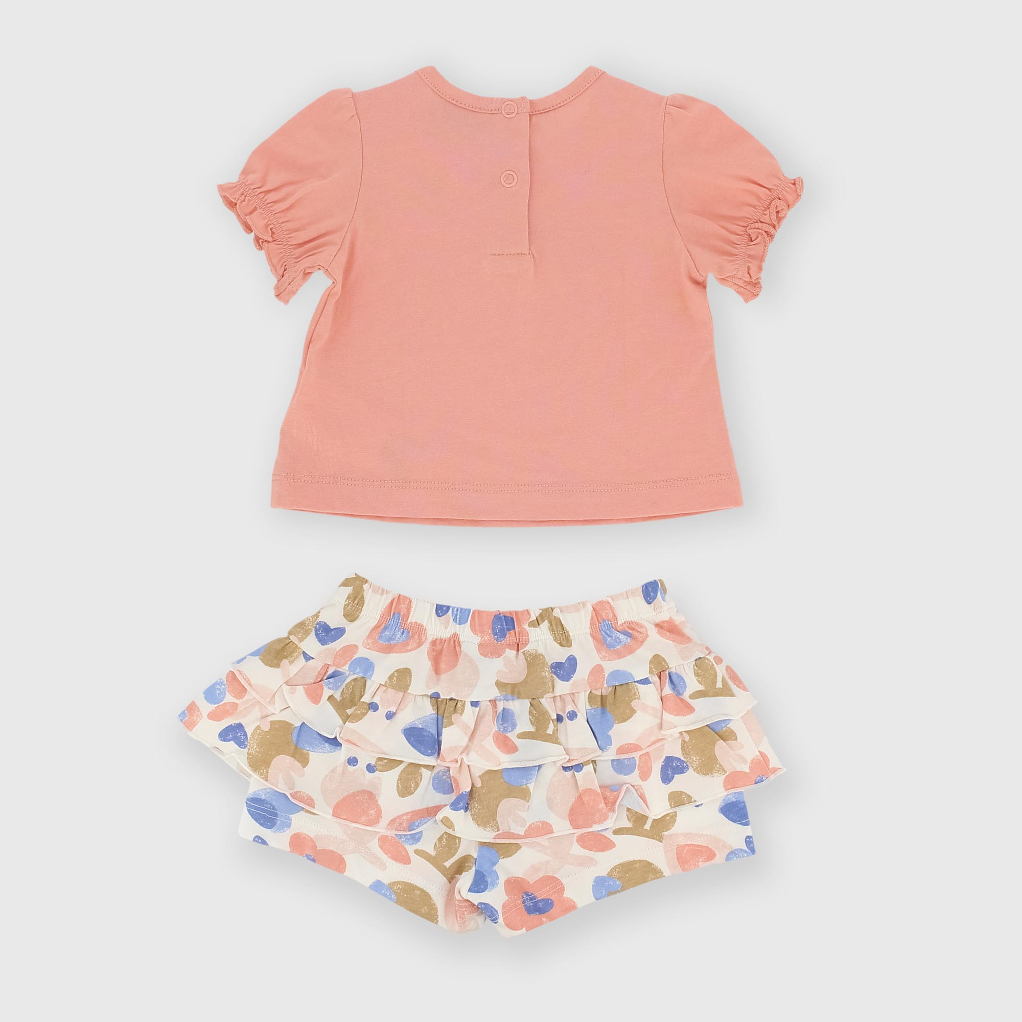 Ensemble en jersey composé de deux pièces. T-shirt à col rond et manches courtes. Fermeture arrière avec boutons-pression. Impression et broderie sur le devant. Short avec taille élastique et volants appliqués. Imprimé sur l'ensemble.